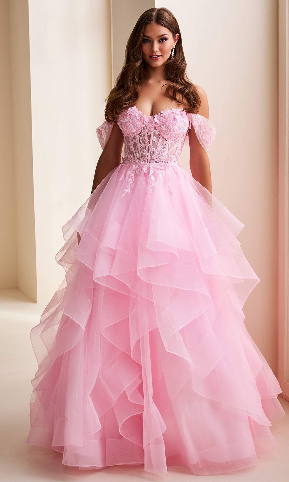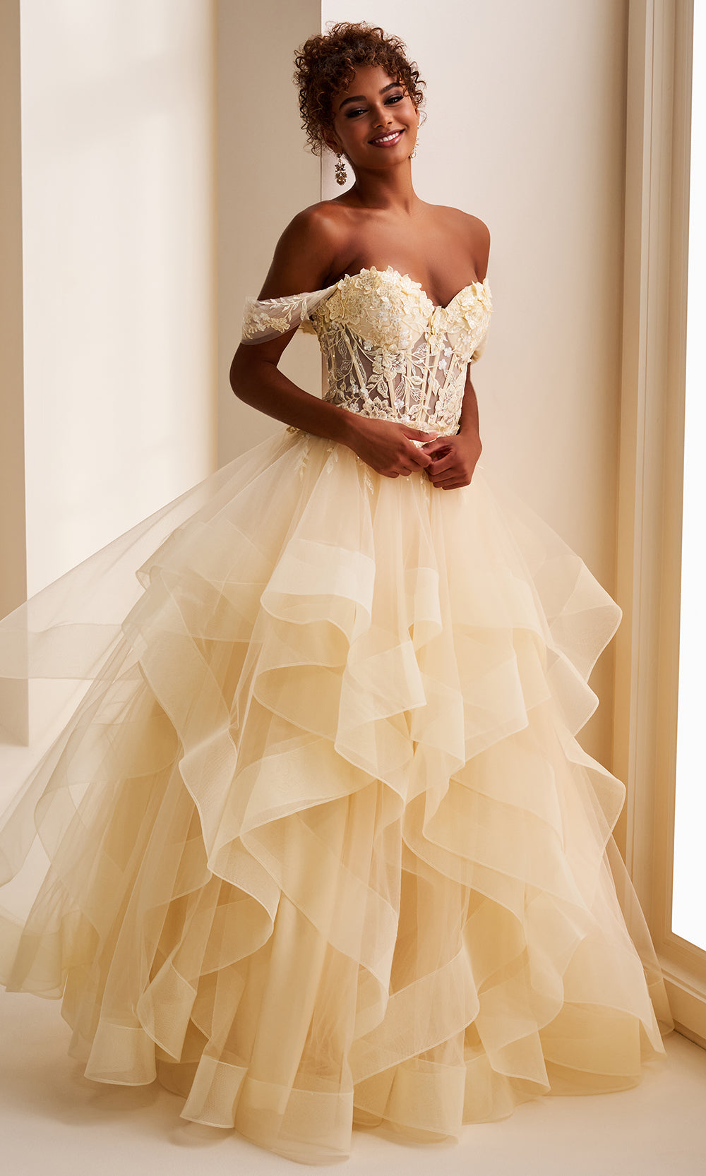 | Details: | 3D Floral Accents, Lace Applique, Sequin, Corset Bodice, Lace-Up Back, Detachable Off-Shoulder Straps, Detachable Ruffle Overskirt |