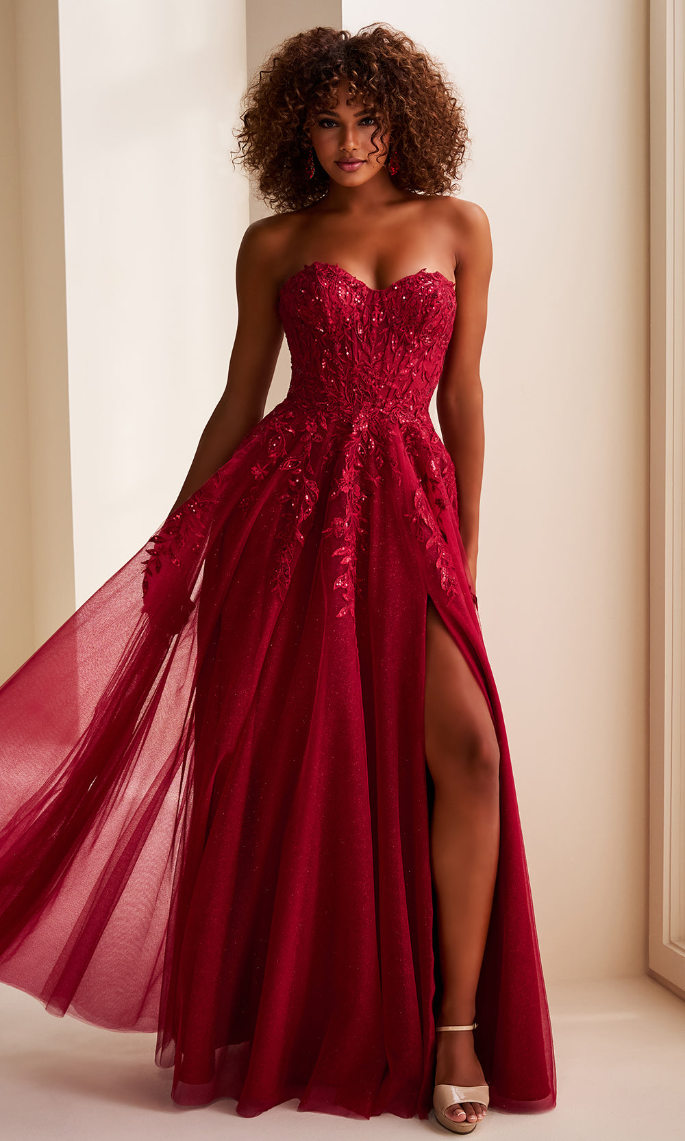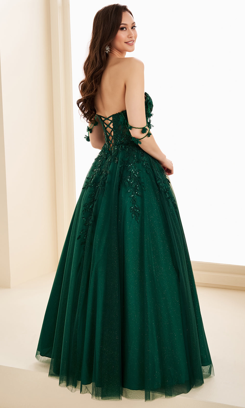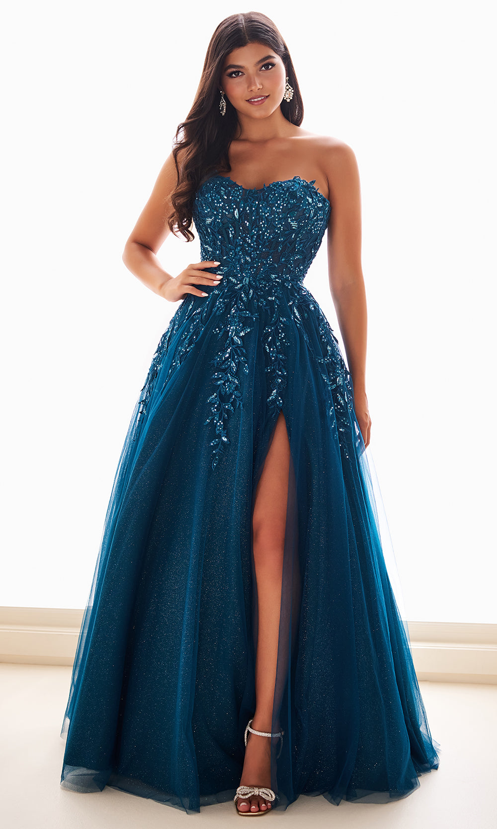 All eyes will be drawn to Ellie Wilde EW37208, a design made for those who embody poise and individuality. This tulle gown features an embroidered lace bodice with sparkle beading and sequin that catches the light with every move. The corset-style waistline enhances structure, while the glitter tulle A-line skirt flows freely, opening into a slit that reveals graceful confidence. Finished with a gentle train, sweetheart neckline and detachable off-shoulder straps, this piece captures romance with a modern edge. Ellie Wilde EW37208 brings glamour to life in every elegant detail. Models are wearing Emerald, Royal Blue, Teal, and Wine colors.