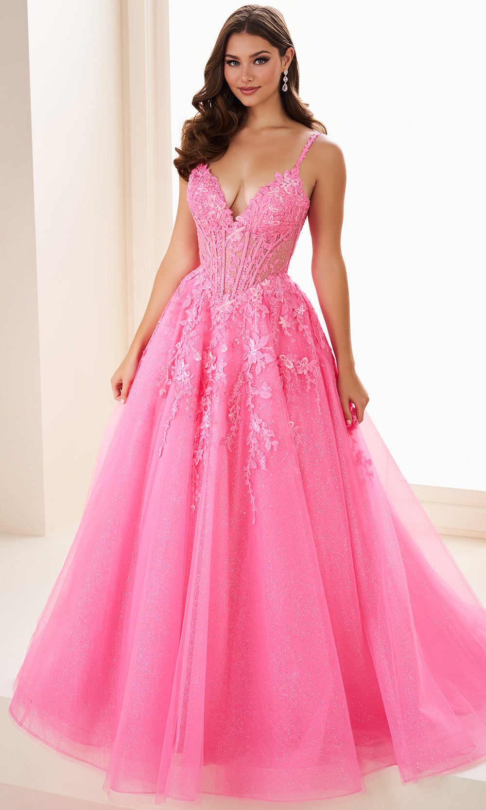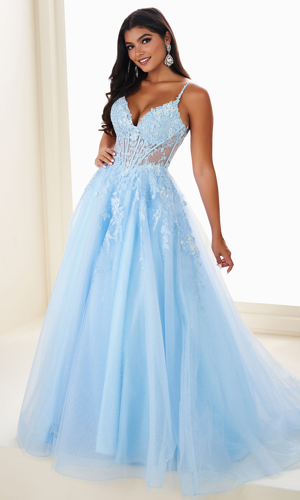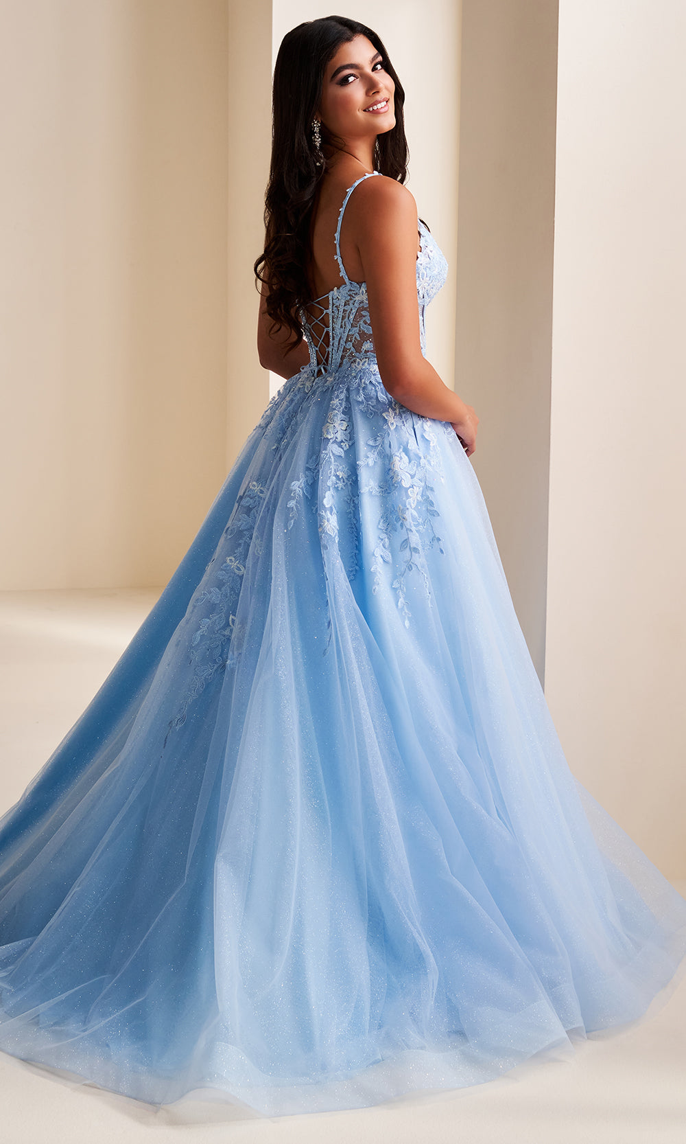 A radiant and captivating presence defines Ellie Wilde EW37218 masterpiece. The deep v-neckline draws attention to the corset-style bodice, offering shape and structure. Floral lace embroidery and beading cascades along the tulle layers, adding dimension and subtle sparkle. Spaghetti straps lend balance to the voluminous A-line silhouette, which flows softly into a sweep train. Every detail reflects thoughtful craftsmanship designed to enhance natural beauty. Ellie Wilde EW37218 blends romantic charm with modern flair for an unforgettable statement look. Models are wearing Lt.Blue, and Barbie Pink colors.