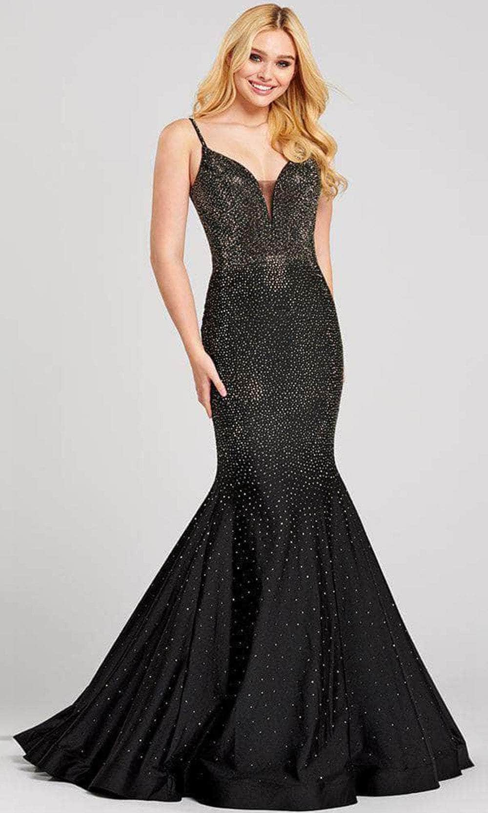 This form-fitting ensemble features a sleeveless fitted bodice festooned with heat stone embellishments crowned with a plunging neckline beautifully accentuated with a sheer inset framed together with spaghetti straps that leads to a stunning back as it showcases a back cut out that will ensure a comfortable fit. The skirt parades in a sheath silhouette that ends with a horsehair hem and a sweep train. Models are wearing Jade, Lilac, Ruby, English Rose, Royal, Blue, Black, Hunter Green, Powder Blue, Navy Blue colors.