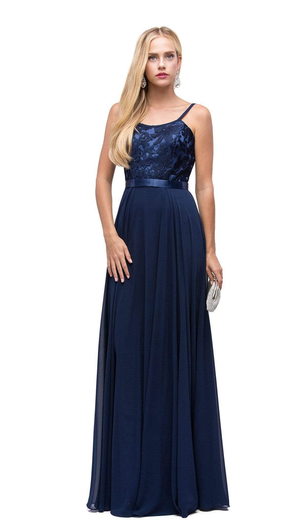 Make yourself into a vision of loveliness in this spectacular gown. The sleeveless bodice boasts a scoop neckline and spaghetti straps that leads to a glamorous open back. The embroidered bodice is matched with a satin belt that cascades to the chiffon skirt. This A-Line ensemble flows with beautiful pleats to a full length hem. The open back is enclosed with a center zipper closure. This design is undeniably another great creation! Model is wearing Blue color.