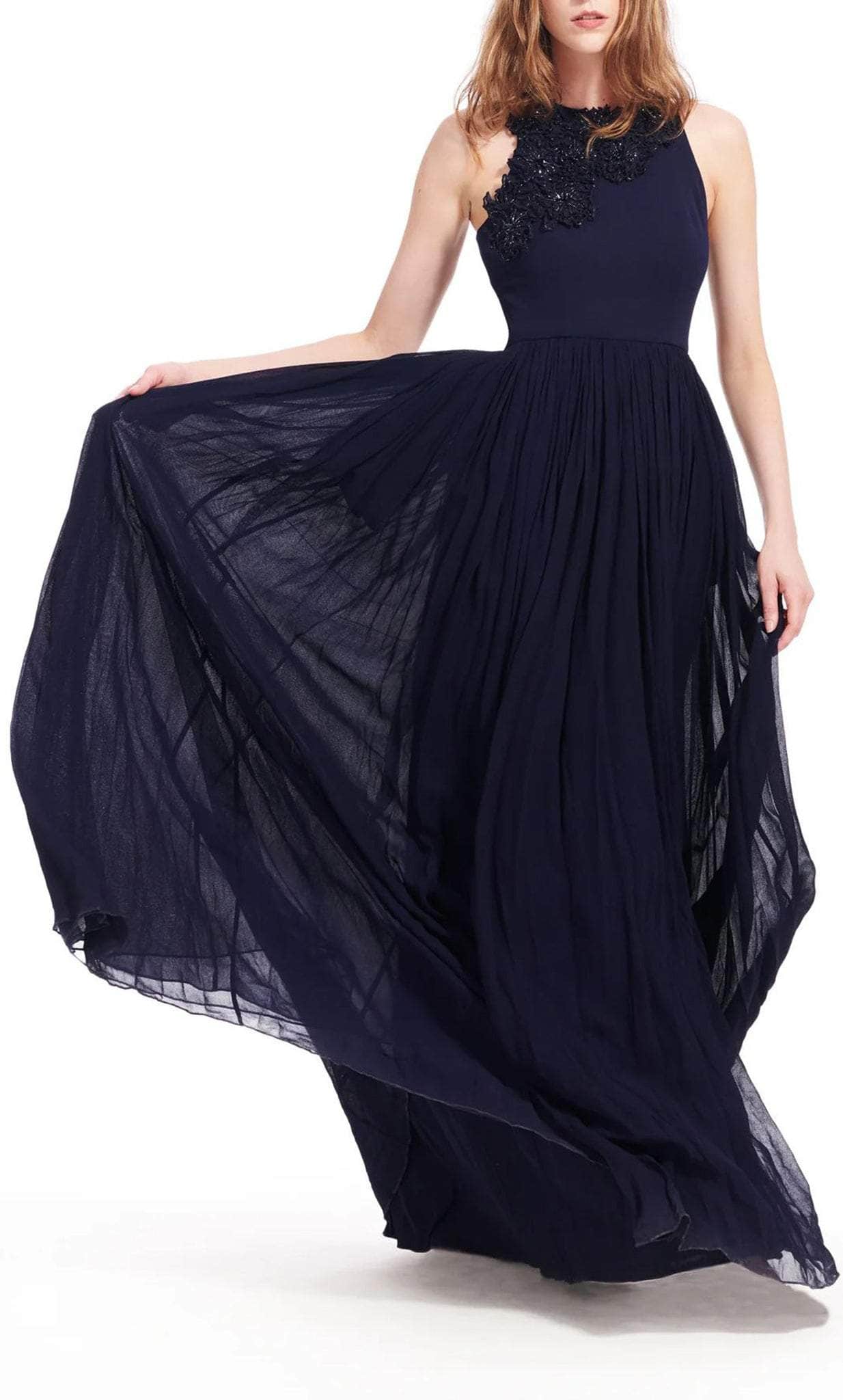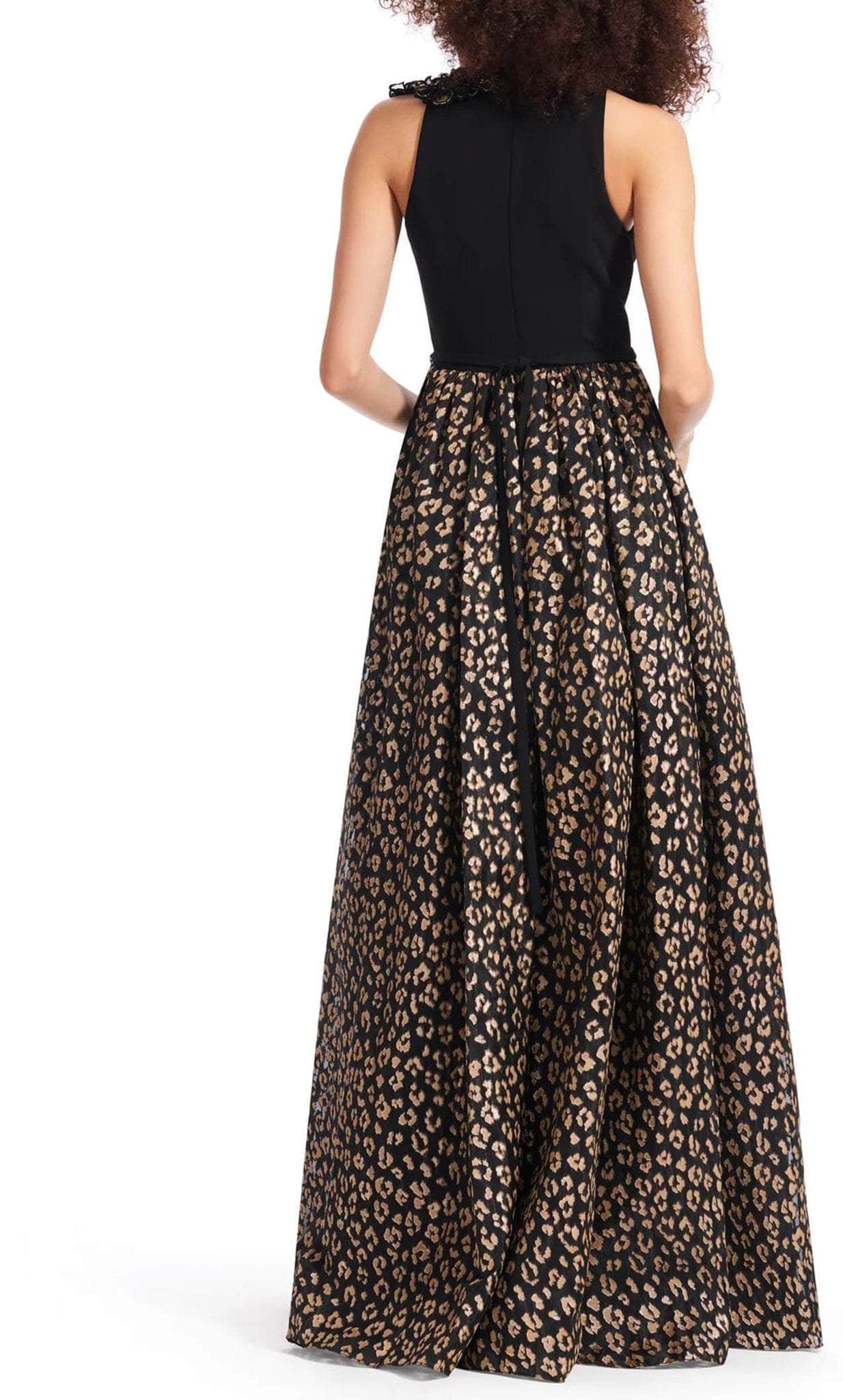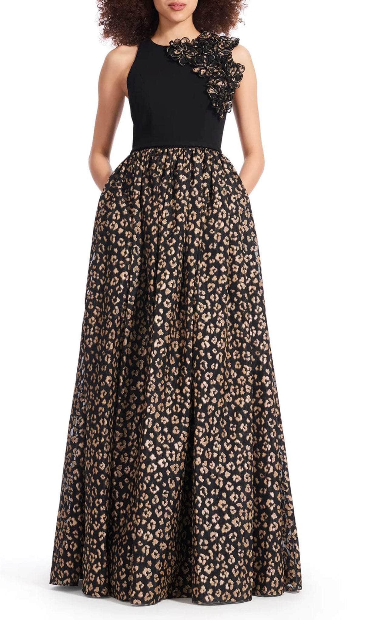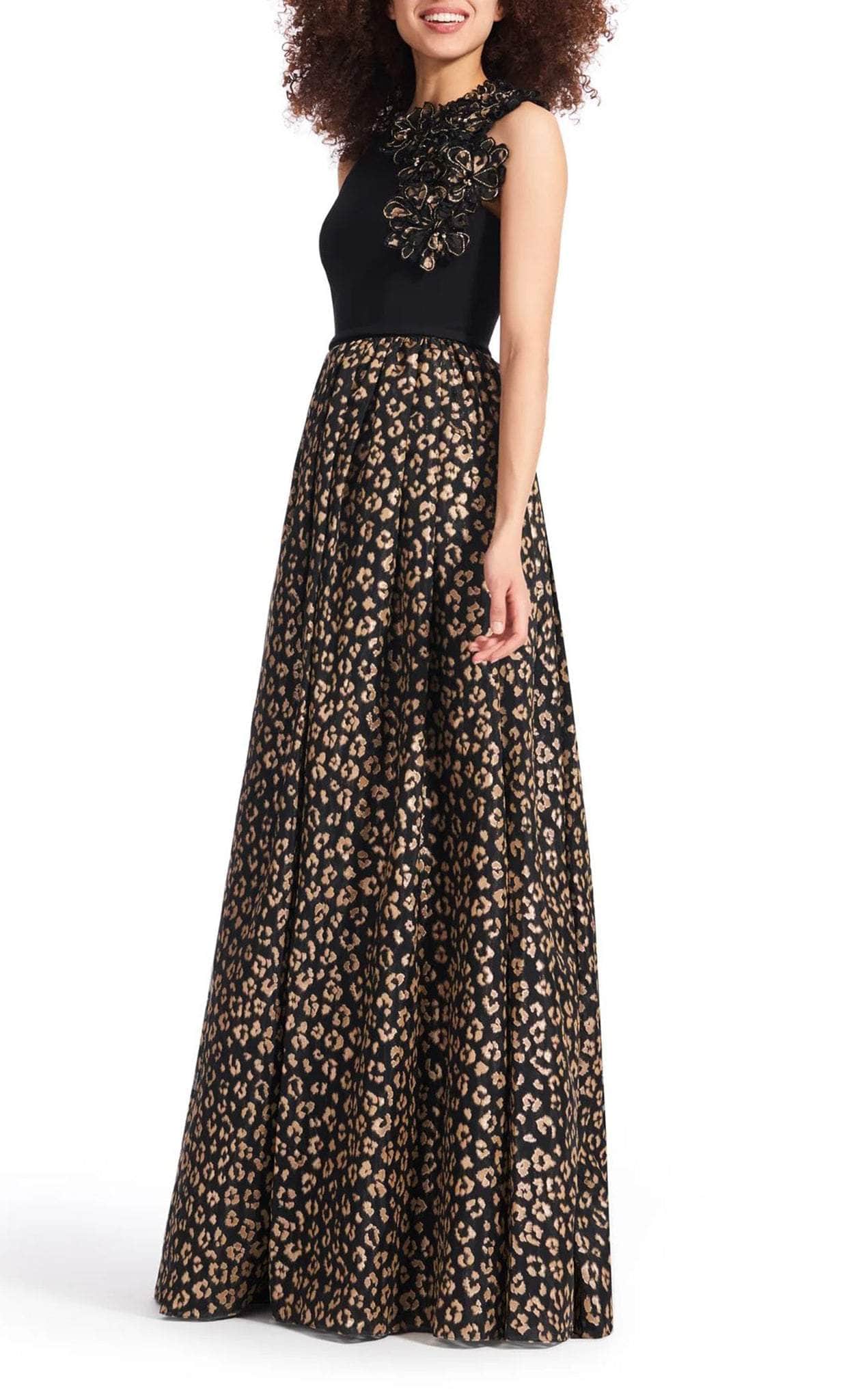 You are more than gorgeous when you wear this unbeatable evening dress from Emily Shalant 17D 0035. The lengthy jacquard fabric, bead-embroidered flower details, and asymmetrical cut give off an air of opulence and sophistication, making this the ideal dress for a formal event. The dress's back zipper guarantees a smooth fit and emphasizes its contemporary style, and the A-line cut is figure flattering, and finished by a voluminous sweep train. Look colorful and lively in this fabulous Emily Shalant 17D 0035. Model is wearing Black Gold and Navy colors.