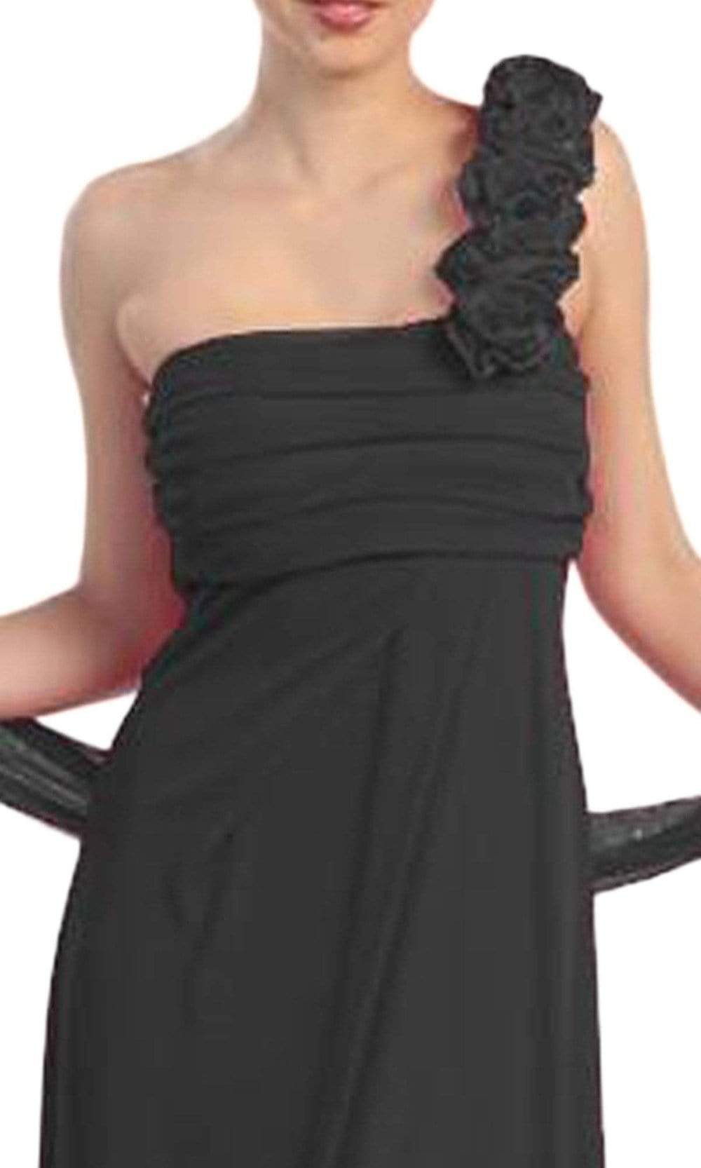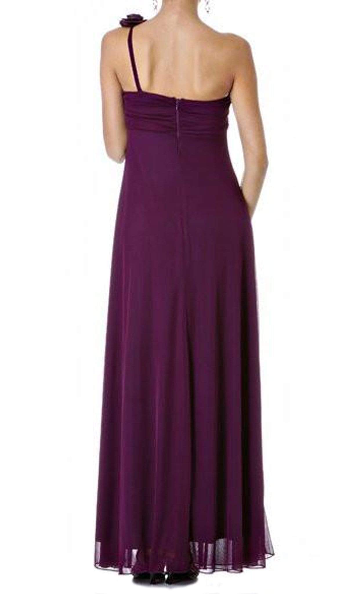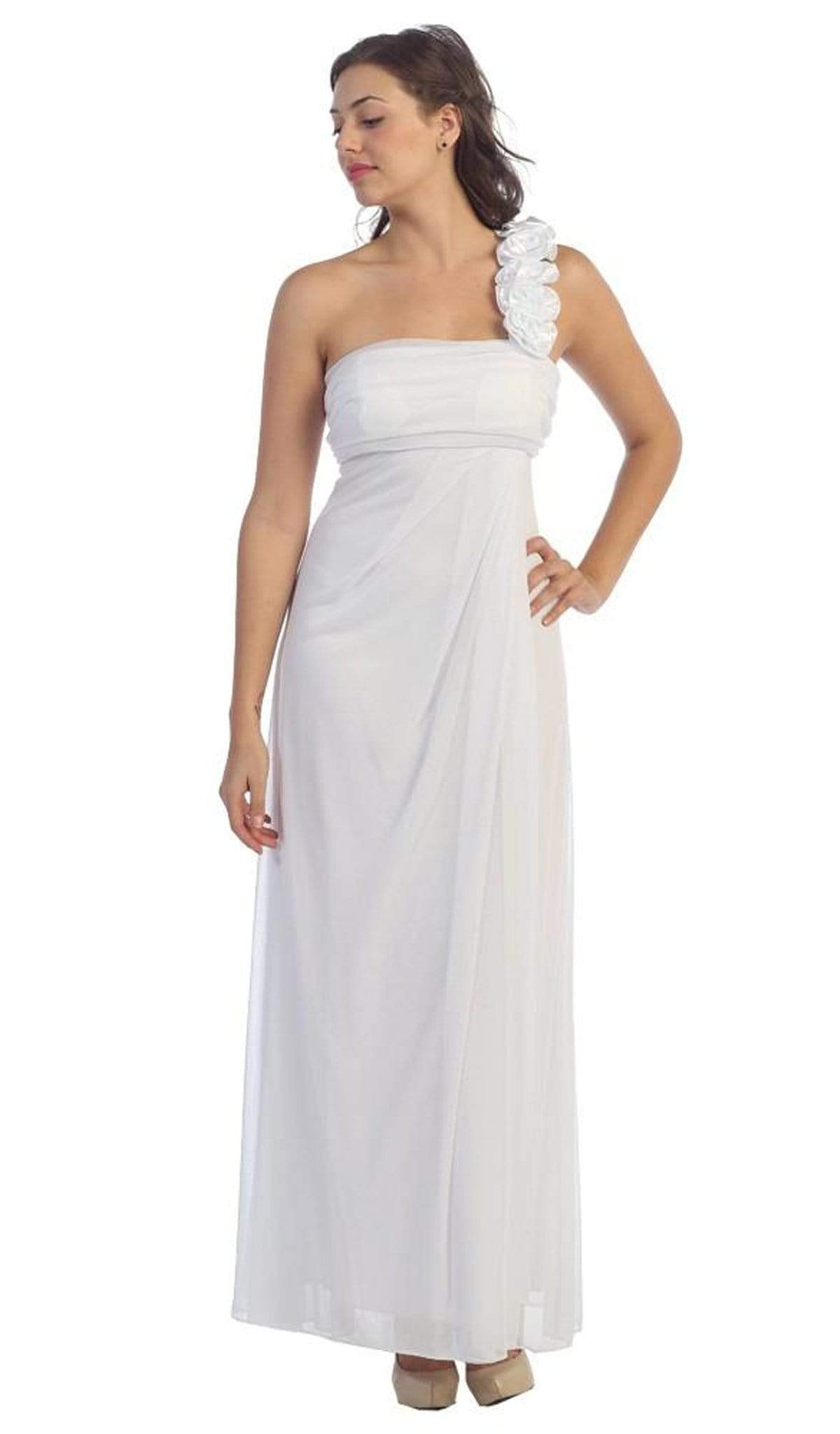 There is no better way to pair sophisticated style with glamour than with this Eureka Fashions 1701 long formal dress. This Chiffon matte jersey ensemble features a rosette ornate one shoulder strap, pleated bustier and empire waist. The straight across back is mid open and is enclosed with a center zipper. Elegance is highlighted with its column silhouette skirt that finishes at floor length. Envision an ideal evening in this fabulous creation from Eureka Fashions.