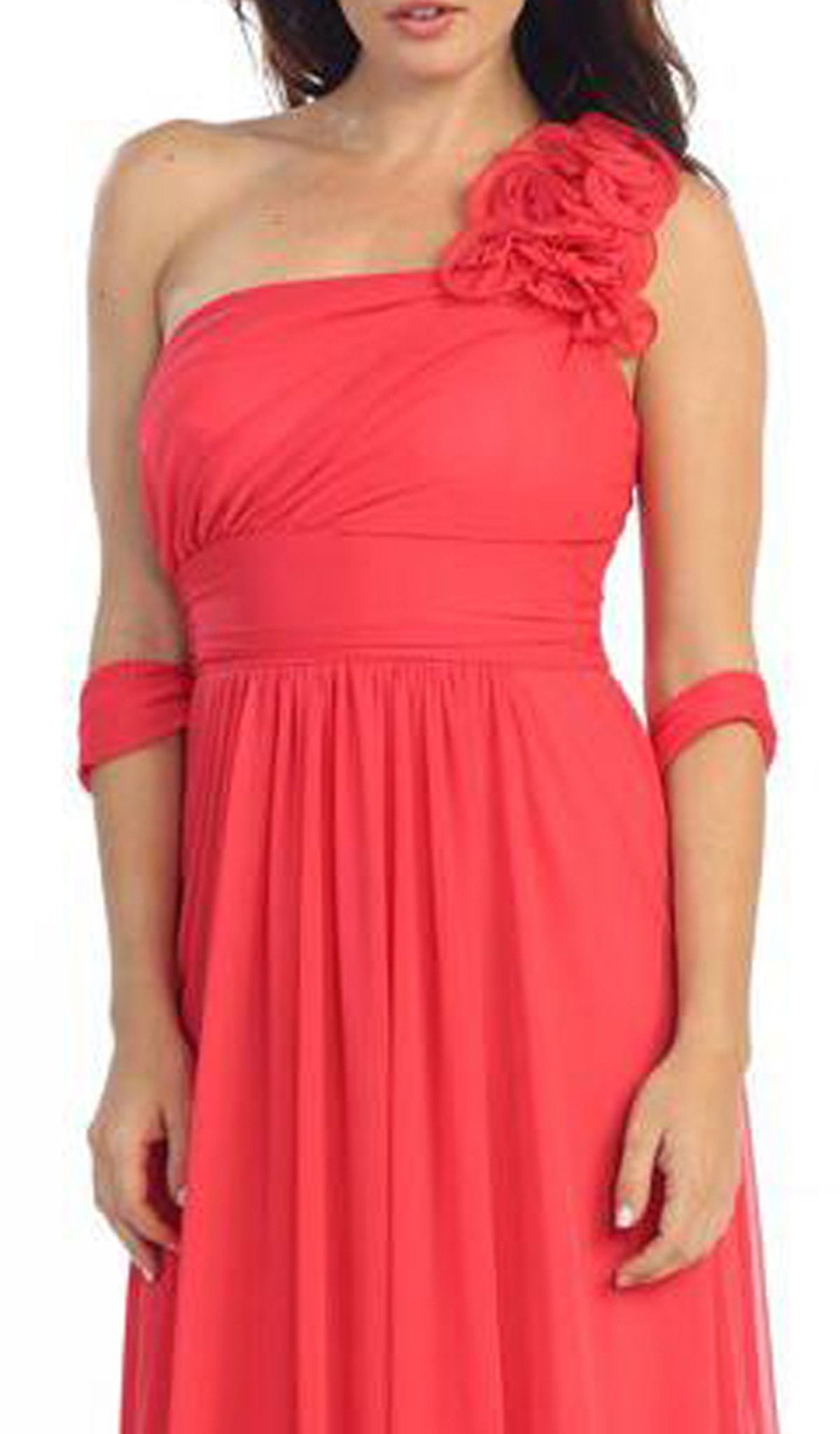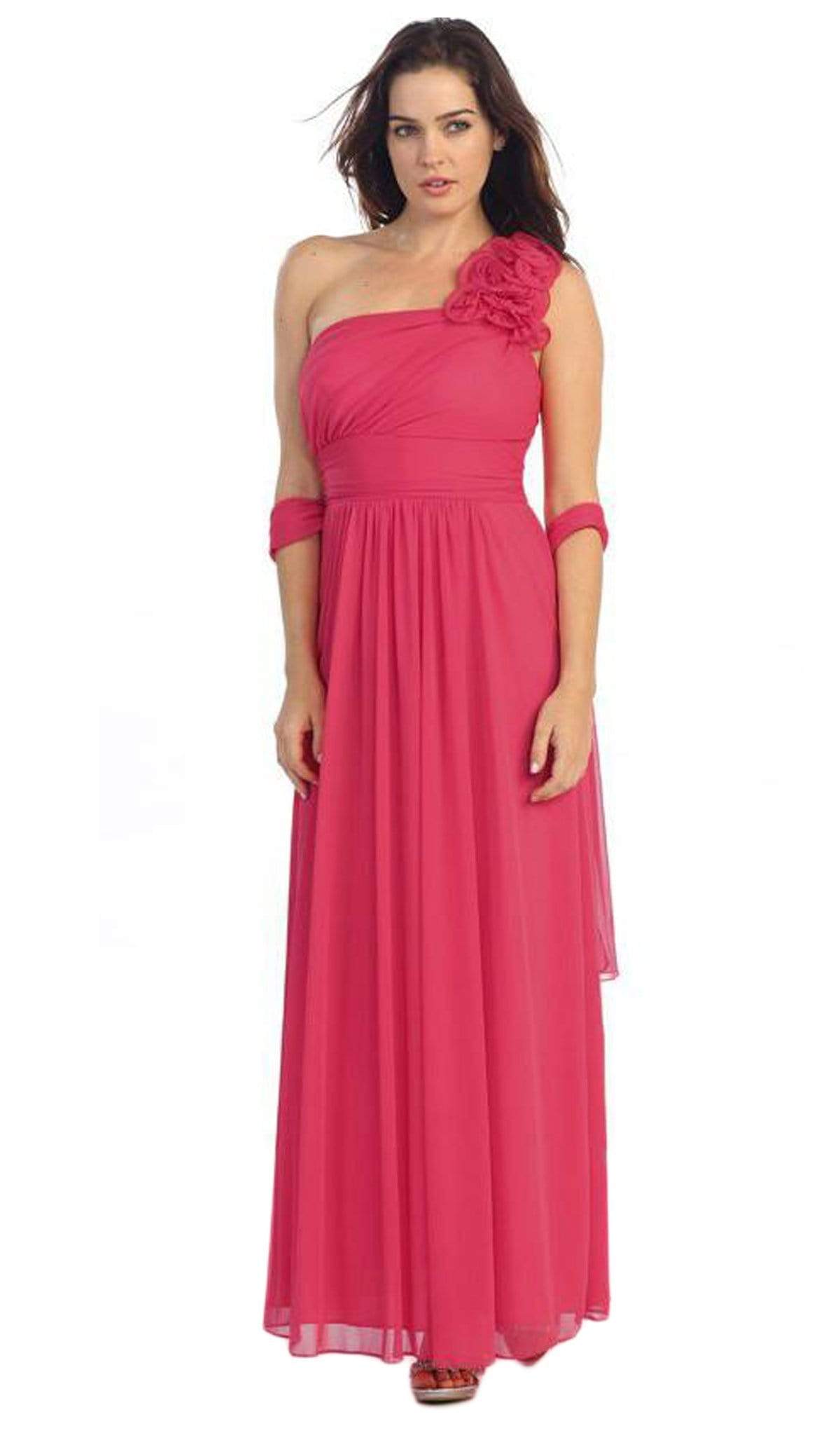 Inspire people to give you that lingering second look wearing this gorgeous Eureka Fashion 2005 creation. Beautifully draped at the bust as a stunning ruffle accent on one shoulder, this ensemble flourishes an asymmetrical neckline and a matching shawl. Nipped with a ruched empire band, the A-line skirt softly waves down to a full-length hemline. Glamour up for the night with such sophistication in this Eureka Fashion masterpiece. Models are wearing the Coral, Fuchsia, red and White colors.