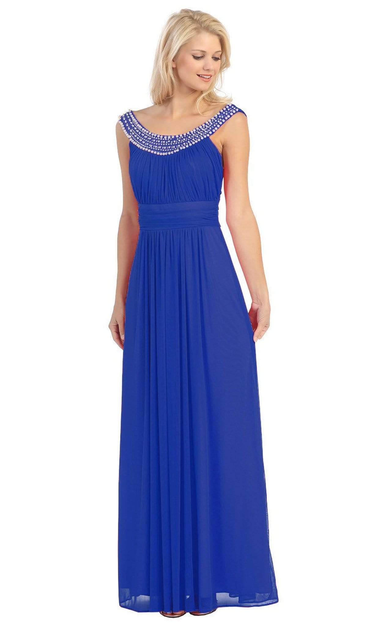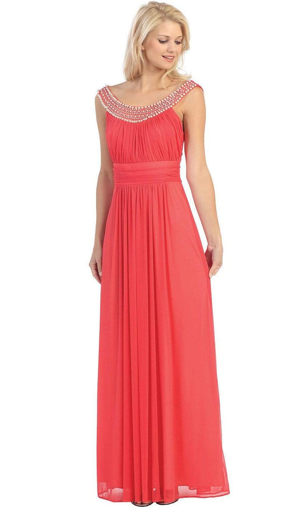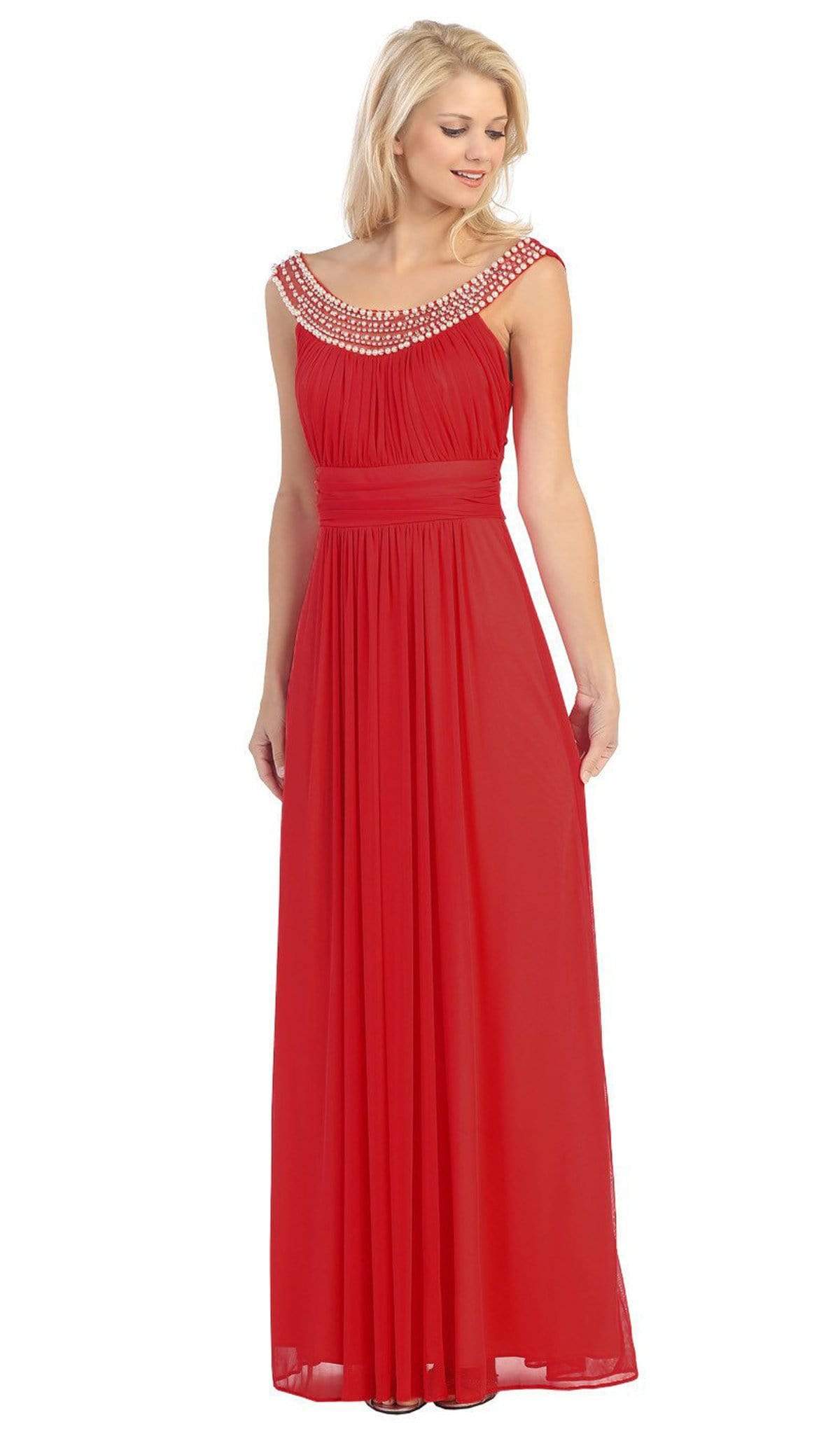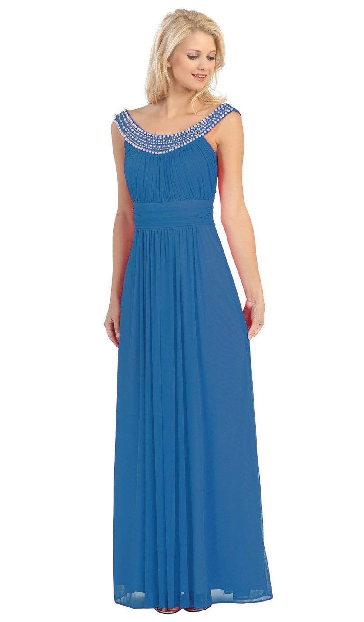 Look flawless with this special occasion gown by Eureka Fashions 2027. This exquisite long chiffon evening gown comes with pearl embroidery on the wide scoop neckline. Ruched details on the bodice and on the waist gives the dress a rich texture as the shirt creates rich dimension at the full length hem. This Eureka Fashions creation definitely parades the elegant and classy style.