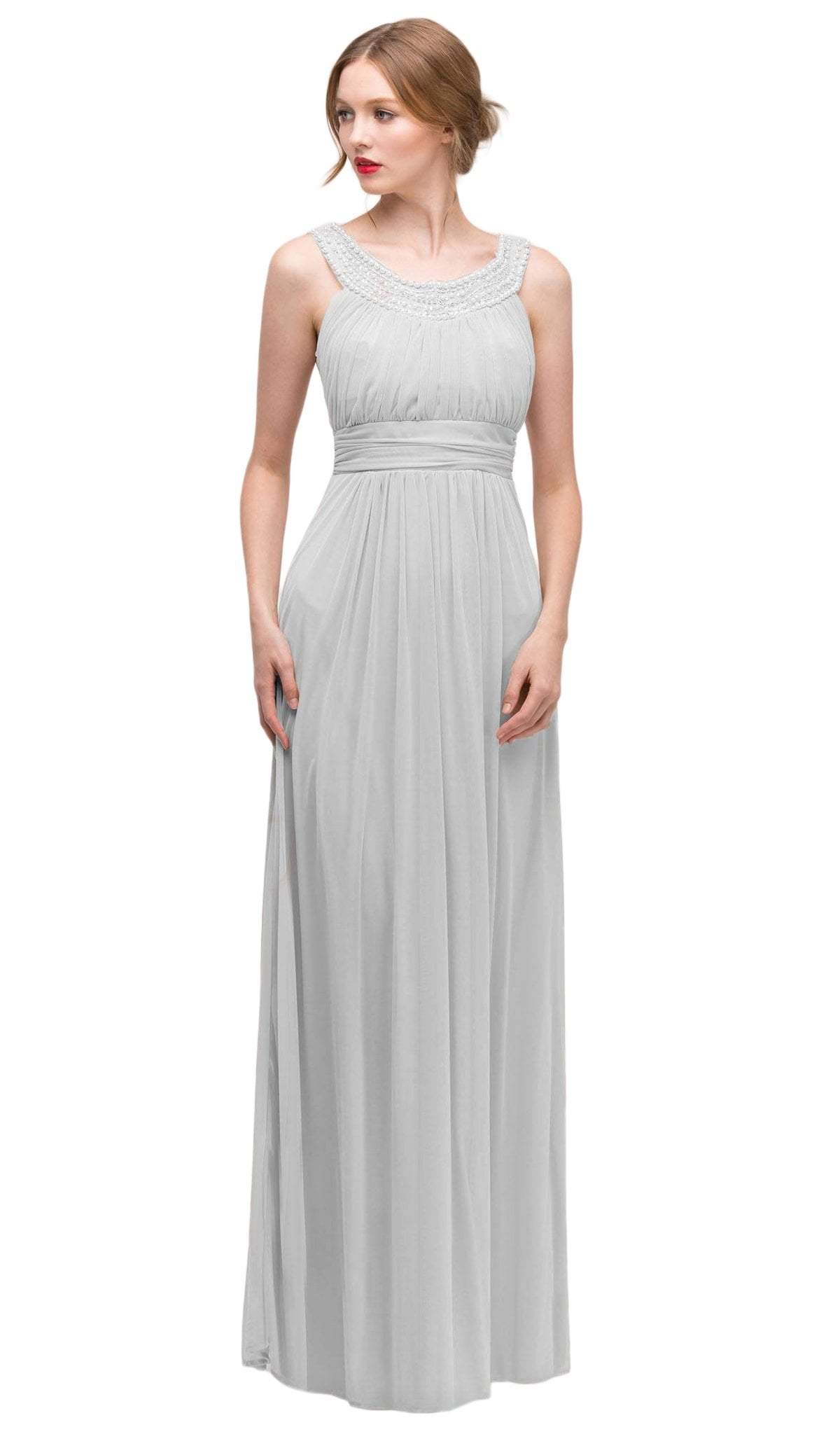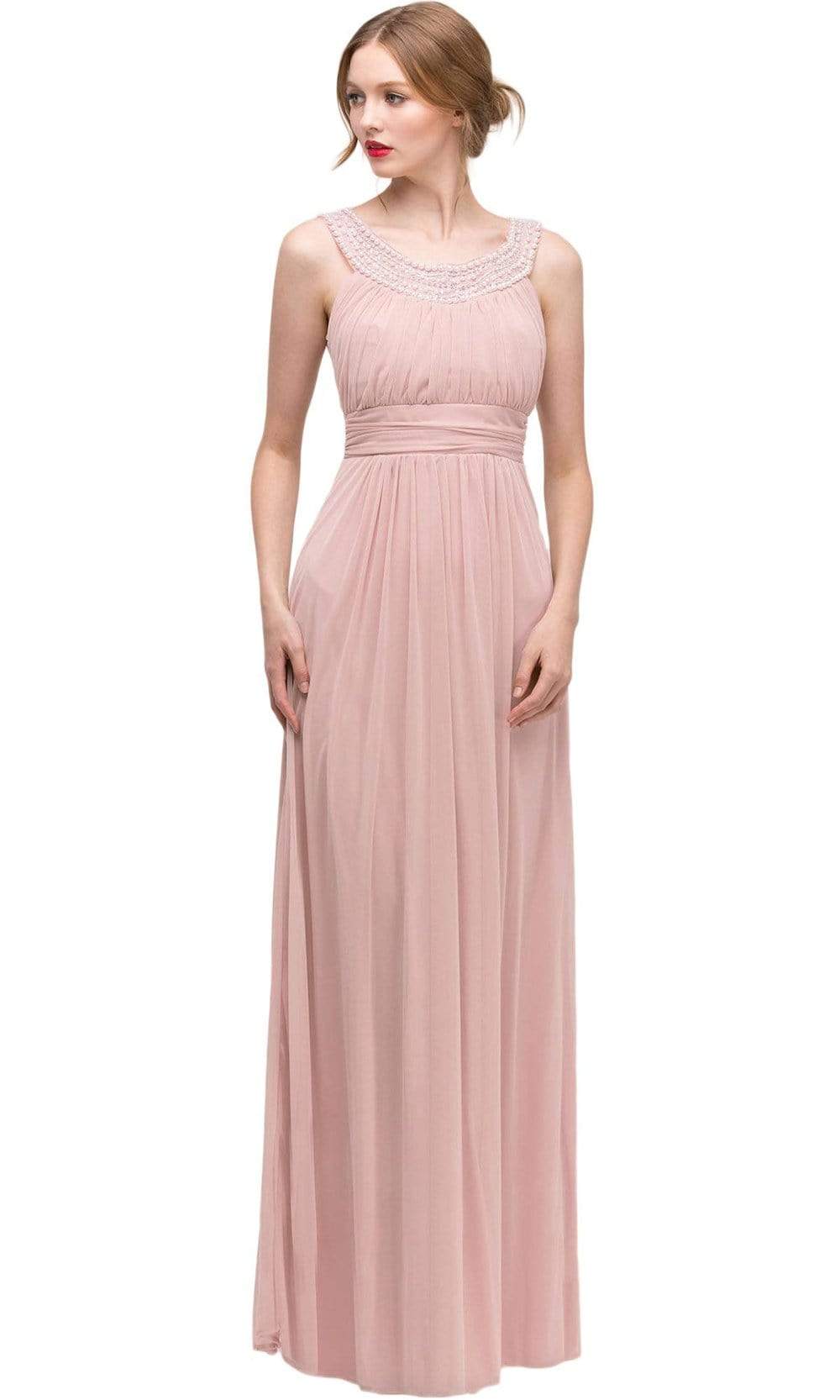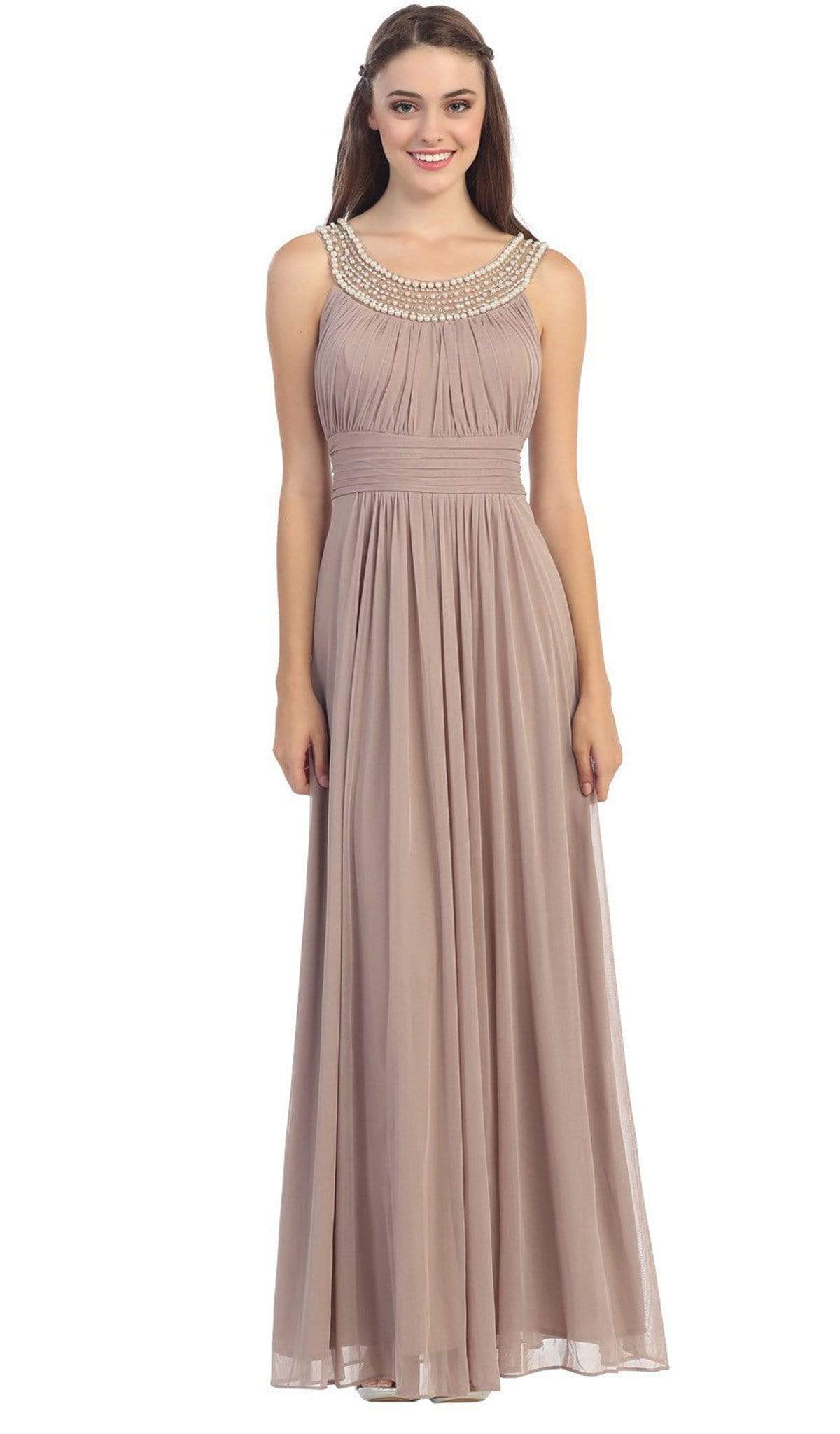 Look flawless with this special occasion gown by Eureka Fashions 2027. This exquisite long chiffon evening gown comes with pearl embroidery on the wide scoop neckline. Ruched details on the bodice and on the waist gives the dress a rich texture as the shirt creates rich dimension at the full length hem. This Eureka Fashions creation definitely parades the elegant and classy style.