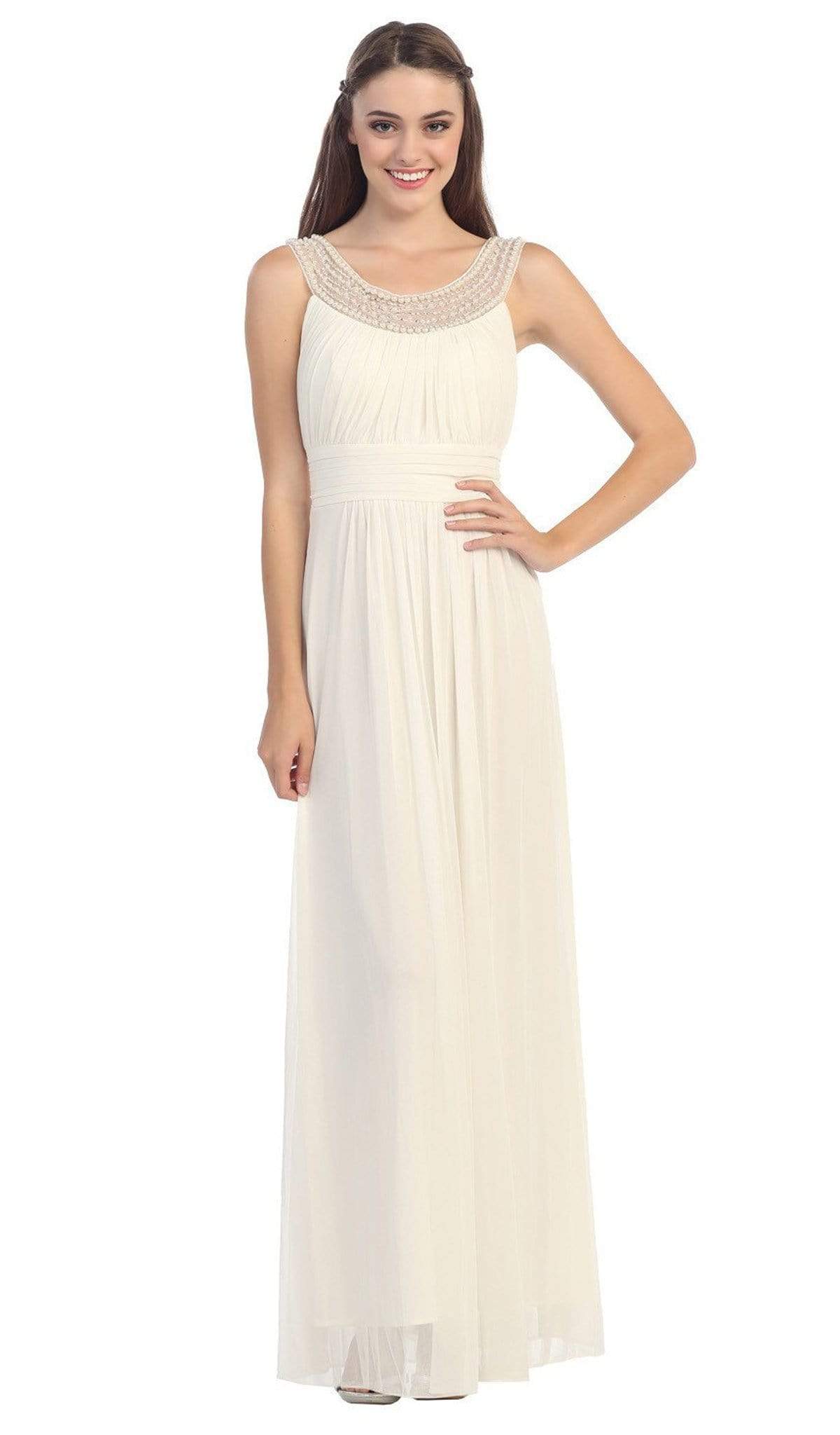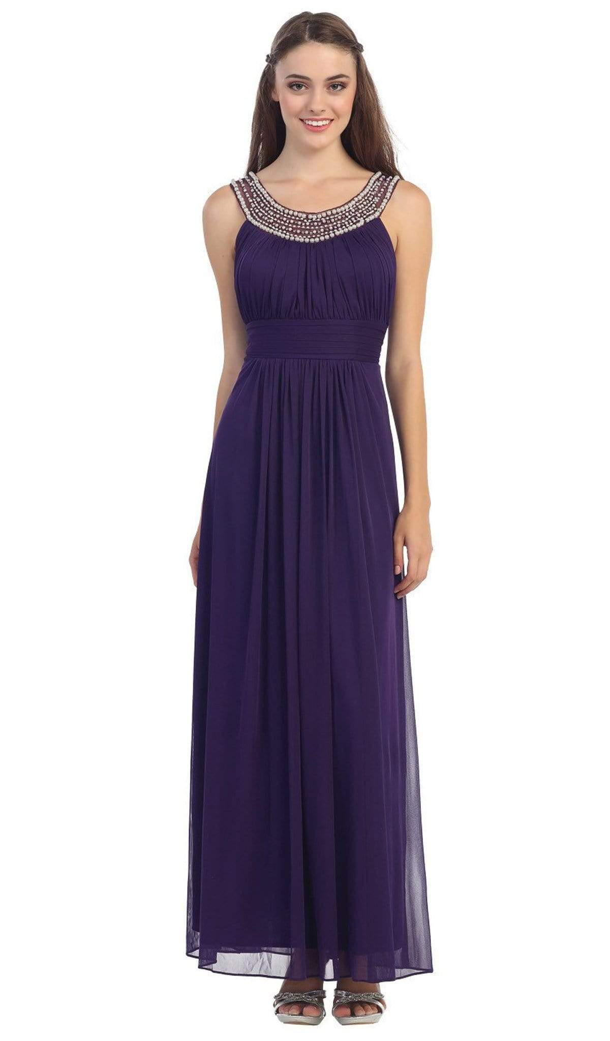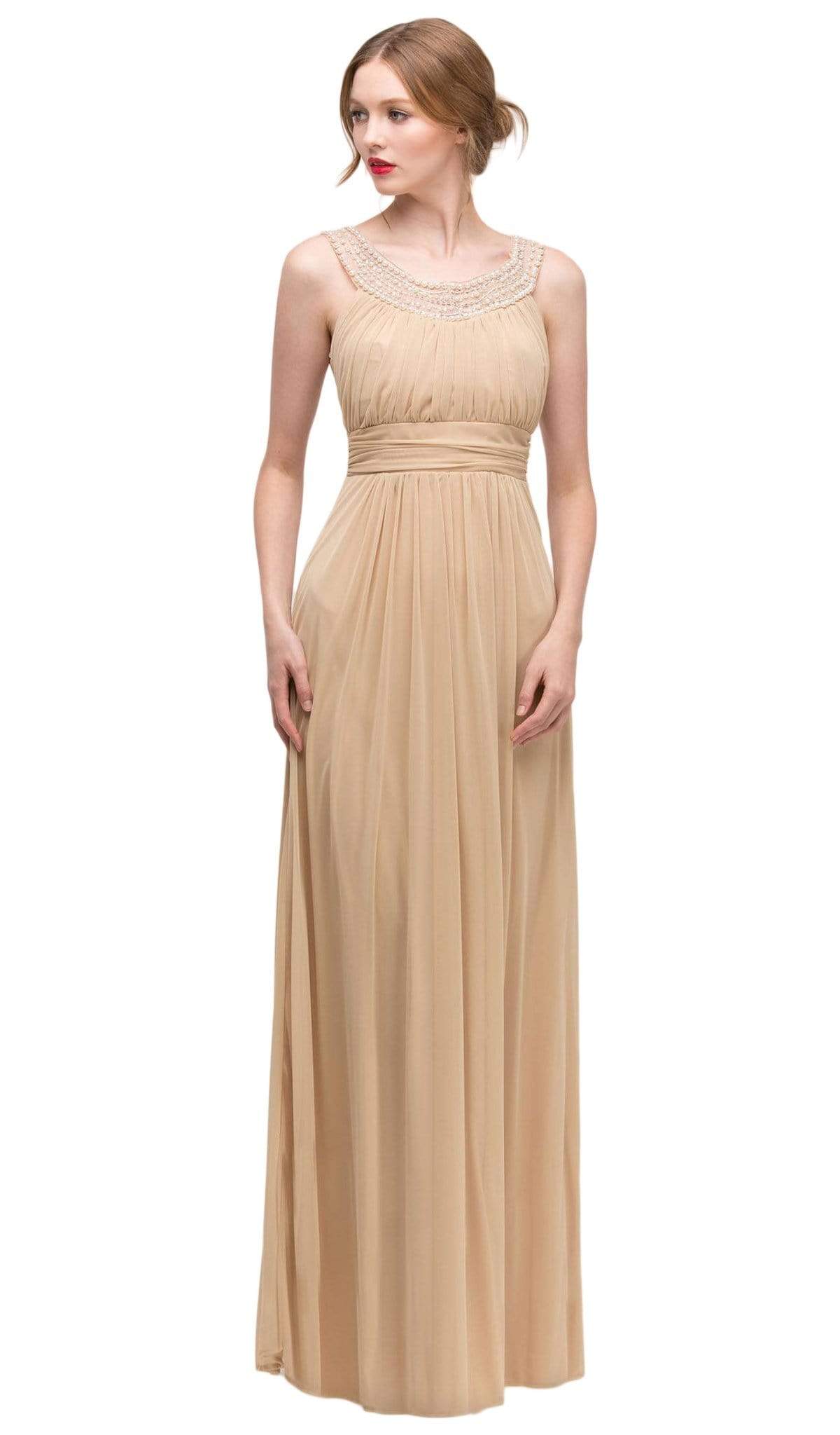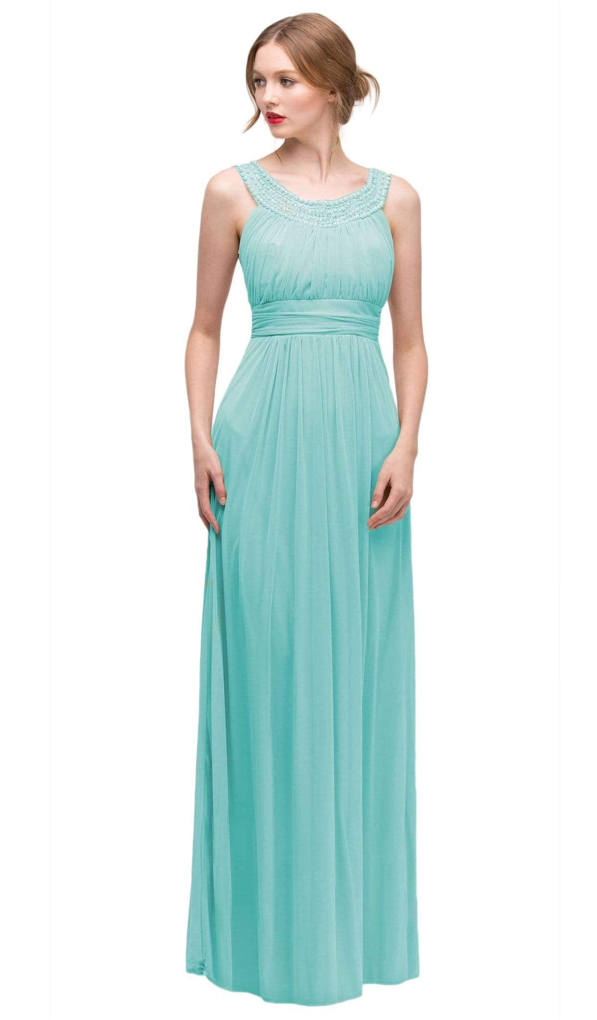 Look flawless with this special occasion gown by Eureka Fashions 2027. This exquisite long chiffon evening gown comes with pearl embroidery on the wide scoop neckline. Ruched details on the bodice and on the waist gives the dress a rich texture as the shirt creates rich dimension at the full length hem. This Eureka Fashions creation definitely parades the elegant and classy style.