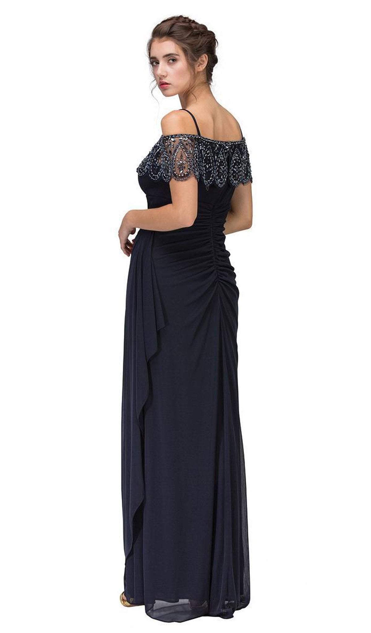 | Details: | Cold shoulder details, Short sleeves, Chiffon, Beading, Ruching, Side draping, Sheath skirt |