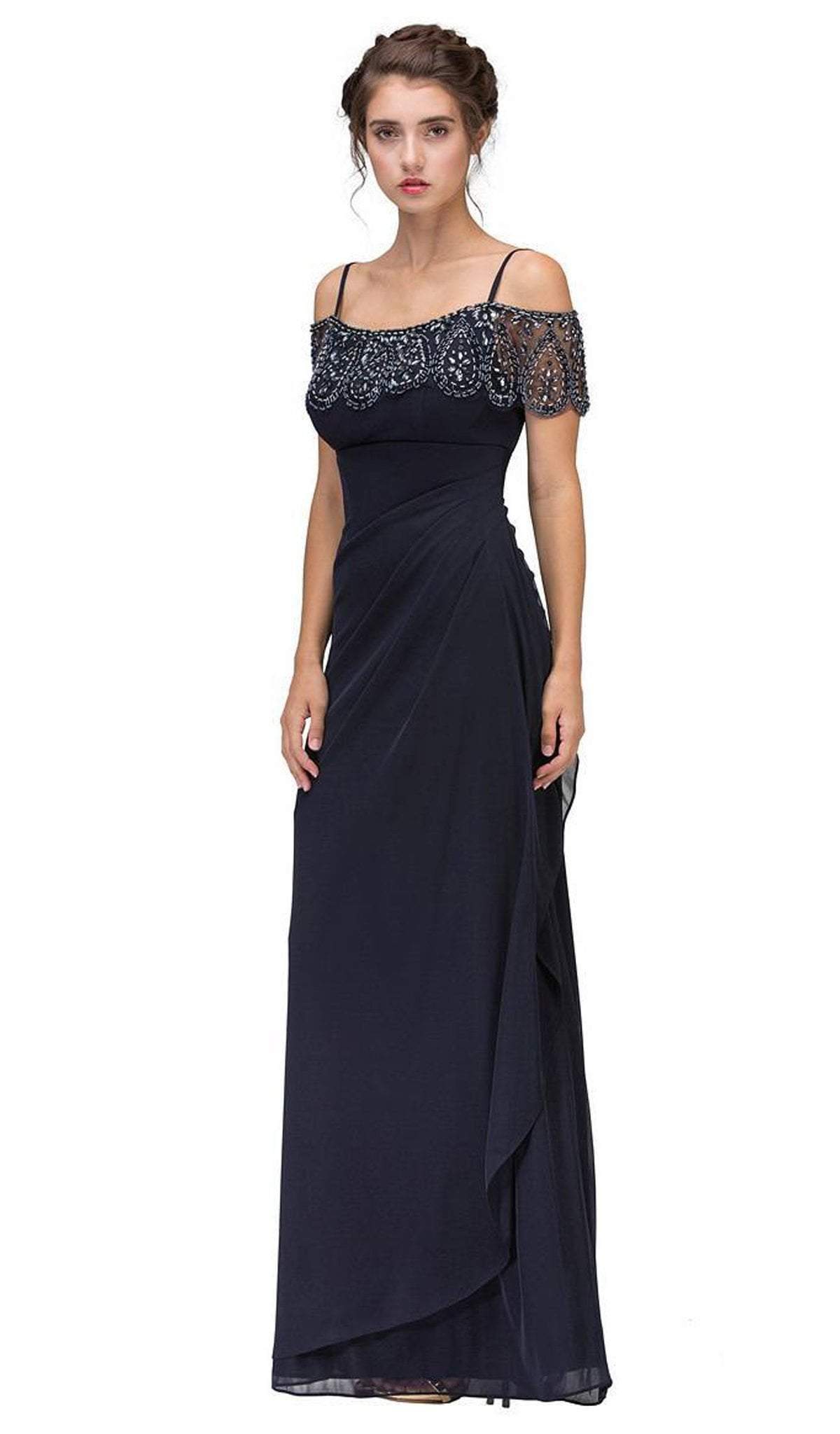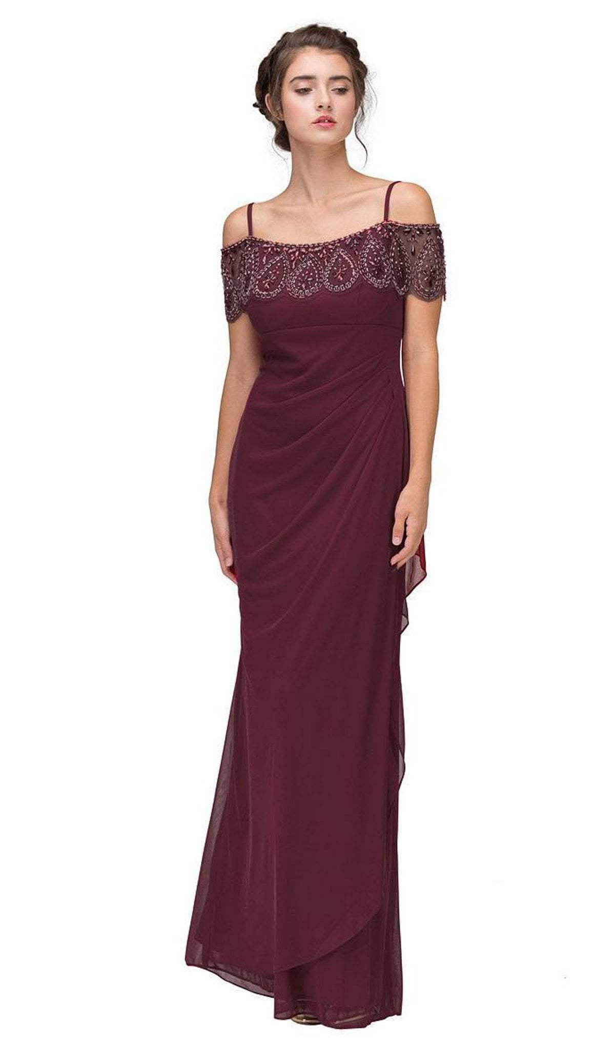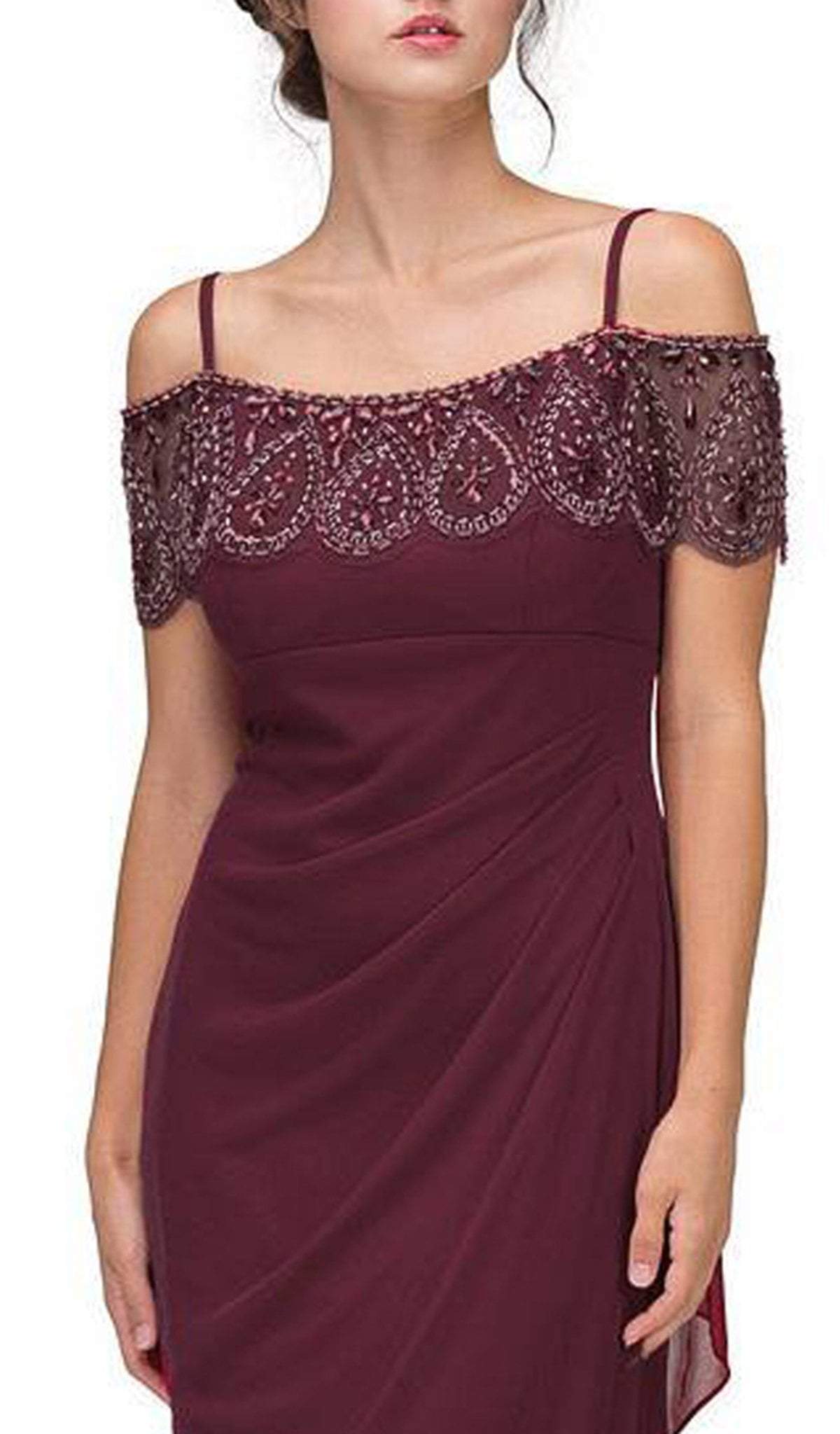 Set a style that would engage everyone in this enchanting evening in this ensemble by Eureka Fashion 3937. This full length dress features an off the shoulder neckline with cold shoulder details and short sleeves. Bead embellishments adorn the neckline while the chiffon skirt is styled with side draping and ruching at the back. Flourish a chic style that will mesmerize the opulent crowd in this gorgeous Eureka Fashion dress.