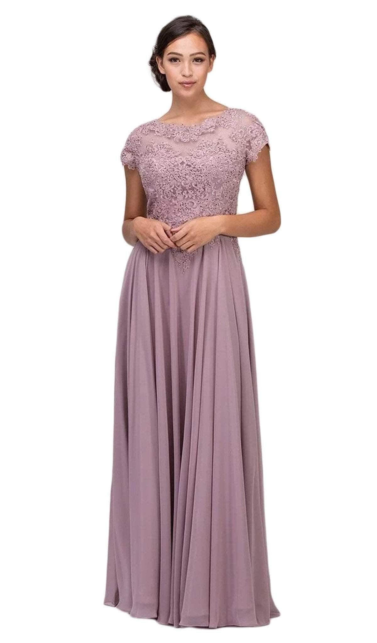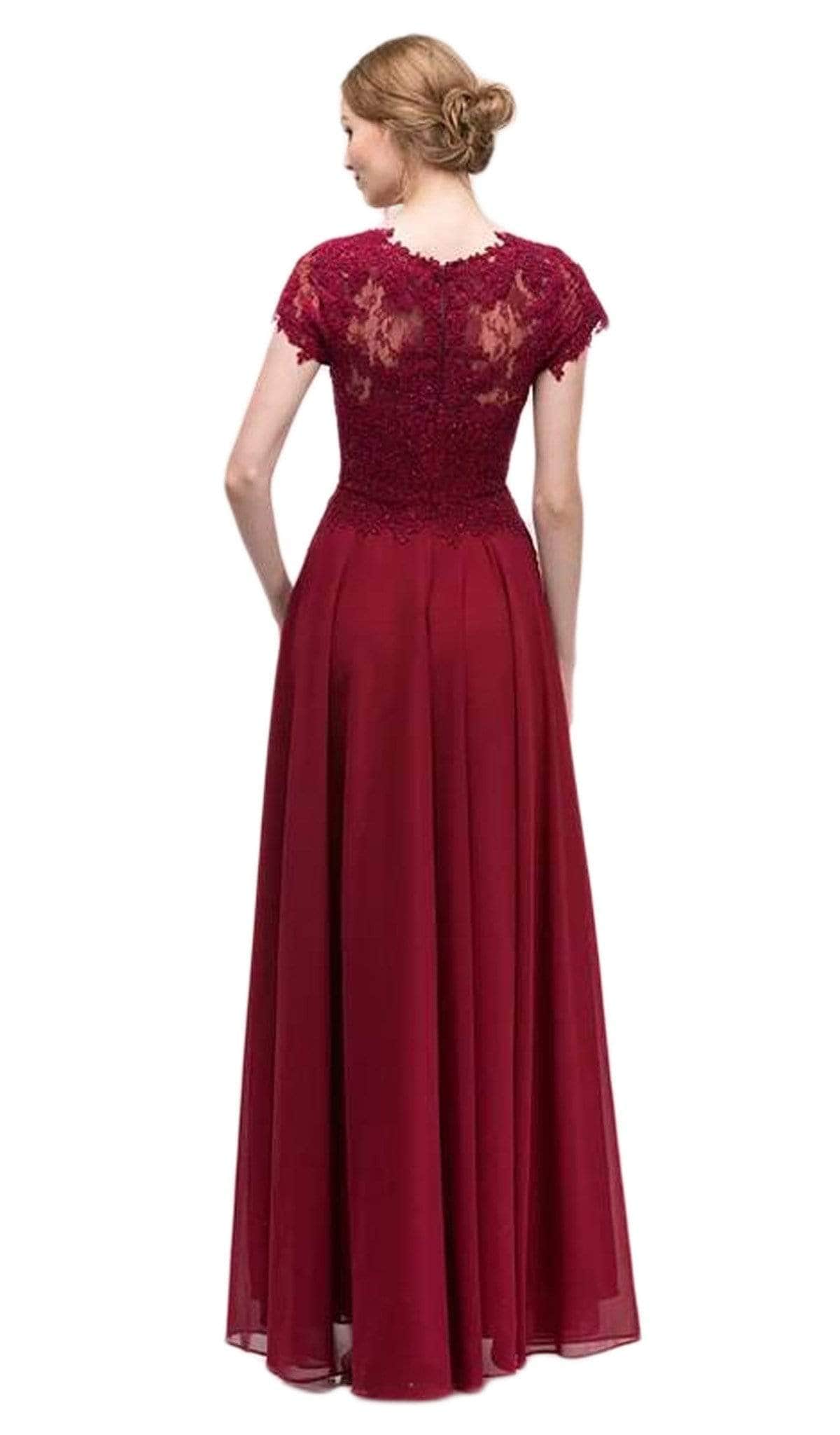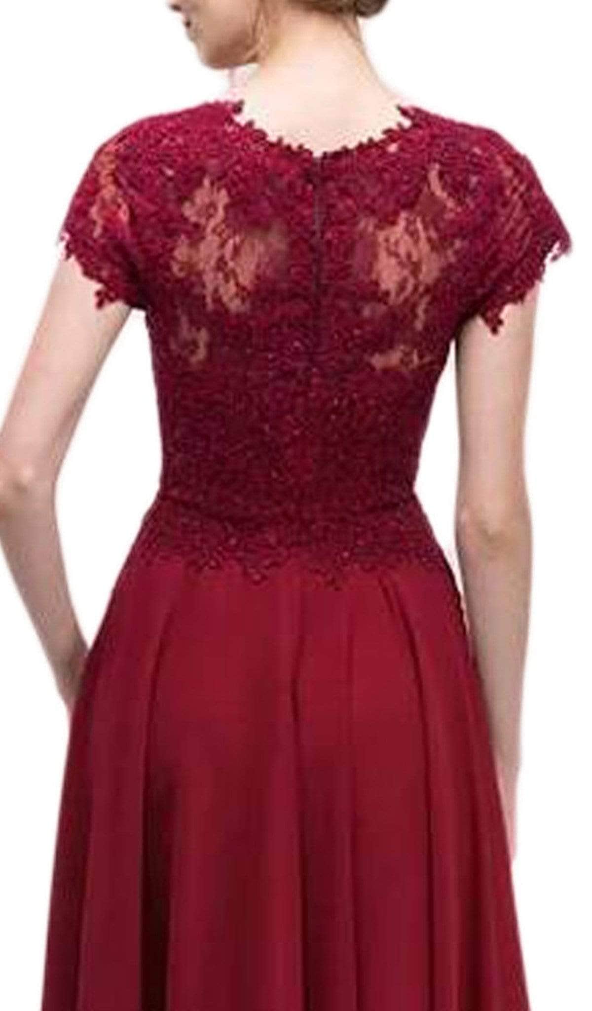 Chiffon, Illusion Yoke, Short Sleeves, Lace Appliques, Sheer Full Back, Back Zipper Closure, Full Length Hem |