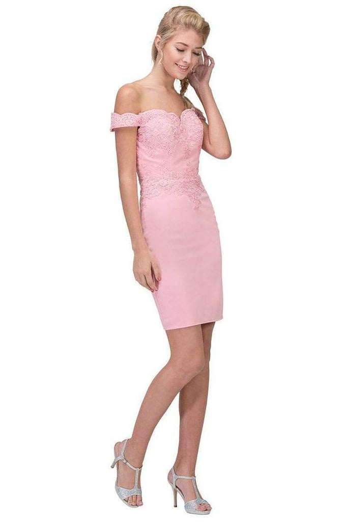 Showcase your beautiful side in this lovely Eureka Fashion 7200 cocktail dress. This off-shoulder dress is festooned with lace appliques, and a chic feminine scallop semi-sweetheart neckline. The skirt displays a sheath silhouette which graces to the mid-thigh length hemline. This Eureka Fashion is truly a definition of glamour.