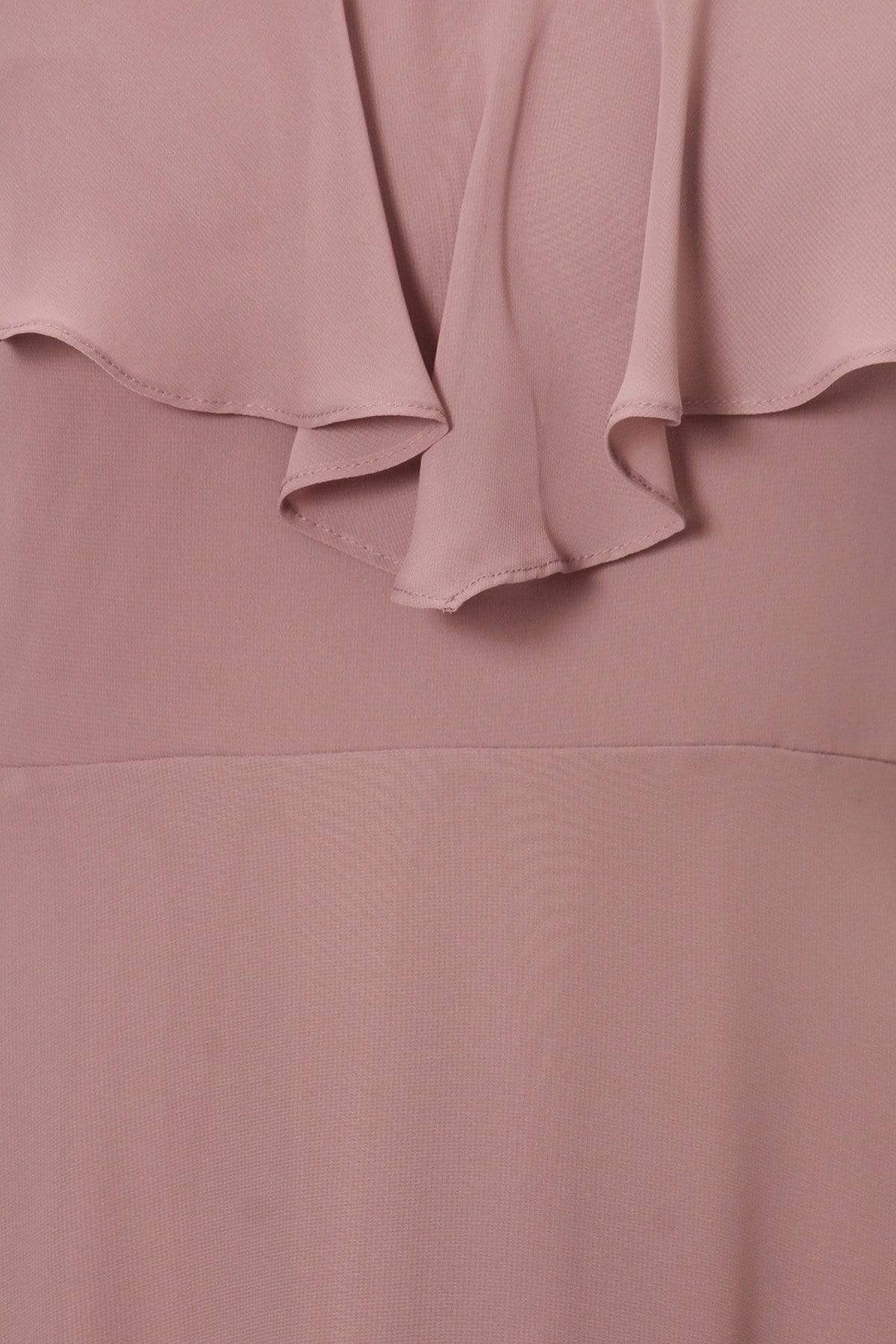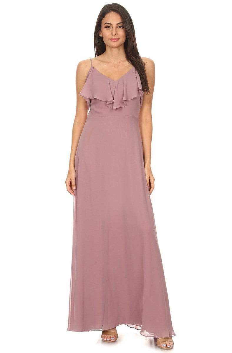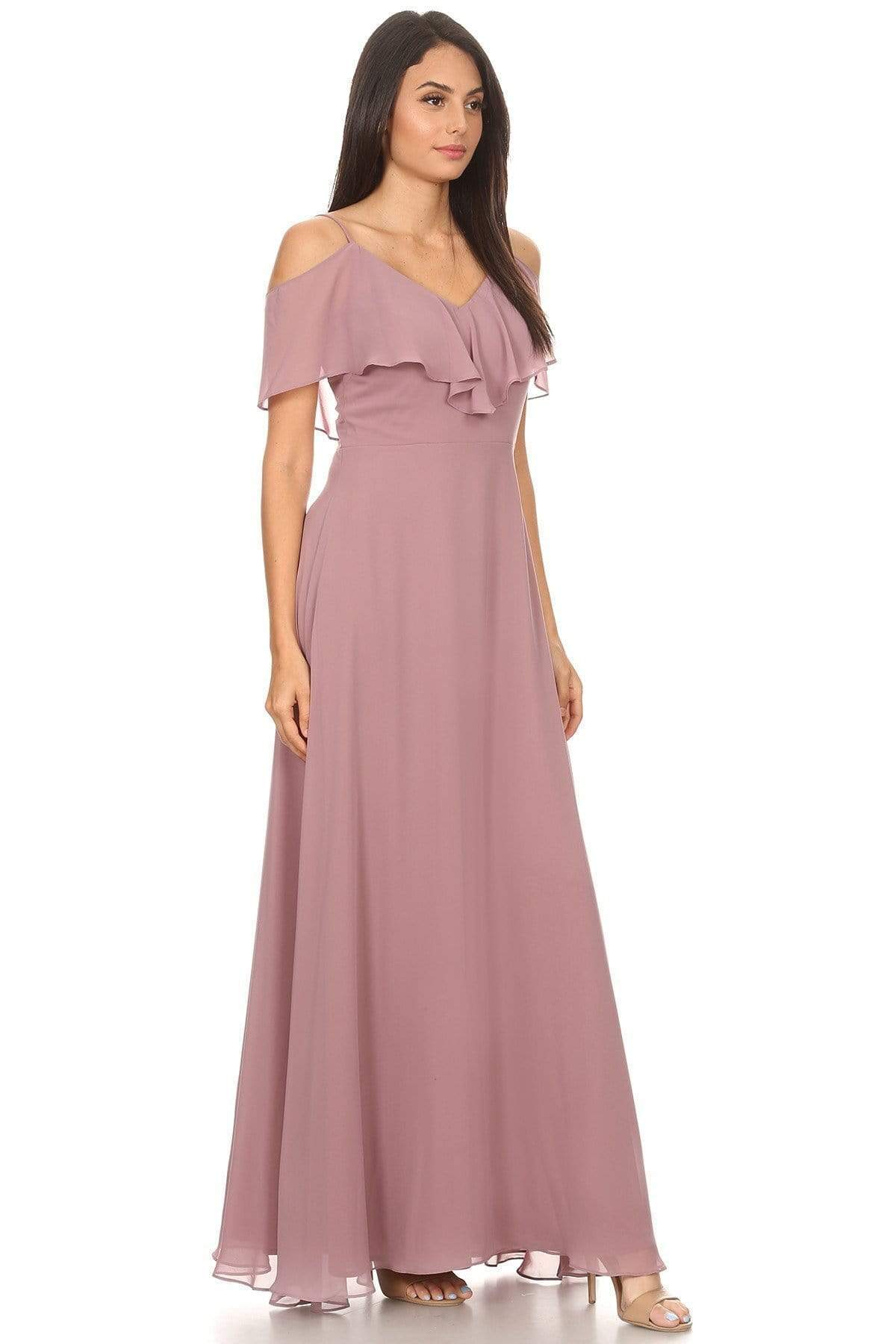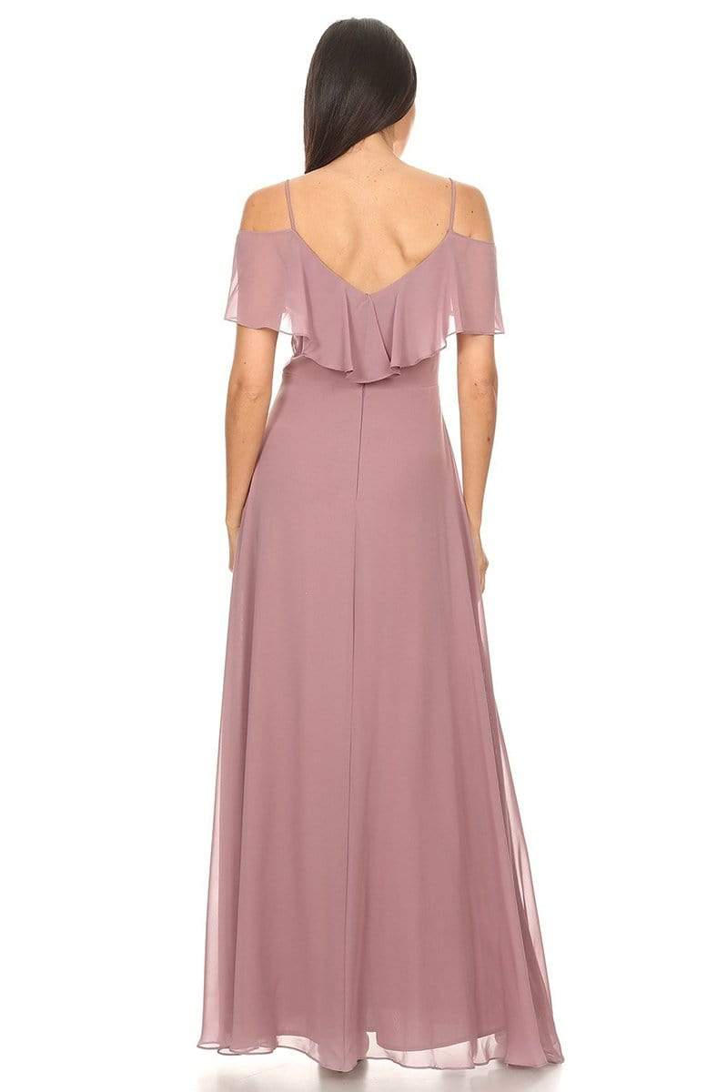 Display your natural beauty in this lovely Eureka Fashion 8877 piece. Gorgeously made in chiffon fabric, this stellar piece showcases a fitted bodice with a ruffled V neckline with cold-shoulder style or also could turn to a spaghetti strap style. The skirt flaunts an a-line silhouette that cascades to a full length hemline as the back reveals a V cut, secured with a center zipper closure. Walk in a defined sophistication with this Eureka Fashion ensemble.