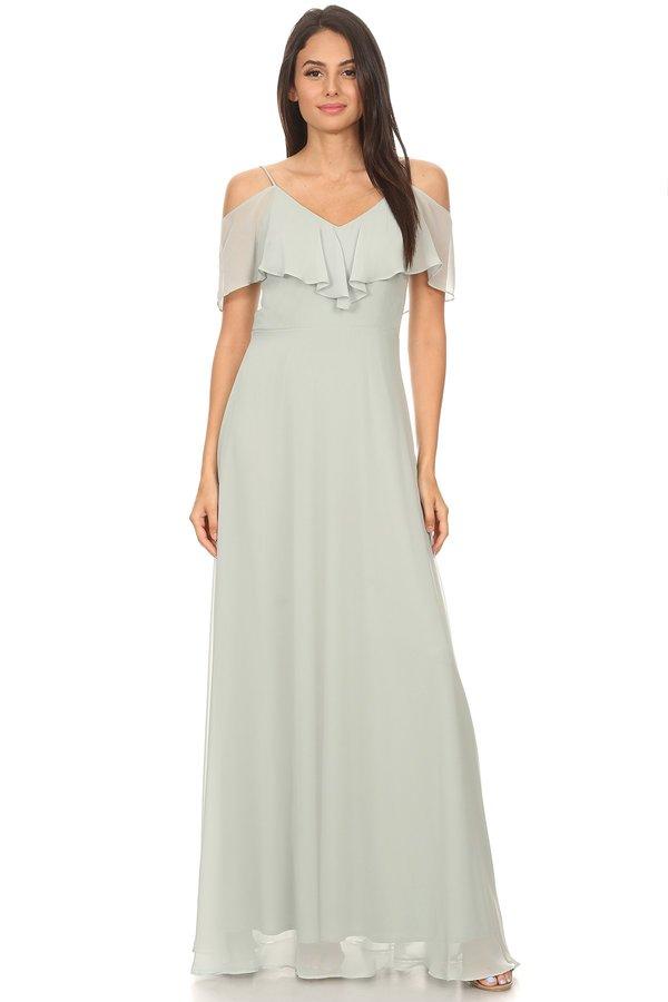 | Details: | Ruffled Neckline, Short Sleeves/Sleeveless, Spaghetti Straps, Cold Shoulder Cutout, Full Length, V Back, Back Zipper Closure |