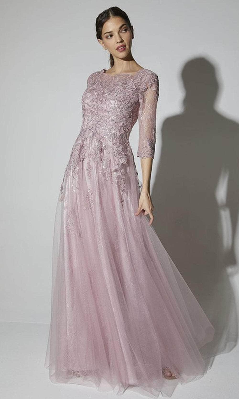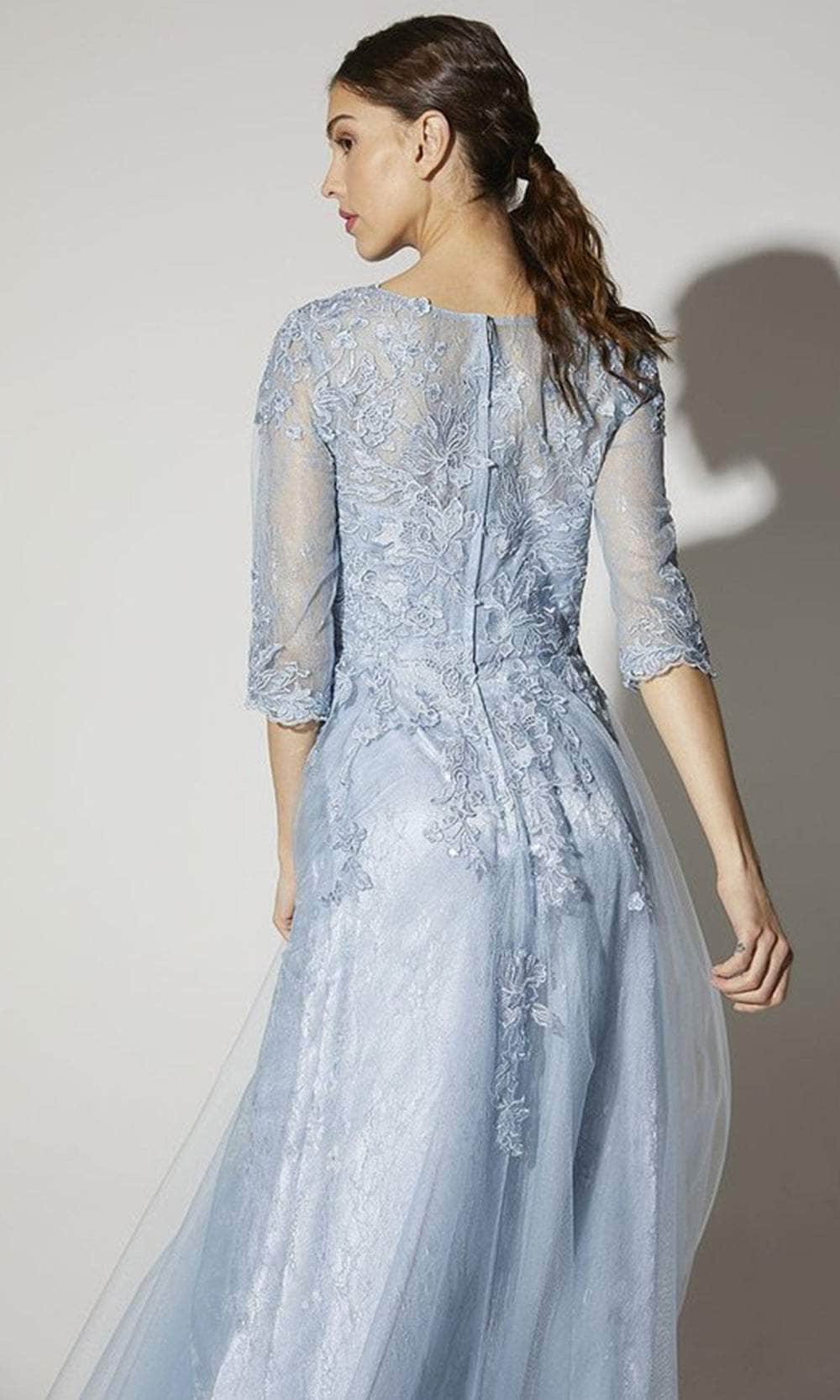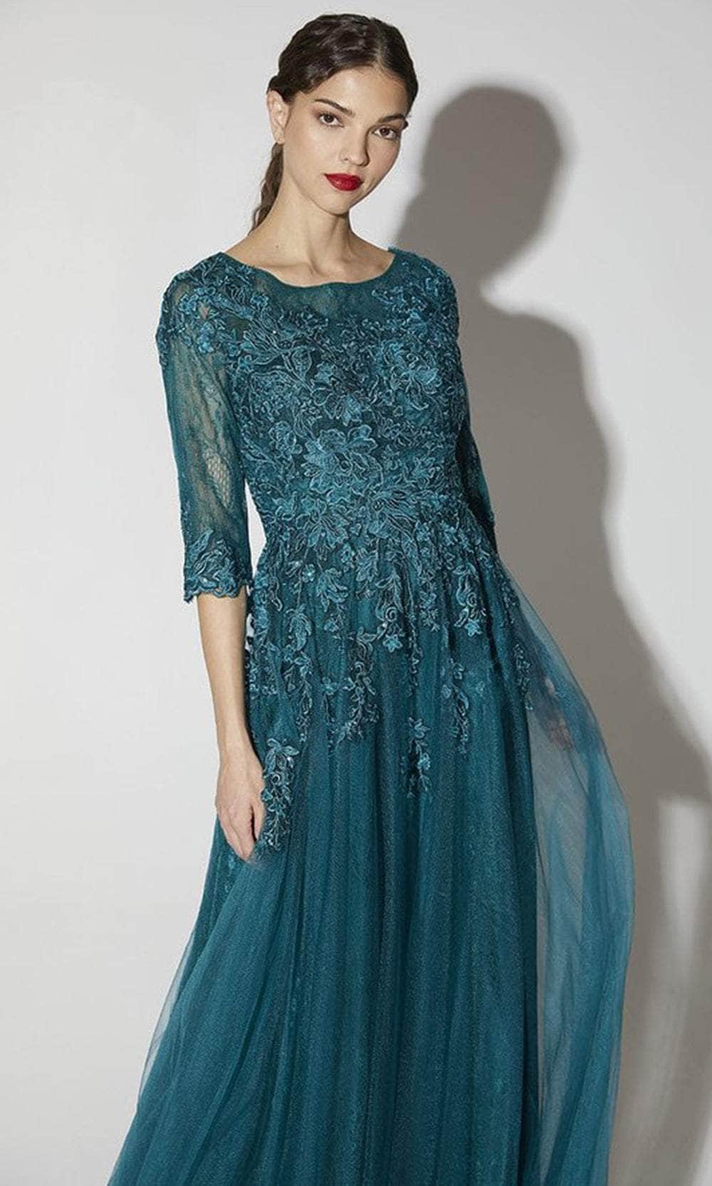 Make an unforgettable impression in the Eureka Fashion 9660, a gown that blends elegance and charm. This stunning design showcases floral lace embroidery and shimmering sequins, adding depth and texture. The scoop neckline and three-quarter illusion sleeves offer classic refinement, while the partial illusion back enhances the overall allure. The A-line skirt gracefully skims the floor, ensuring a flattering silhouette for all body types. Ideal for formal events, this gown radiates sophistication.