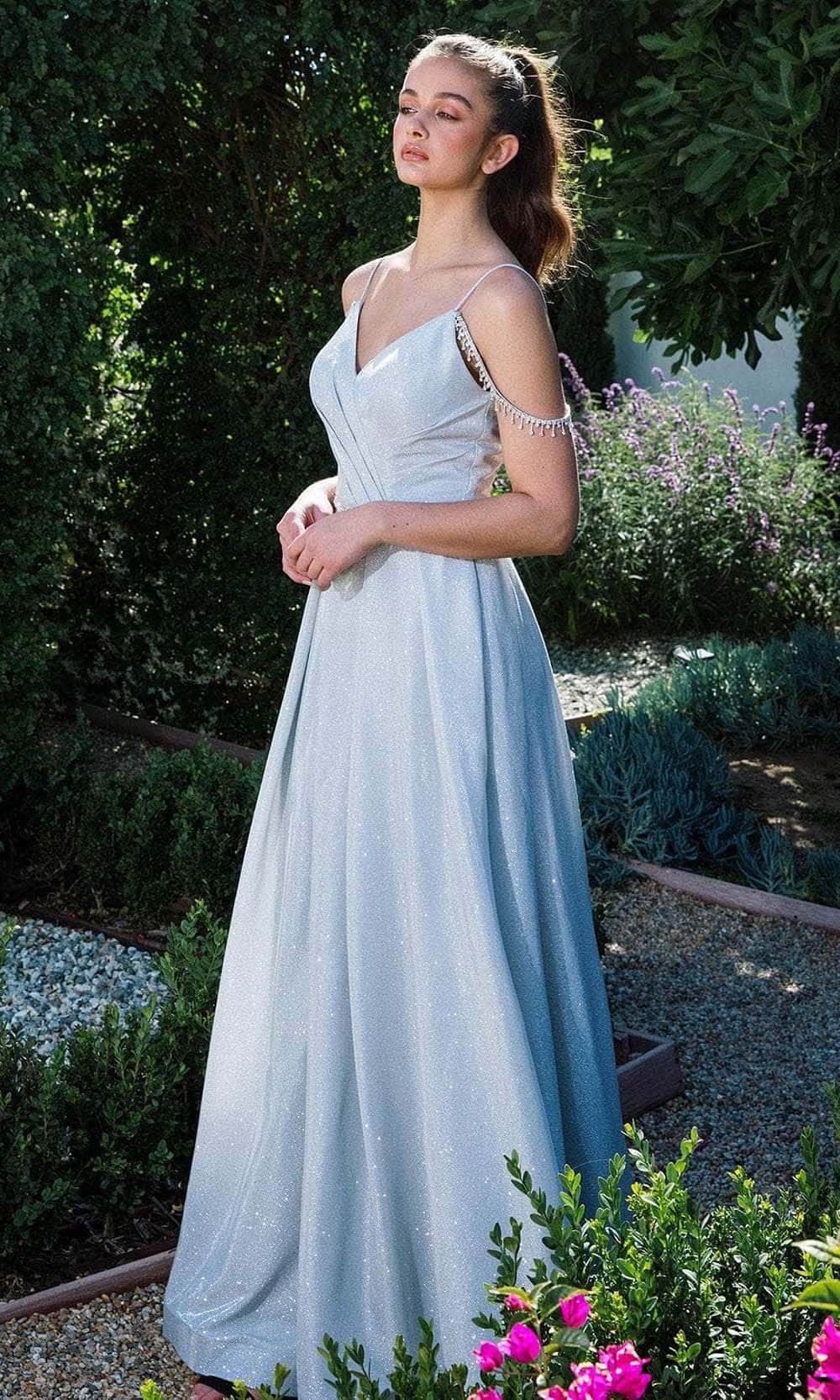 Morph into a total stunner in this mesmerizing when you wear this Eureka fashion 9800 creation. Shimmers in a glittered fabric, this gorgeous piece flaunts a V-neckline held by spaghetti straps traversing to a mid-open back and secured by lace-up tie. Fine pleats designed the fitted bodice as the embellished thin waistband cinched the waist to accentuate the curves. This sophisticated style finishes at a floor length hem. Make it a romantic occasion with this Eureka Fashion masterpiece. Model is wearing the Silver color.