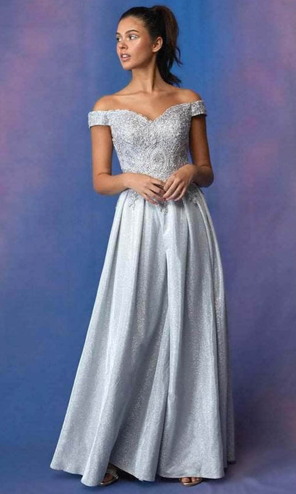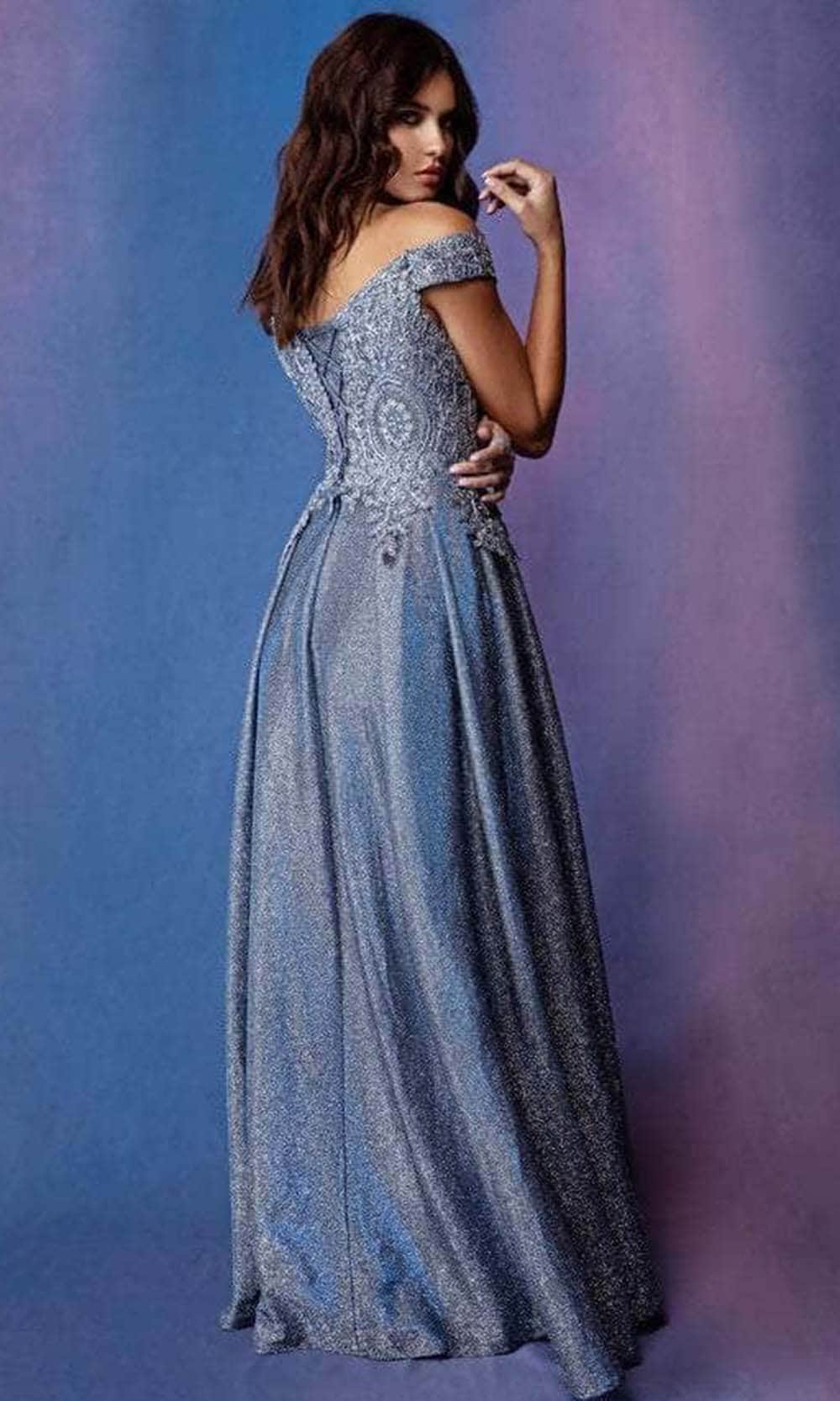 Shine through the night in this mesmerizing gown by Eureka Fashion 9806. Adorned with lace appliques design on the fitted bodice, this beauty boasts an off-shoulder sweetheart neckline with a mid-open back and lace up closure. The glittered fabric shines radiantly in an A-line skirt that tuck from the natural waist down to a full-length hem with a sexy high slit and side pockets. Beam with pride as you wear this Eureka Fashion creation. Models are wearing Peri Blue and Silver colors.