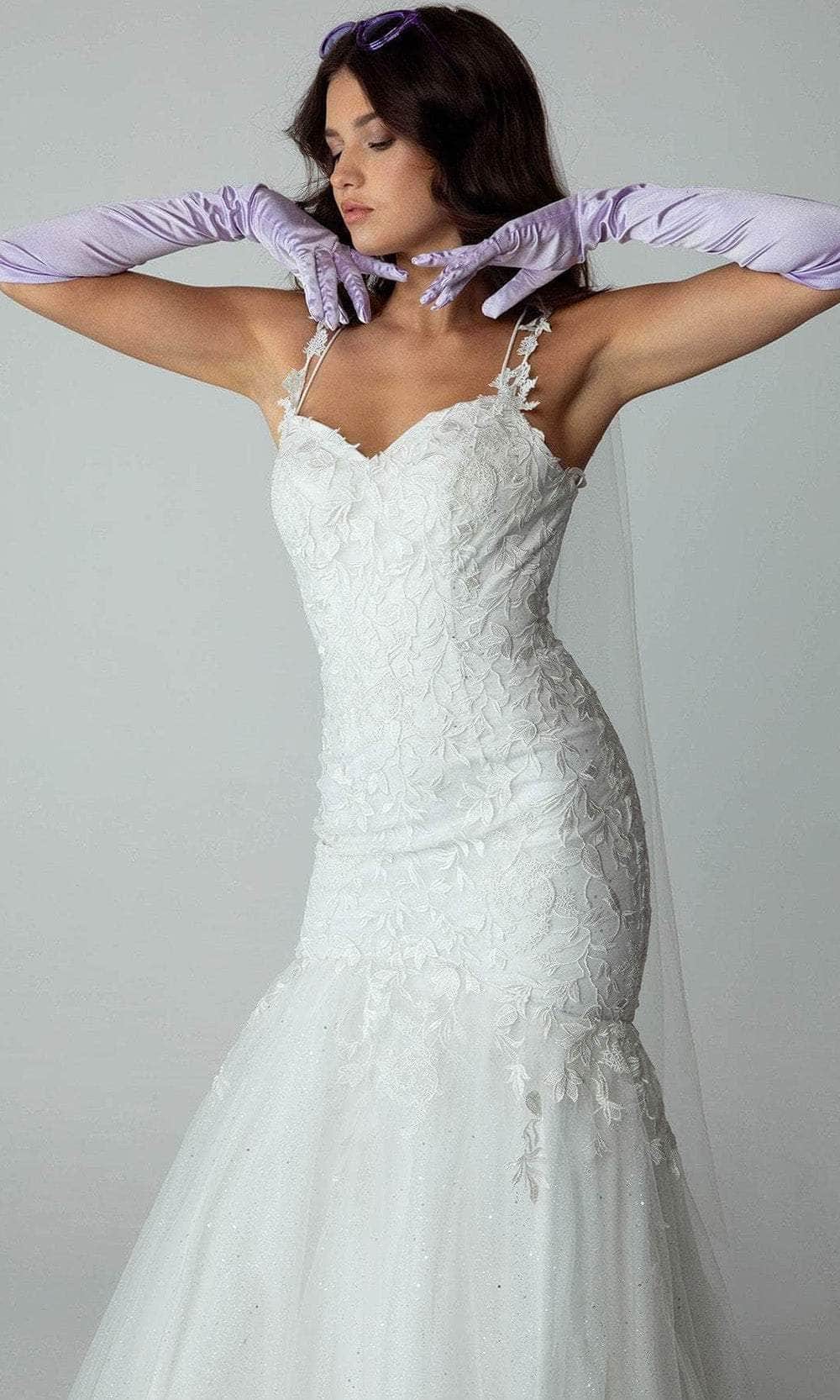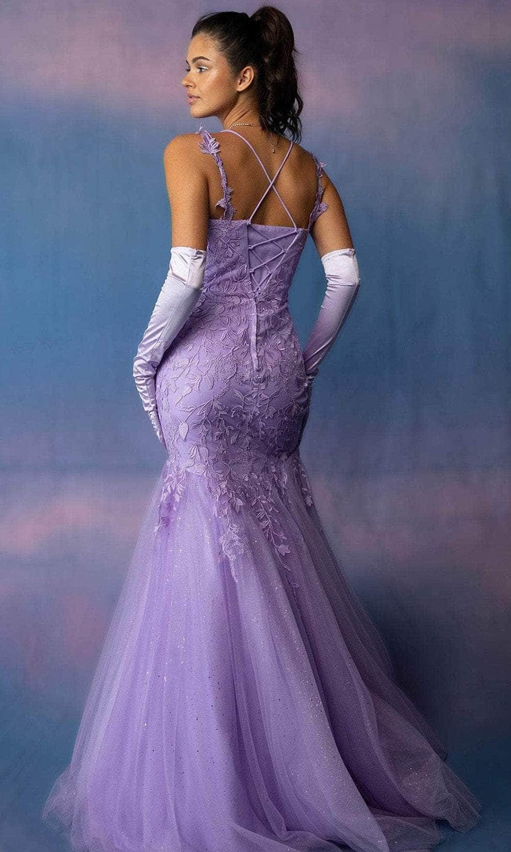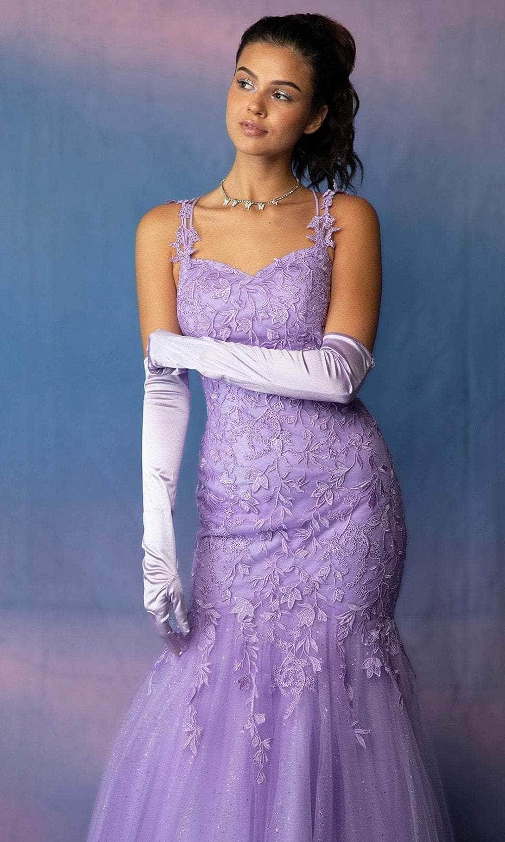 Look and feel glamorous in this design by Eureka Fashion 9957A. Fashioned in a sweetheart neckline, this beautiful piece is tailored in a sleeveless frame with dual spaghetti straps that traverses to the mid-open back creating a crisscross strap design and a lace up tie closure. Embroidered with beautiful lace appliques over the fitted bodice down to the hips before finishing in a sweep train. Feel dainty and feminine in this enchantingly designed Eureka Fashion dress. Models are wearing Lilac and Off White colors.