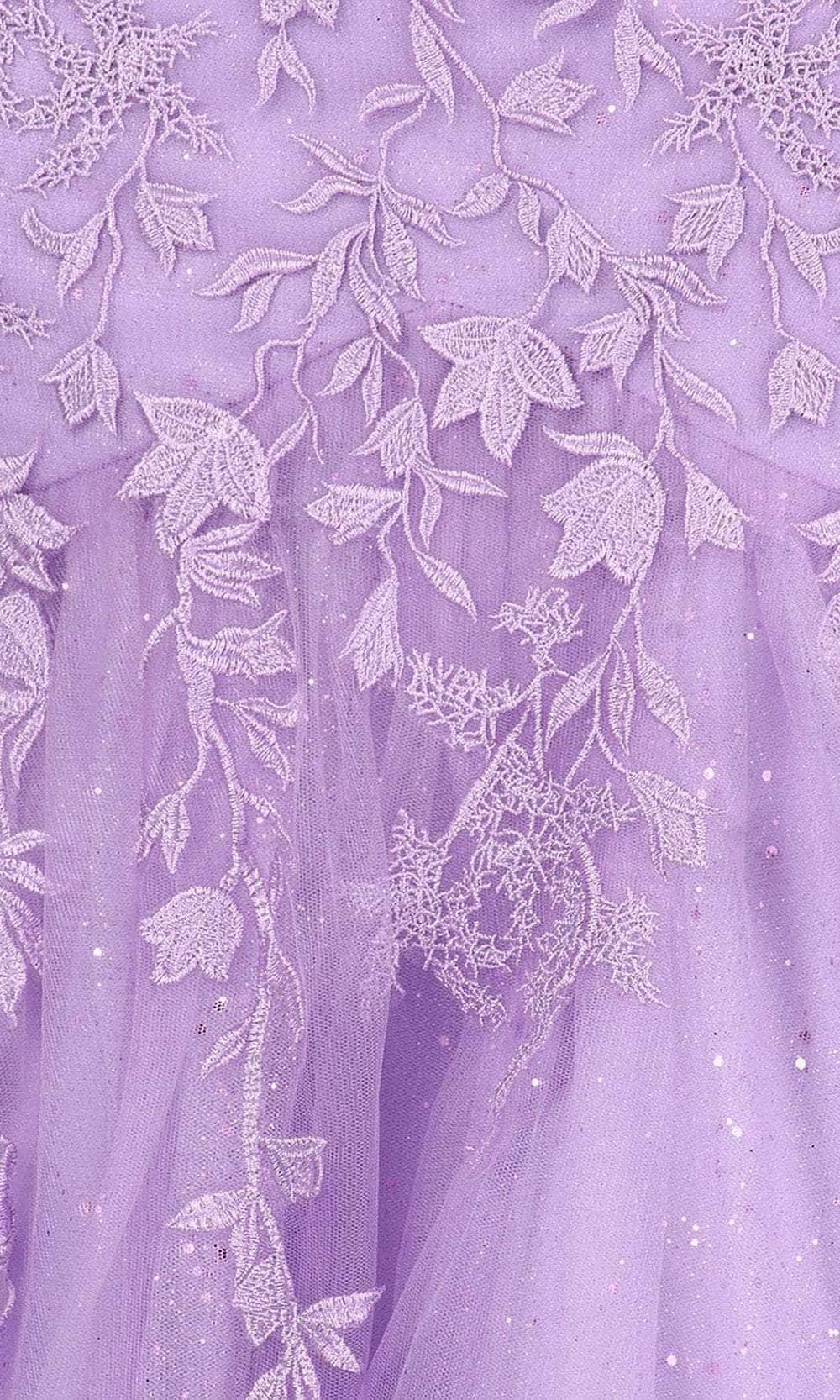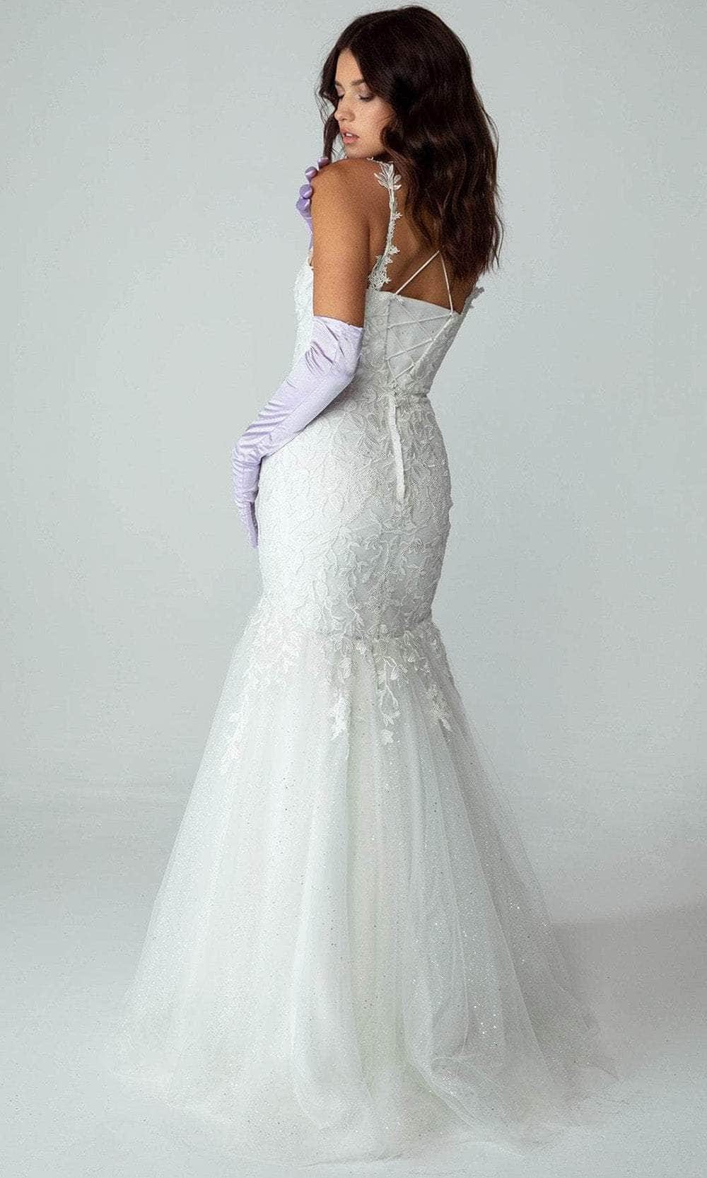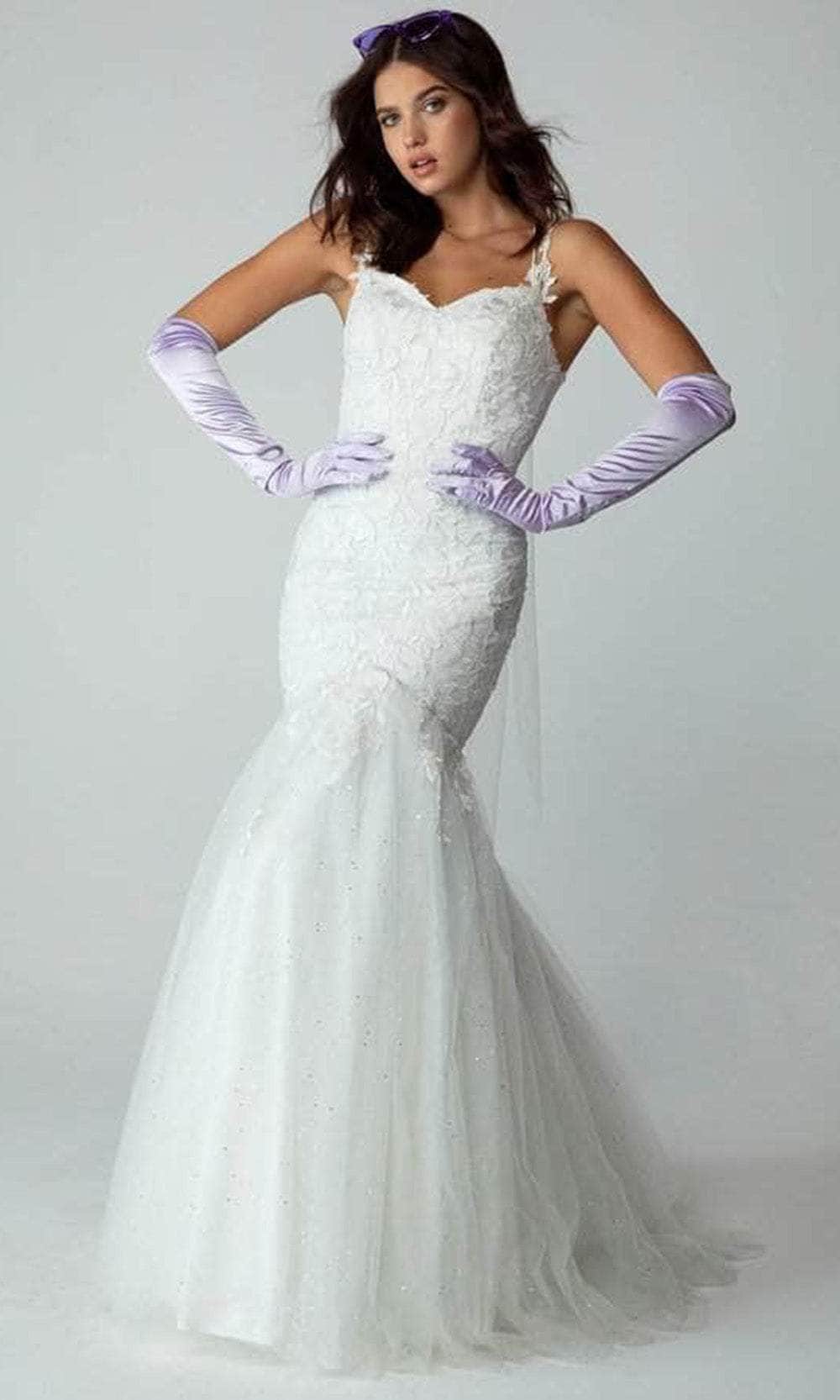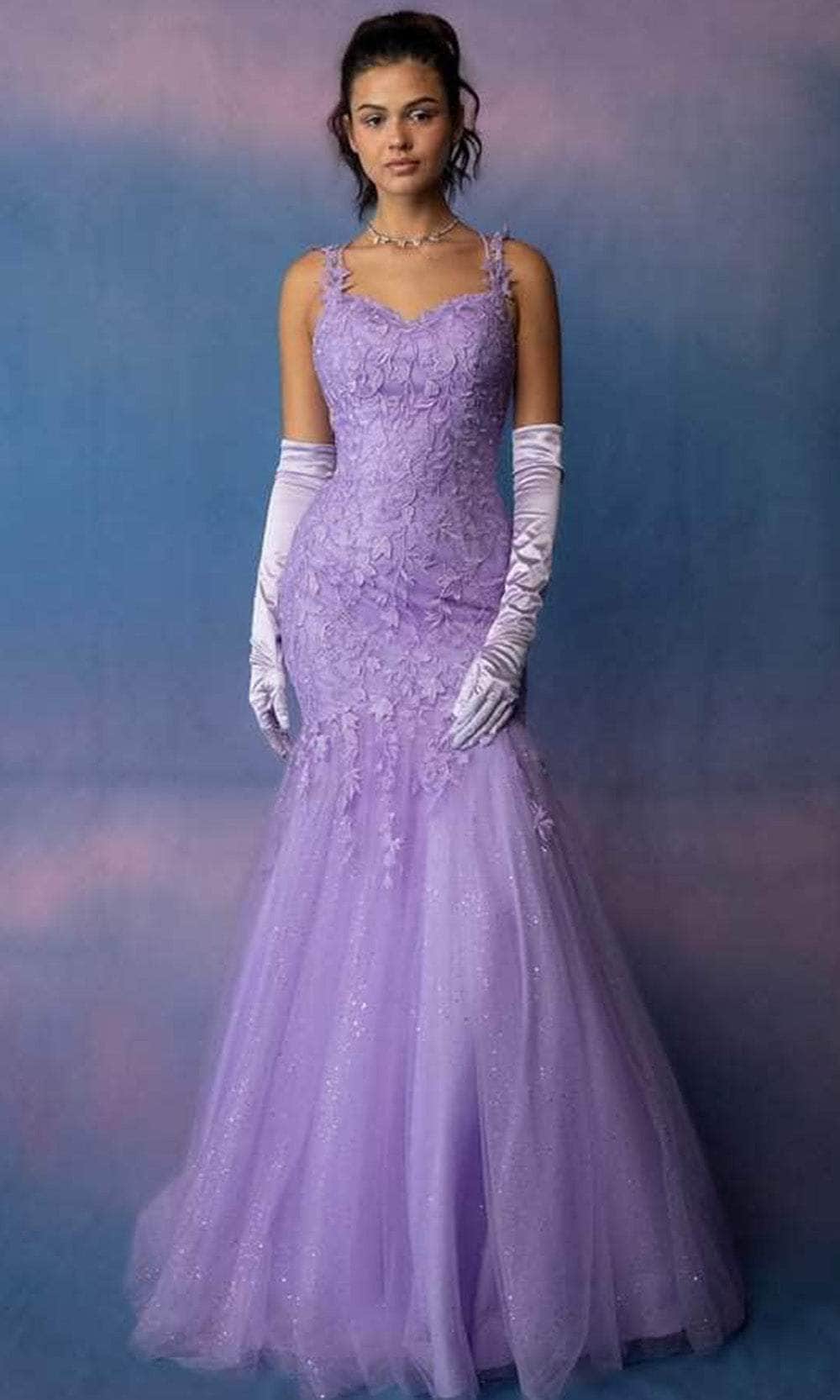 Look and feel glamorous in this design by Eureka Fashion 9957A. Fashioned in a sweetheart neckline, this beautiful piece is tailored in a sleeveless frame with dual spaghetti straps that traverses to the mid-open back creating a crisscross strap design and a lace up tie closure. Embroidered with beautiful lace appliques over the fitted bodice down to the hips before finishing in a sweep train. Feel dainty and feminine in this enchantingly designed Eureka Fashion dress. Models are wearing Lilac and Off White colors.