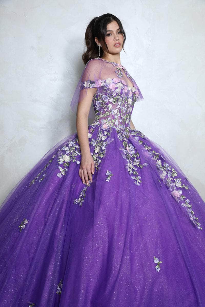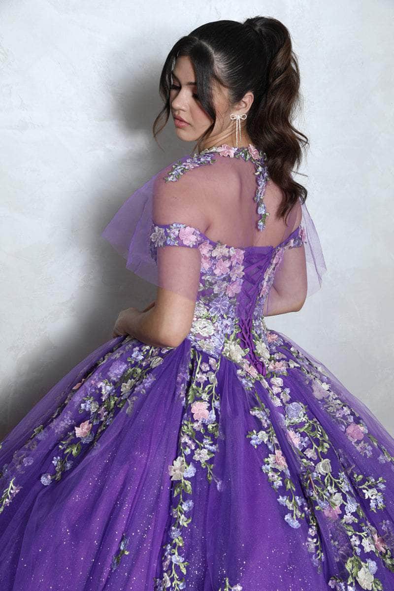 Immerse yourself in a fairytale fantasy with the Eureka Fashion EK1003, a gown crafted for unforgettable moments. Tailoring expertise defines the silhouette, showcasing a captivating combination of shimmering tulle and intricate floral lace embroidery. The off-the-shoulder neckline adds a touch of romantic allure, while the corset-detailed back ensures a beautifully cinched waist. The gown cascades into a voluminous ball gown skirt. A graceful train trails behind you and to complete the regal look, the ballgown comes with a charming mini cape, an elegant finishing touch. This Eureka Fashion EK1003 masterpiece is the epitome of ethereal beauty, perfect for a night where you deserve to feel like a princess. Model is wearing the Purple color.