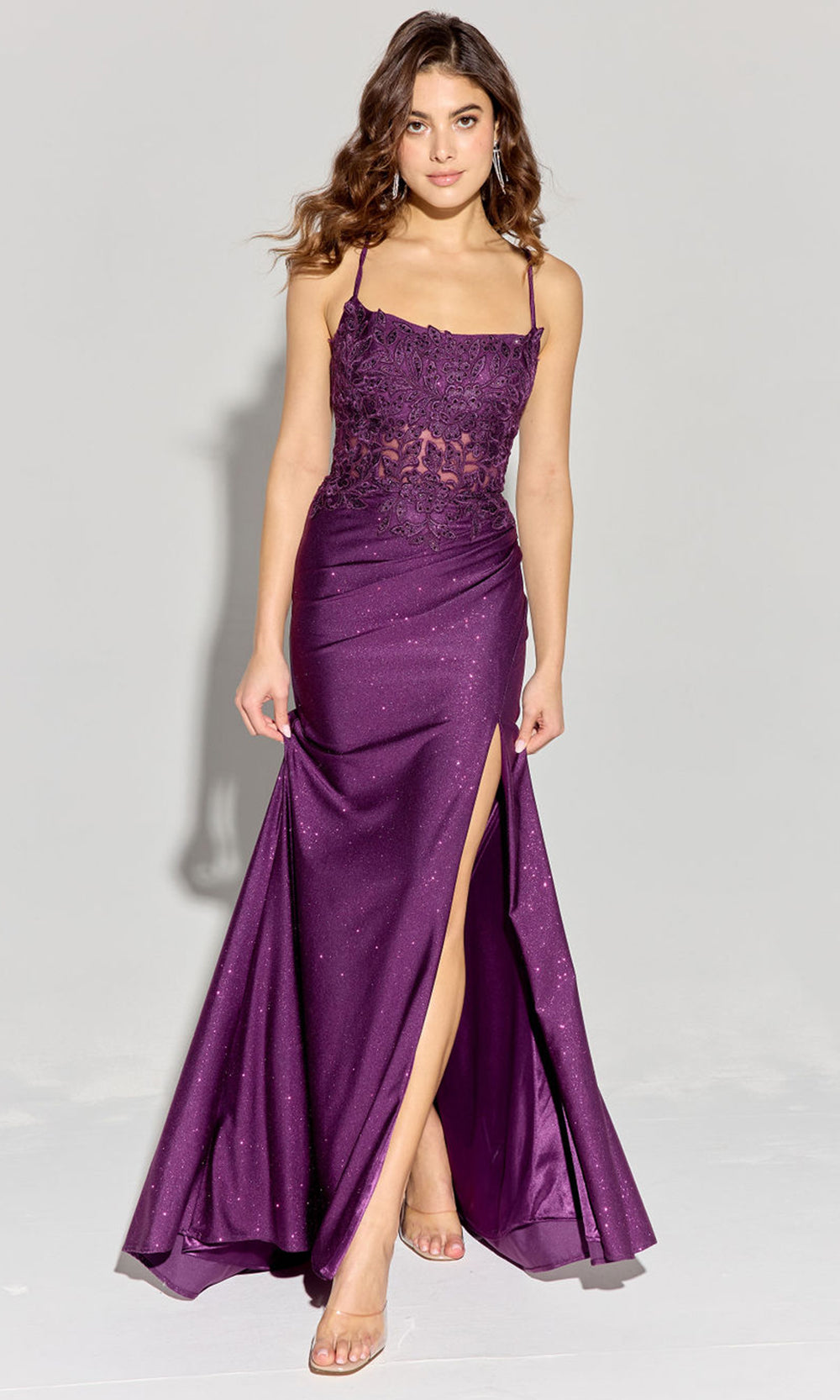 Sparkle and sophistication join forces in this Eureka Fashion EK129 breathtaking gown designed to captivate. The illusion bodice is adorned with floral embroidery and beading layered over sheer mesh, creating a delicate yet dramatic statement. It features a straight-across neckline, open lace-up back and slender straps for a modest yet elegant upper silhouette. From the waist down, the gown transitions into a smooth glitter sheath skirt that molds to the body, highlighted by a thigh-high slit for a bold finish. This Eureka Fashion EK129 creation is a stunning choice for glamorous events. Models are wearing Plum, and Sea Spray colors.