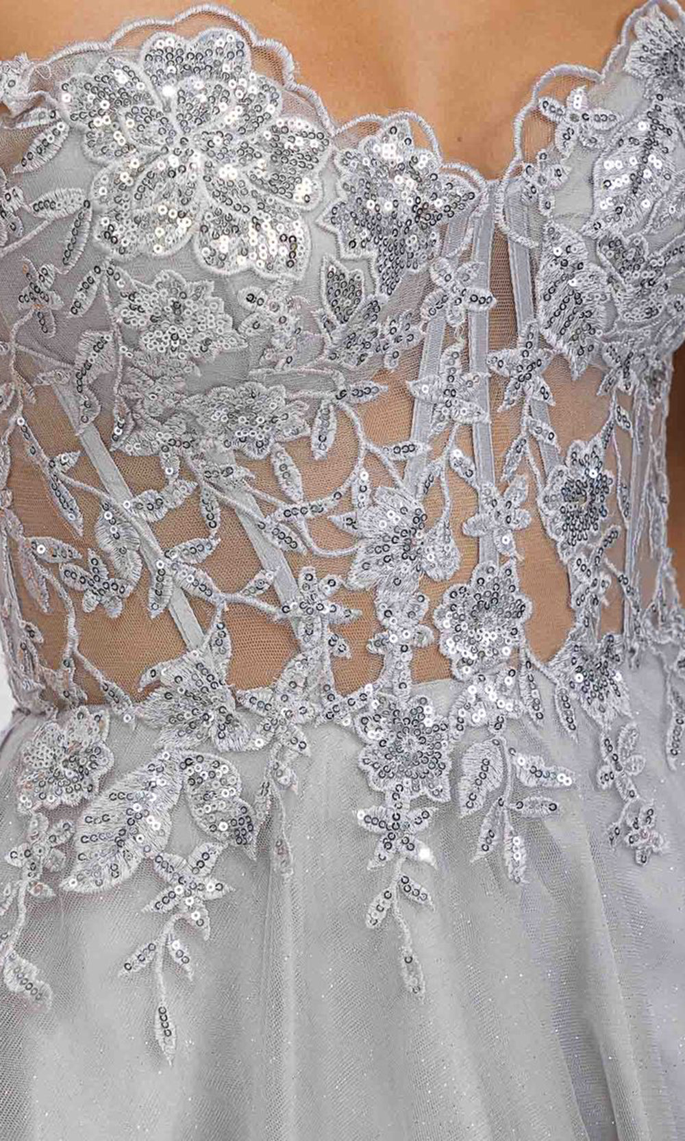 | Details: | Illusion Corset Bodice, Floral Embroidery, Off Shoulder Sleeves, Short Flared Skirt, Back Zipper Closure |