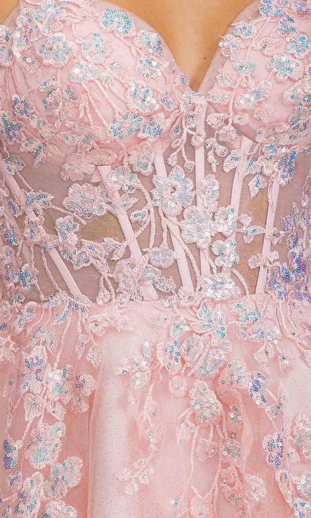 | Details: | Sleeveless, Iridescent Sequin, Embroidery, Illusion Corset Bodice, Lace-Up Back, Layered Skirt |
