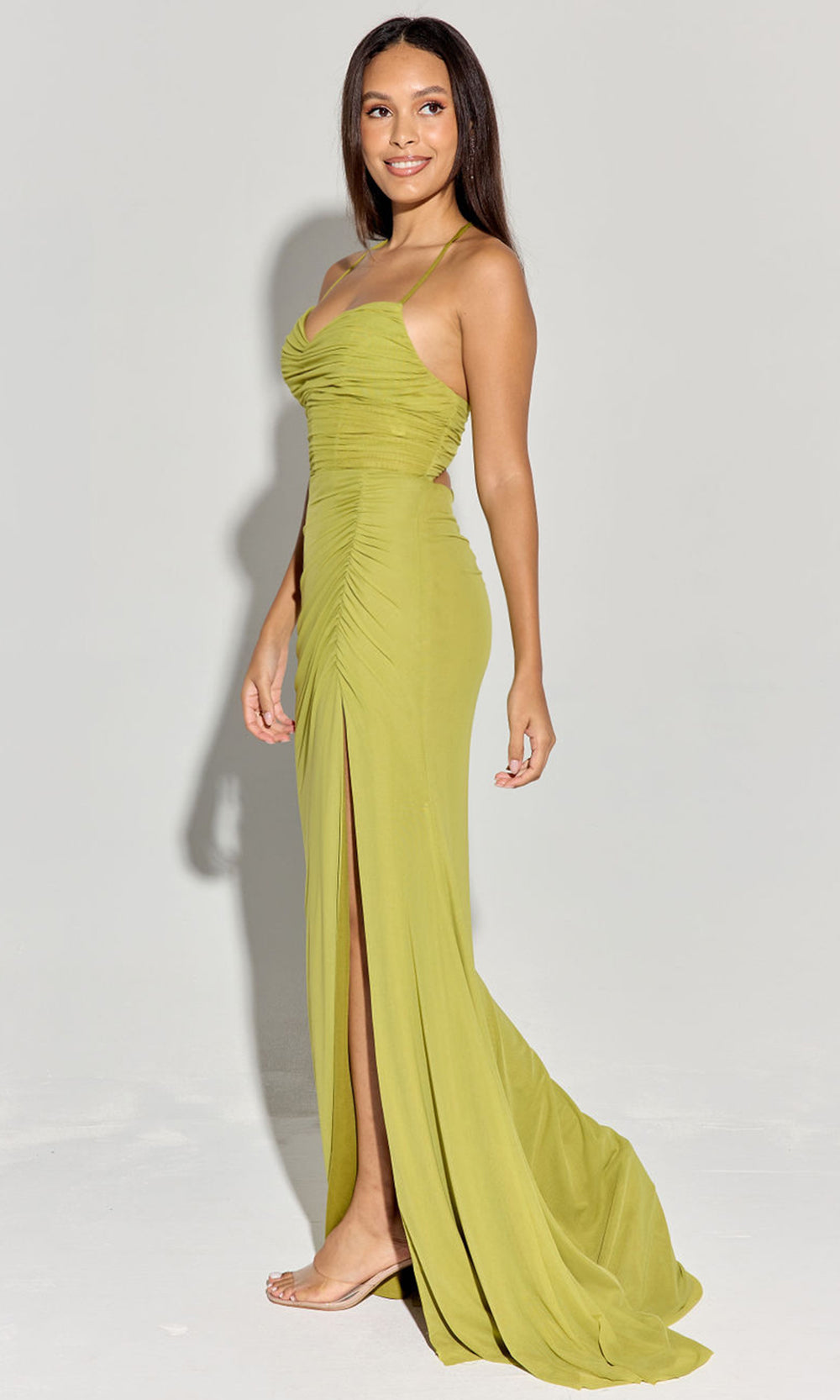 | Details: | Ruched Bodice, Sleeveless, Spaghetti Straps, High Slit, Sweep Train |