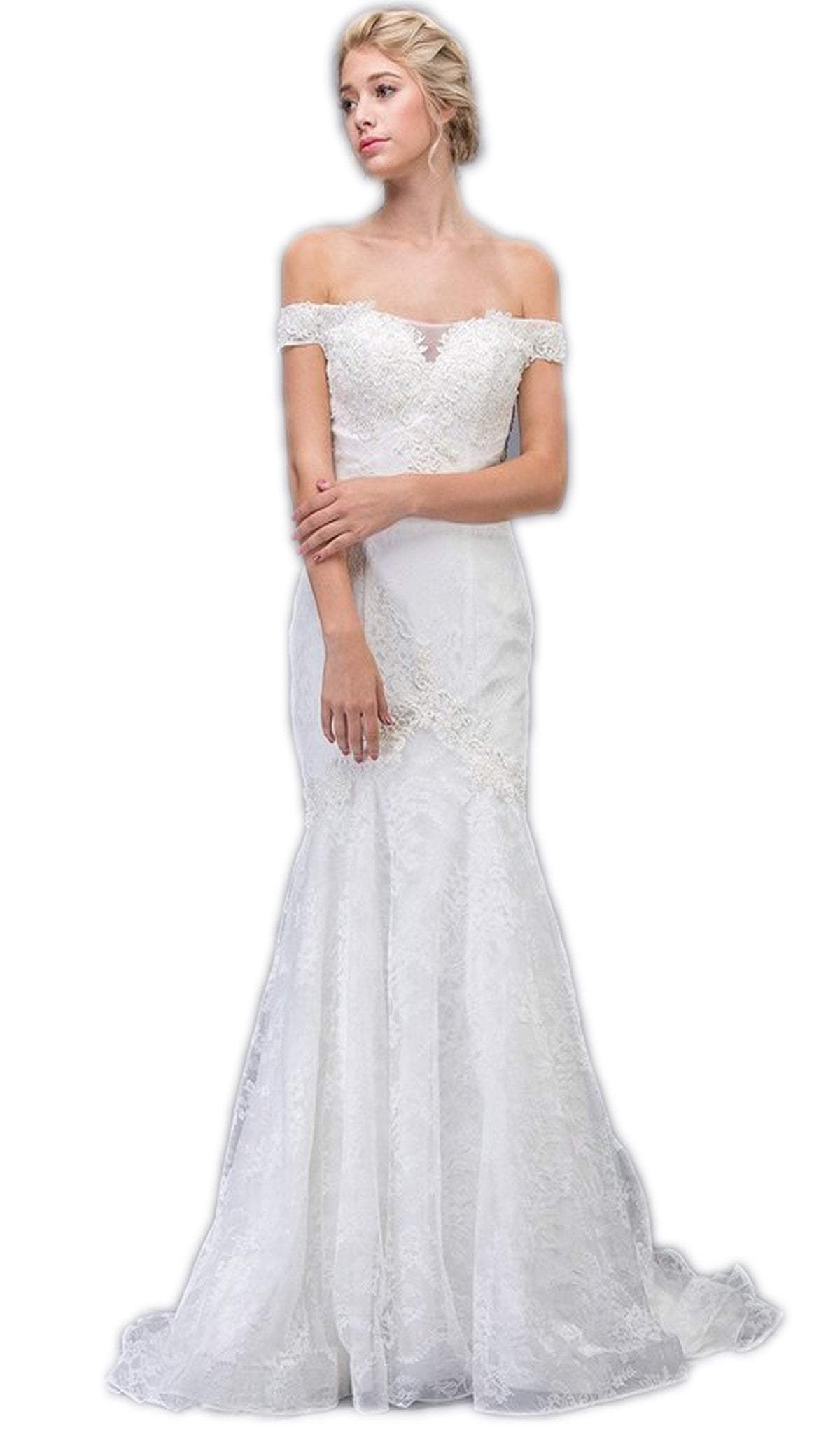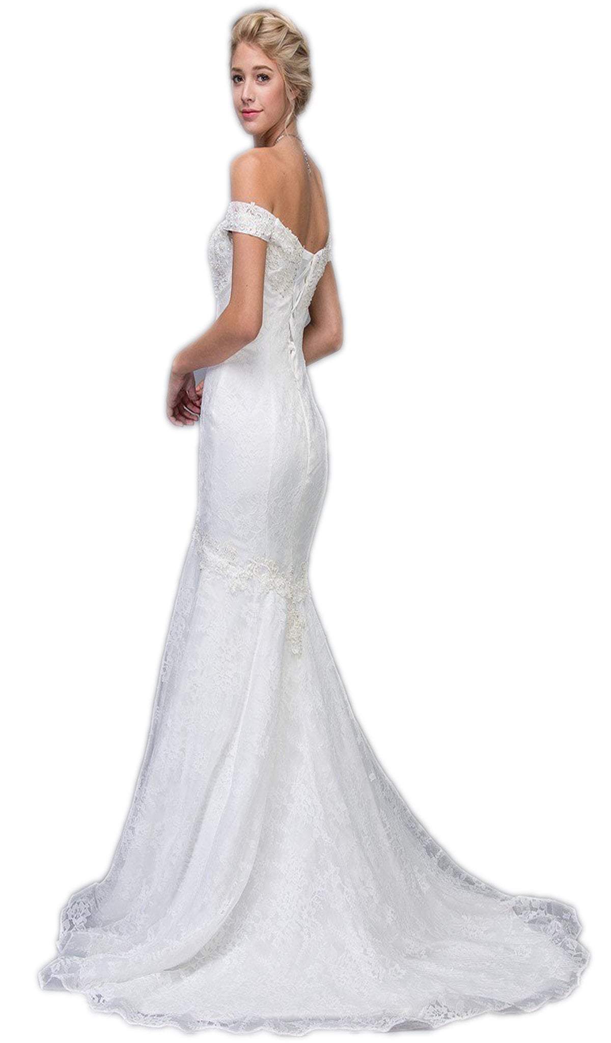 Be the epitome of a blushing bride when you walk down the aisle glowing in this Eureka 6520 creation. Lavishly sculpted with seams from an ethereal lace fabric, this immaculate piece flourishes an off-shoulder neckline tailored with a sweetheart notch and a sheer inset. Designed with a dainty mid-open back cinched with a corset lace-up detail, shimmering ornate lace appliques dazzle along its contoured silhouette. Detailed with intricate lace appliques along the peaked inverted basque detail, the trumpet skirt softly flares in gossamer layers down to a full-length hem and a court train. Look unforgettably stylish and refined as you take your vows of forever in this Eureka masterpiece. Model is wearing the Off White color.