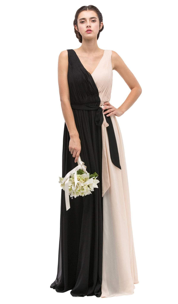 Get noticed at the crowd wearing this creation by Eureka 2711. This two toned dress flashes a sleeveless, V-neckline with pleated bodice cinched with a waist tie. This dress has a V-cut back and a full length chiffon A-line skirt with mini train. This Eureka creation is truly remarkable!