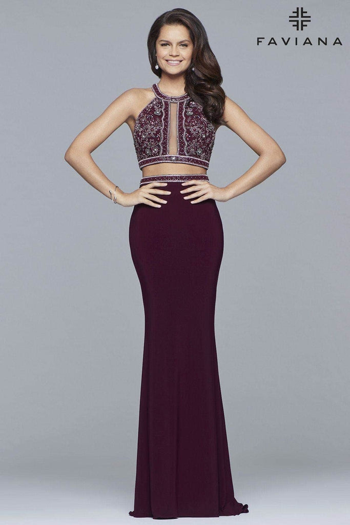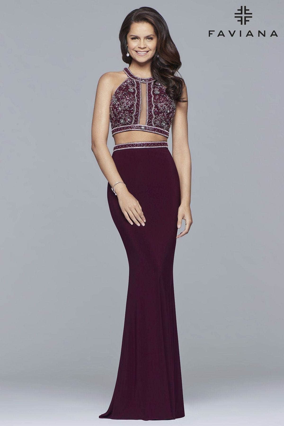 Faviana 10019 is fun and fresh. The front and back of this two-piece dress are beaded, and the mesh back exposes just the right amount of skin. There are two colors of this jersey dress: bordeaux and black. Wear a bracelet and drop earrings as jewelry. Mixing the top with other items will allow you to restyle it in different ways. Step out in this classic style of Faviana 10019 for that winning look at the pageant, prom, or homecoming. Model represents the dress in Bordeaux color.
