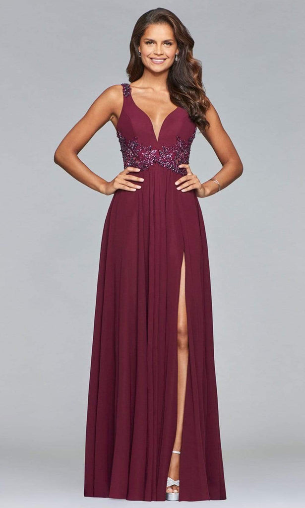 Lavish yourself with lush elan in this evening gown by Faviana 10102. This sophisticated dress features a plunging V neckline and sleeveless bodice. This dress is crafted in chiffon fabric with a beaded waistline and straps, and a cutout back detail. The thigh-high slIt creates a sassy finish on this fantastic design. This A-line ensemble cascades gorgeously to the floor. Be in this awesome Faviana design and create a night that you will forever reminisce. Models are wearing Navy and Chianti colors.