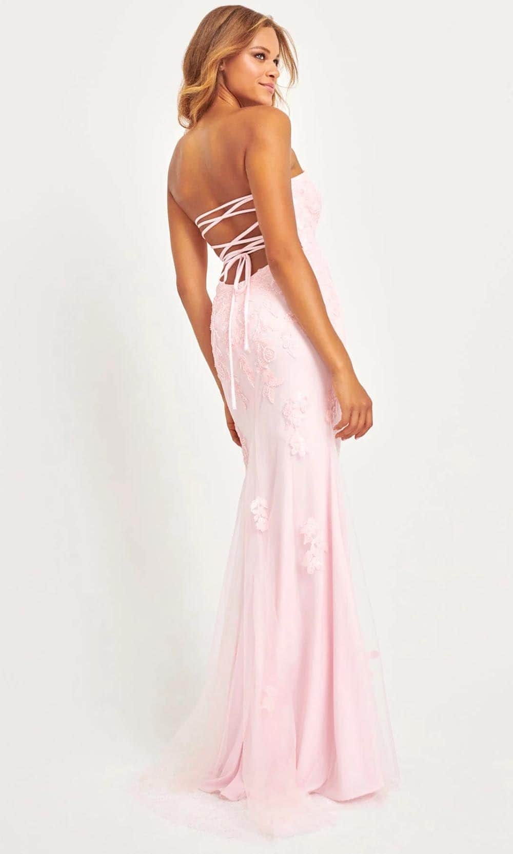 Don this alluring Faviana 11004 creation that exudes elegance and confidence. Flaunting a dreamy design with its strapless bodice and exquisitely tailored silhouette, this gown reveals a straight-across neckline matched with a lace up detail cinching the back. Designed with crusts of tonal beaded lace details accenting its shapely length, the mermaid skirt embraces the natural shape of the woman's figure and extends into a train that glides along the ground. Get ready to captivate in this striking Faviana 11004 creation that beautifully combines modernity and sophistication. Model is wearing the Light Pink color.