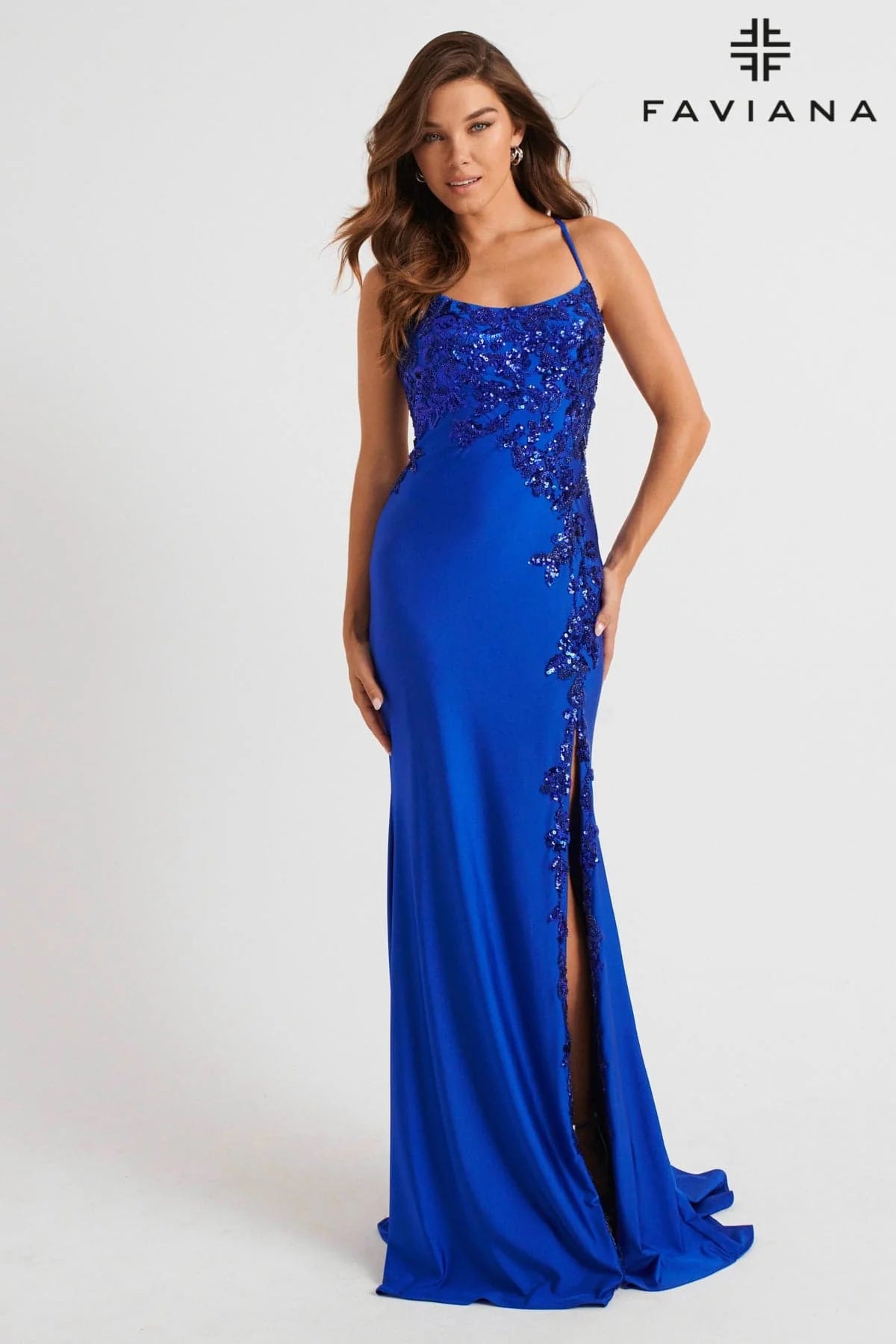 Leave an indelible symphony of glamour and romance in this stunningly made Faviana 11017 creation. Dazzling like as a showstopper with its sleek charmeuse silhouette, this alluring gown reveals a scoop neckline with spaghetti straps. Featuring an impressive display of sequin appliques down the bodice and trimming the high slit, this ensemble reveals an alluring lace-up back, you're guaranteed to capture everyone's attention. The ruching detail at the back adds an extra layer of glamour as it crafts a sheath silhouette with a sweeping train. Combine allure, romance, and timeless beauty in this Faviana 11017 masterpiece. Dress is pictured in Black, Dark Emerald, Navy, Ruby, Bubblegum Pink, Royal, and Sky Blue colors.