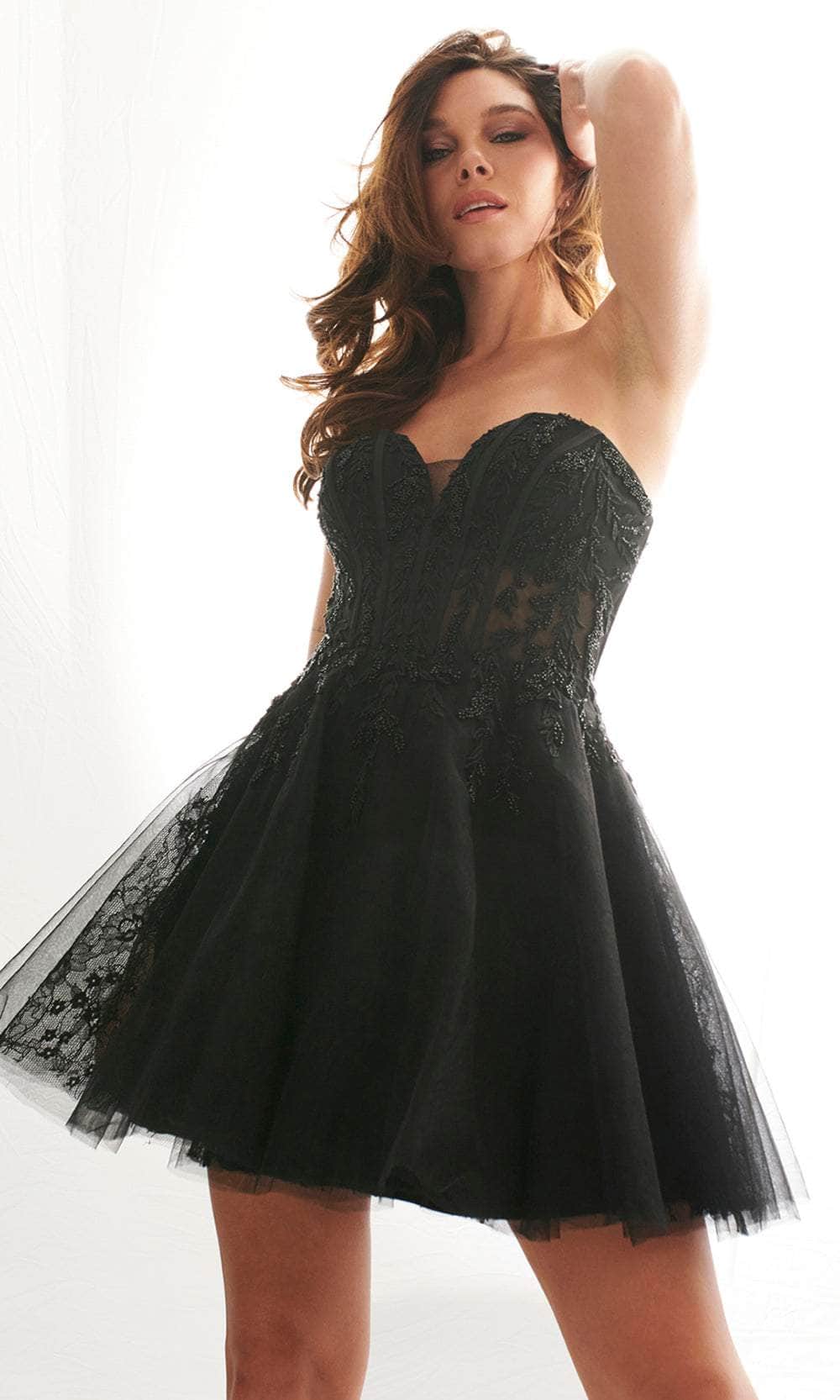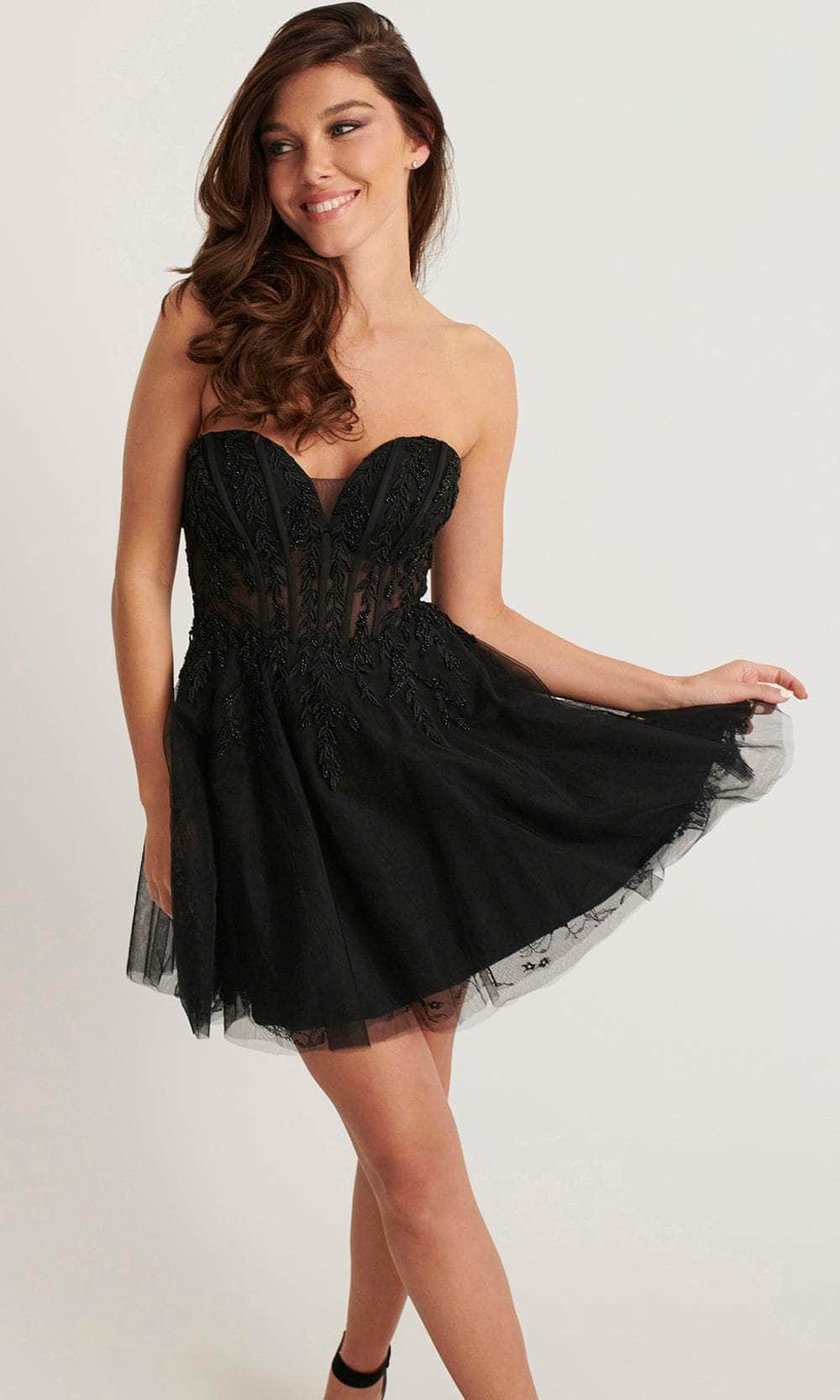 Exude a touch of contemporary romance with the Faviana 11120 creation. This captivating short dress masterfully blends classic silhouettes with modern details. The meticulously tailored tulle overlay cascades over a seam-sculpted inner lining, creating a beautifully defined form. A strapless sweetheart neckline flatters the face and shoulders, while trailing beaded appliqués adorn the sheer corset. The lace-up back offers a touch of adjustability and a hint of vintage charm. The A-line skirt is comprised of delicate layers and a short hem. The Faviana 11120 masterpiece transcends the limitations of a cocktail dress. Model is wearing the Black color.