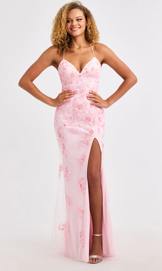 | Details: | Fitted Bodice, Spaghetti Straps, High Slit, Floral Beaded Applique, Open Lace-Up Back |