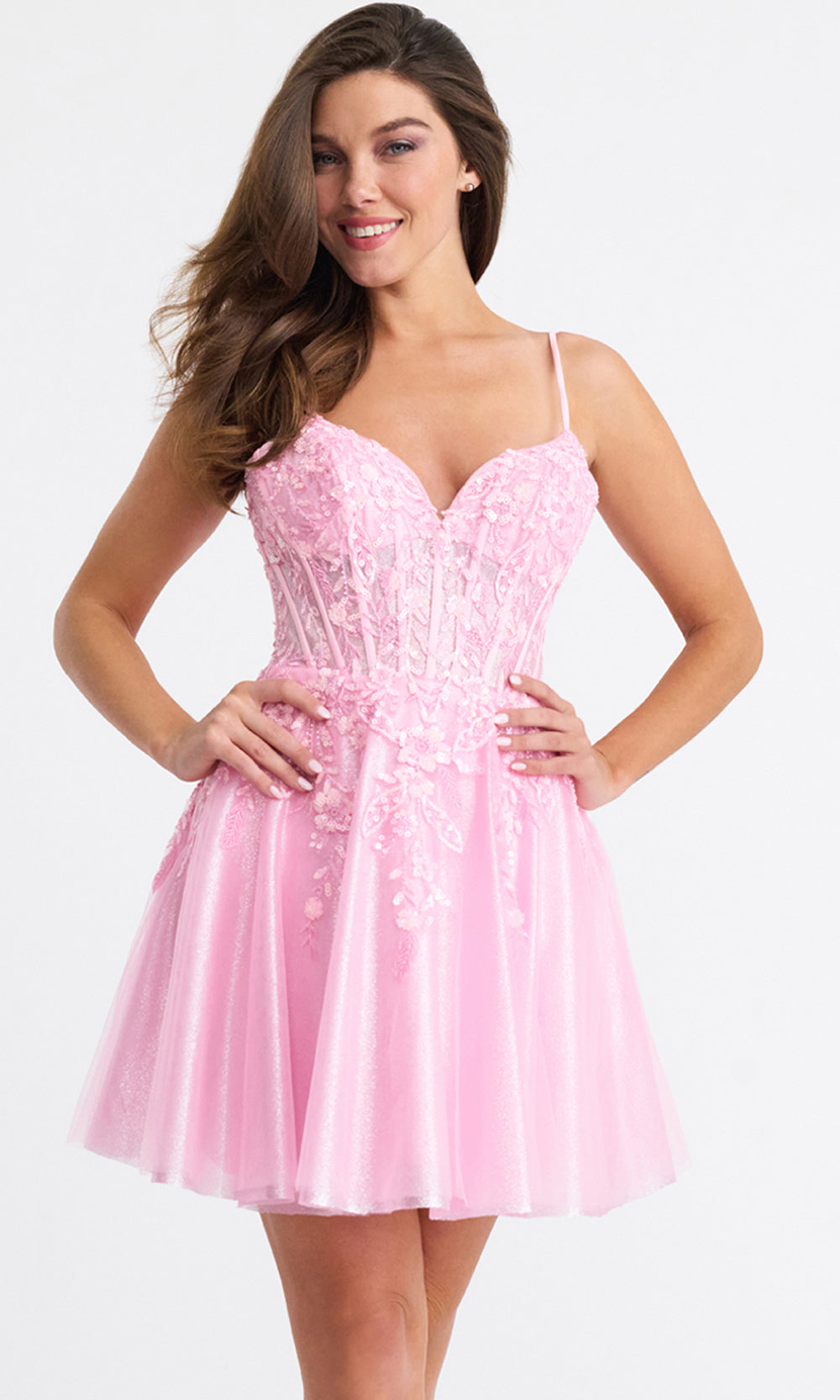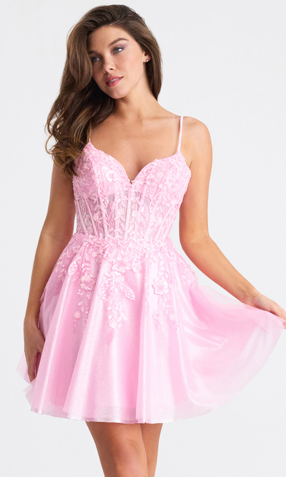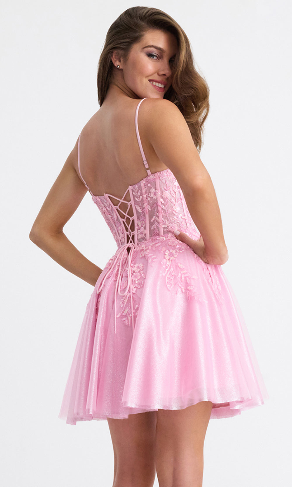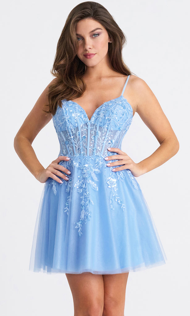Soft layers and a romantic silhouette make Faviana 11305 style the perfect expression of dreamy elegance. With floral embroidery and sparkling sequins, the illusion corset bodice offers a perfect mix of femininity and structure. Spaghetti straps lead into a defined sweetheart neckline, enhancing the collarbone and shoulders. The short A-line skirt creates gentle volume and movement, offering a light and ethereal finish to the fitted top. Faviana 11305 dress is an ideal choice for formal occasions where feminine detail and whimsical charm come together in perfect harmony. Models are wearing Light Blue, and Cotton Candy Pink colors.