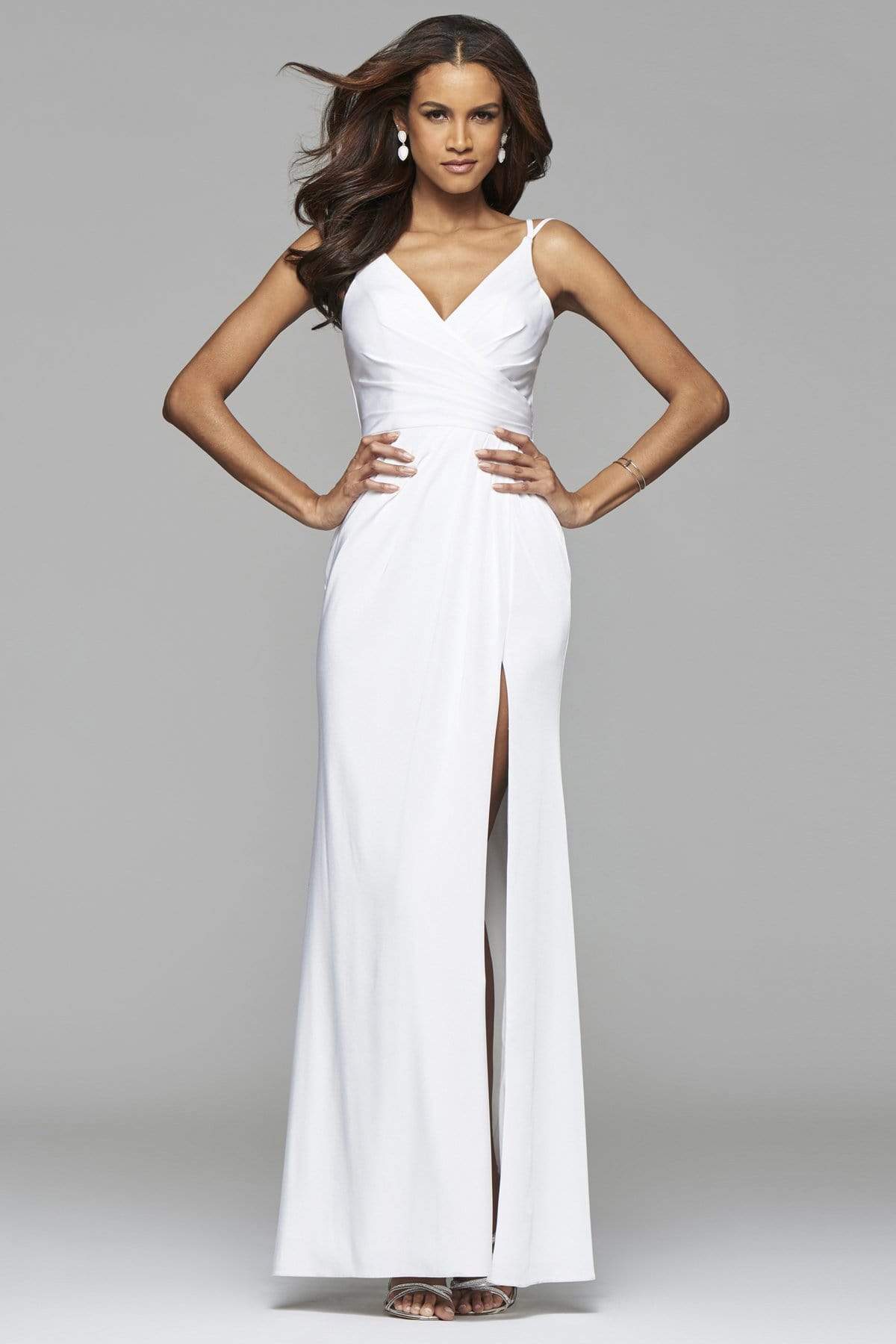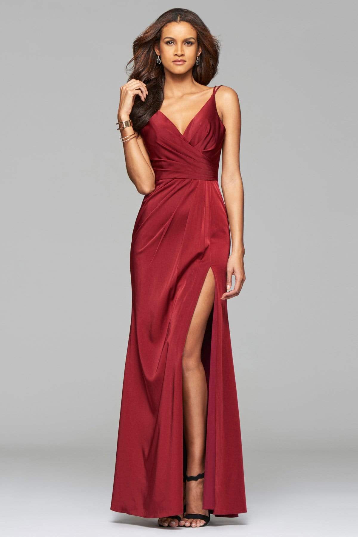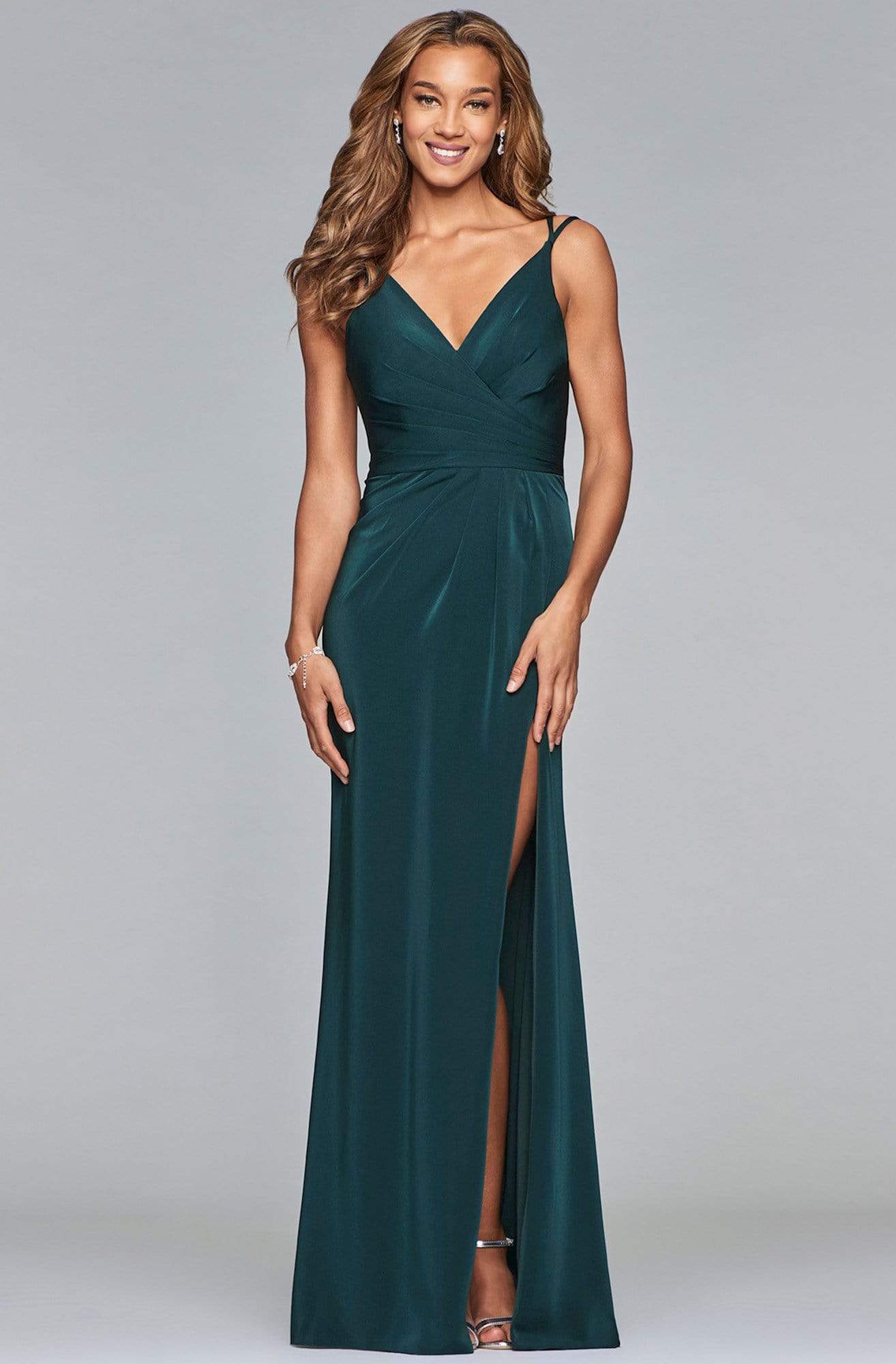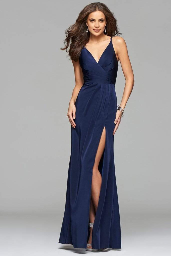 Claim that look of sophistication wearing this classy and gorgeous evening gown by Faviana 7755. This faille satin dress features a sleeveless V-neck, faux surplice style bodice with asymmetrical pleats. The long skirt begins from the natural waist with fine pleats and reveals a thigh-high slit for a peek of those sexy legs. Fine ruching at the back defines a more flattering figure as it reveals a mid-open style held by double spaghetti shoulder straps. Stand out among the fashion stars as you twirl and dance all night long in this Faviana masterpiece.