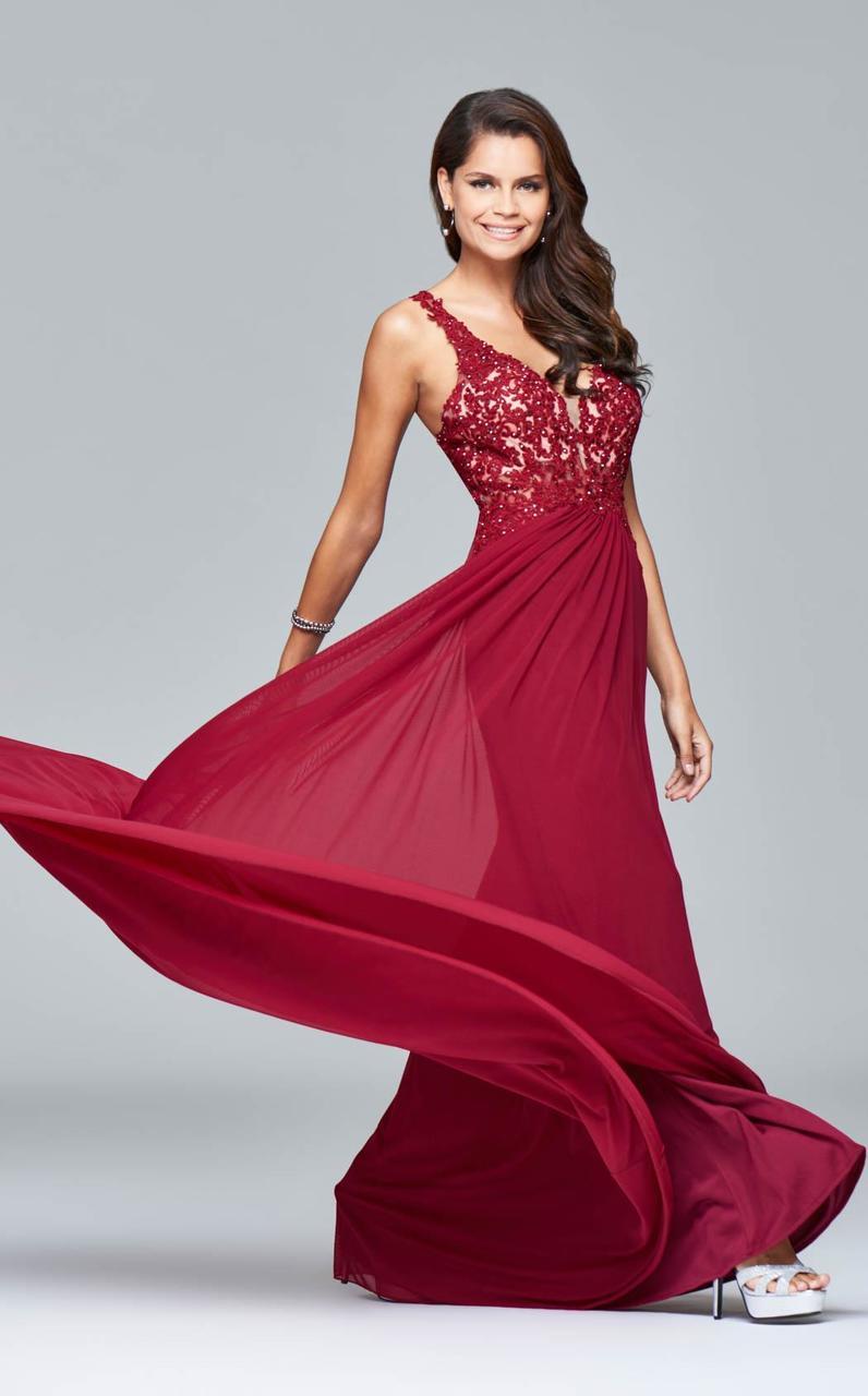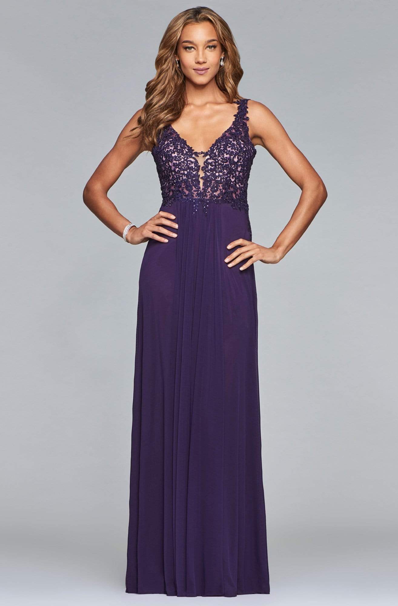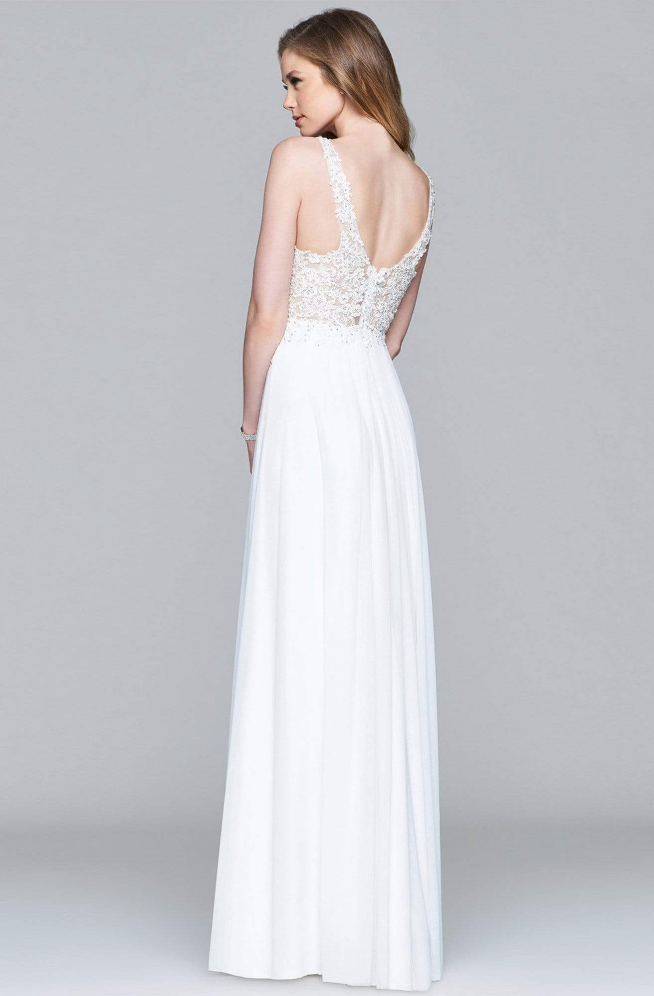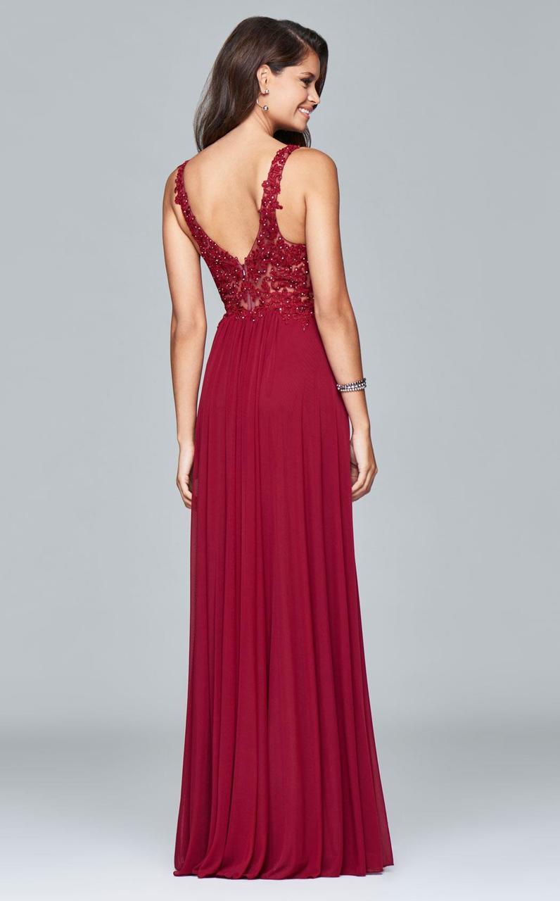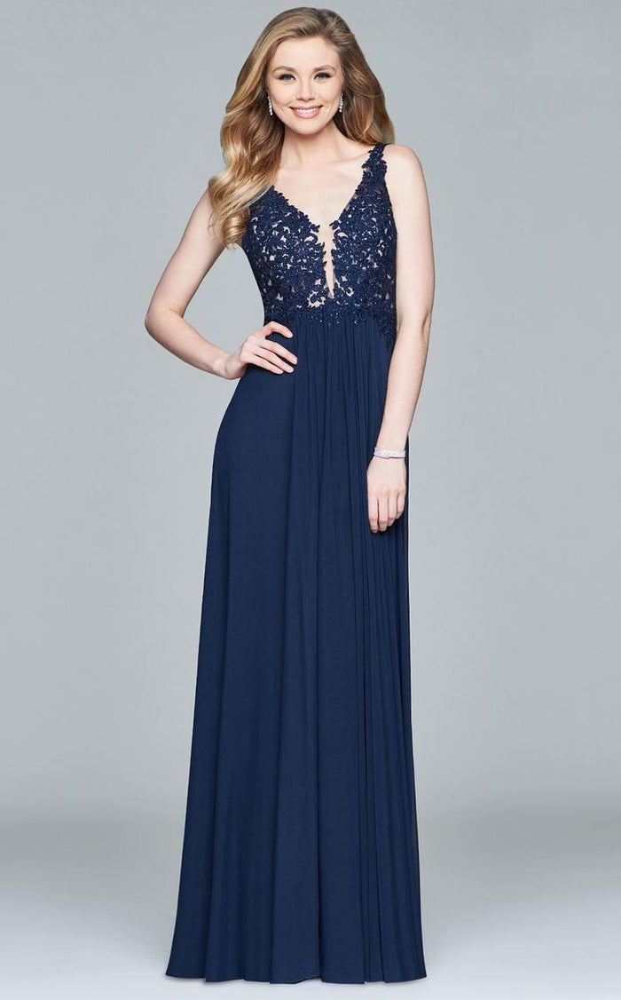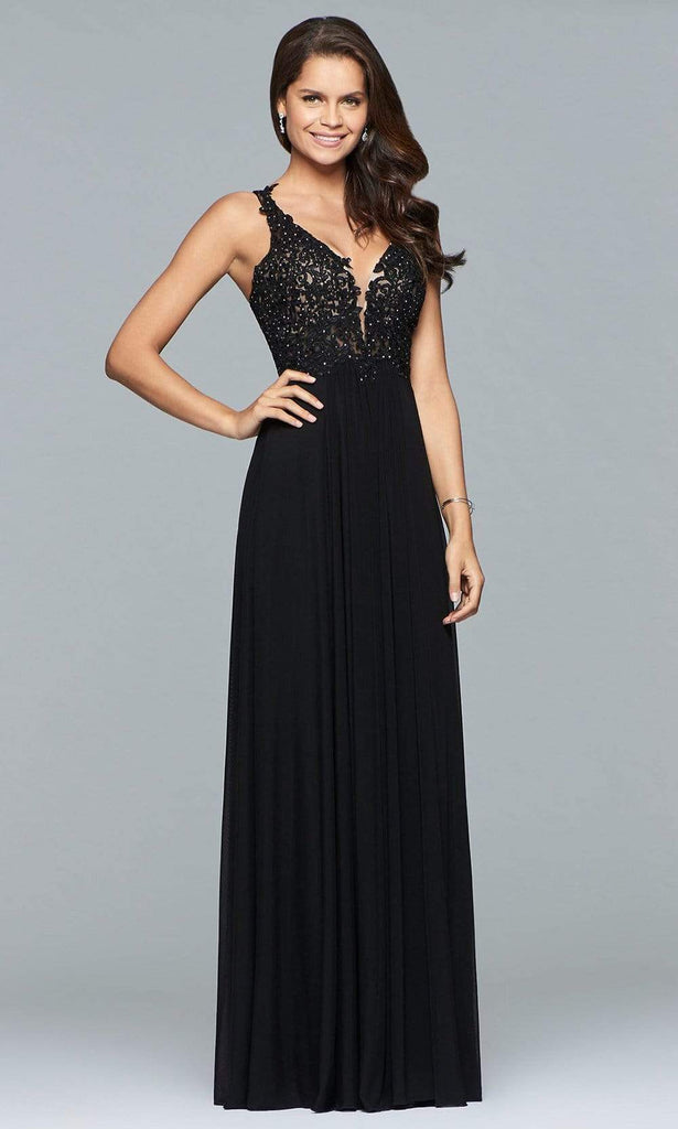 Walk into the room as you radiate sophistication in this Faviana style 8000 show stopper. Detailed with gorgeous lace applique on a nude-lined sleeveless bodice, this chic piece shows a plunging v-neckline with a shrouding illusion inset. Captivatingly carved with a deep v-cut back, the A-line skirt is styled with amesh fabric that flutters fabulously down to a full-length hem and a sweep train. Dance fabulously in full splendor in this perfectly exquisite Faviana masterpiece.