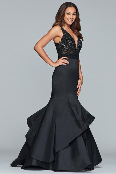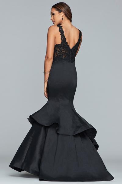 This sleeveless V-neck dress flatters your figure with its sheer fitted bodice adorned with beading. The back is styled with a V-cut and a zipper closure while the jersey skirt flaunts a curve-hugging tiered mermaid skirt with sweep train. Model is wearing Black color.