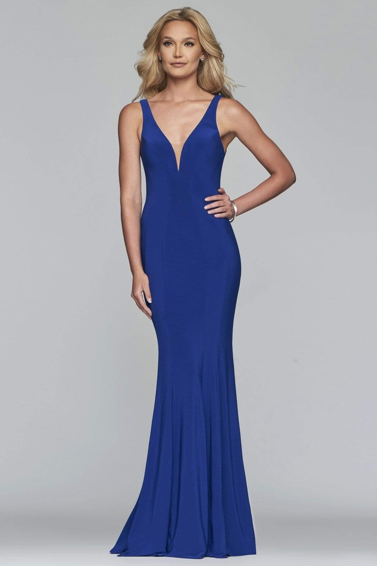 Brandishes in a sleeveless, deep V-neckline with fitted bodice detailed with double princess seams. The back has a V-cut with a zipper closure while the skirt fits at the thighs and flares at the bottom to a sweep train finish.