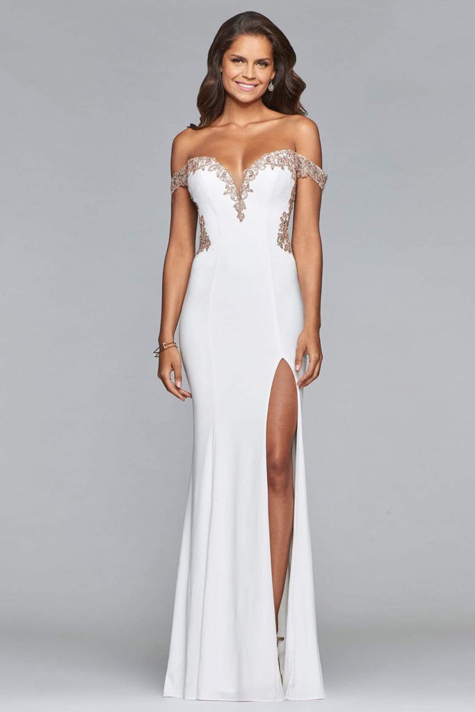 Show off your trendsetting style with this dress by Faviana S10001. This long jersey gown is off-shoulder with a fitted bodice. The straps and neckline are embellished with beaded lace appliques that