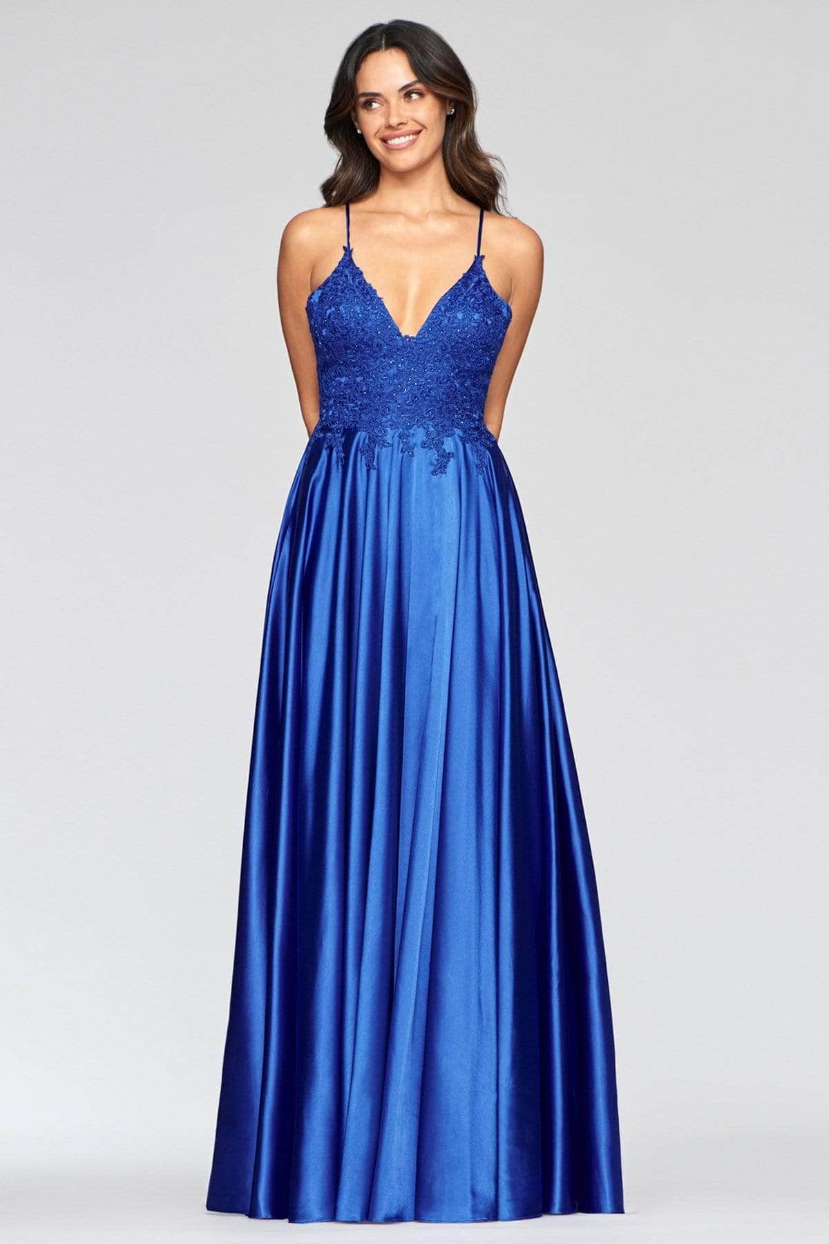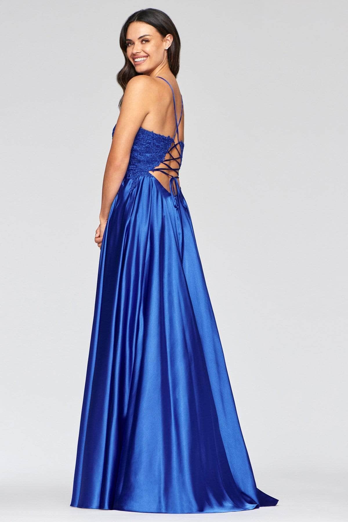 Enchant all with your elegance in the captivating Faviana S10400 ensemble. This mesmerizing dress features a sleeveless, beaded lace-adorned bodice, beautifully framing a V-neckline and delicate spaghetti straps. The back is embellished with a charming lace-up closure, while the vibrant satin skirt flows into a grand A-line silhouette, accentuated by a daring thigh-high front slit. Embrace your regal appearance at this year's Prom in the enchanting Faviana S10400 creation. Models are pictured wearing the colors: Royal, Deep Green, Deep Mauve, and Red.