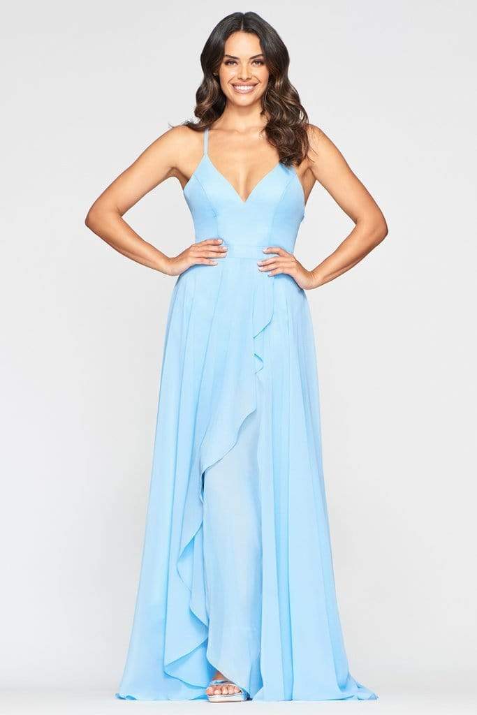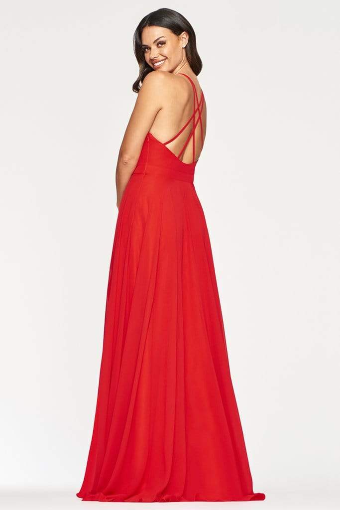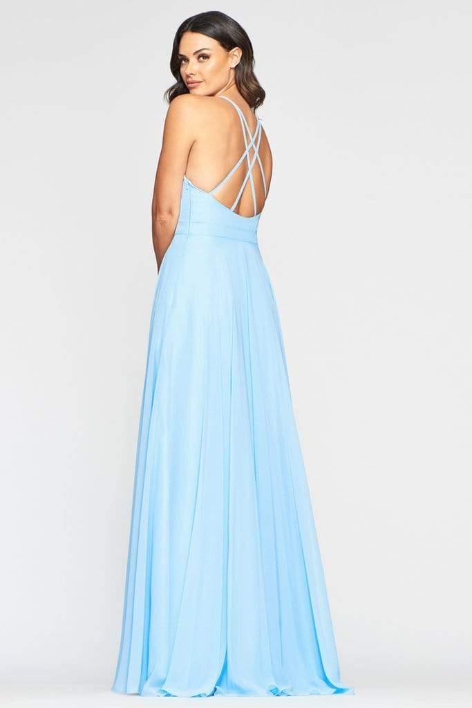 Make a statement with this design by Faviana S10413. This chiffon dress features a sleeveless, plunging V-neckline with thin straps supporting the fitted bodice. It has a strappy back and from the waist flourishes a full-length A-line skirt with a slit and a train finish. This Faviana is sure to be both comfy and fashionable.