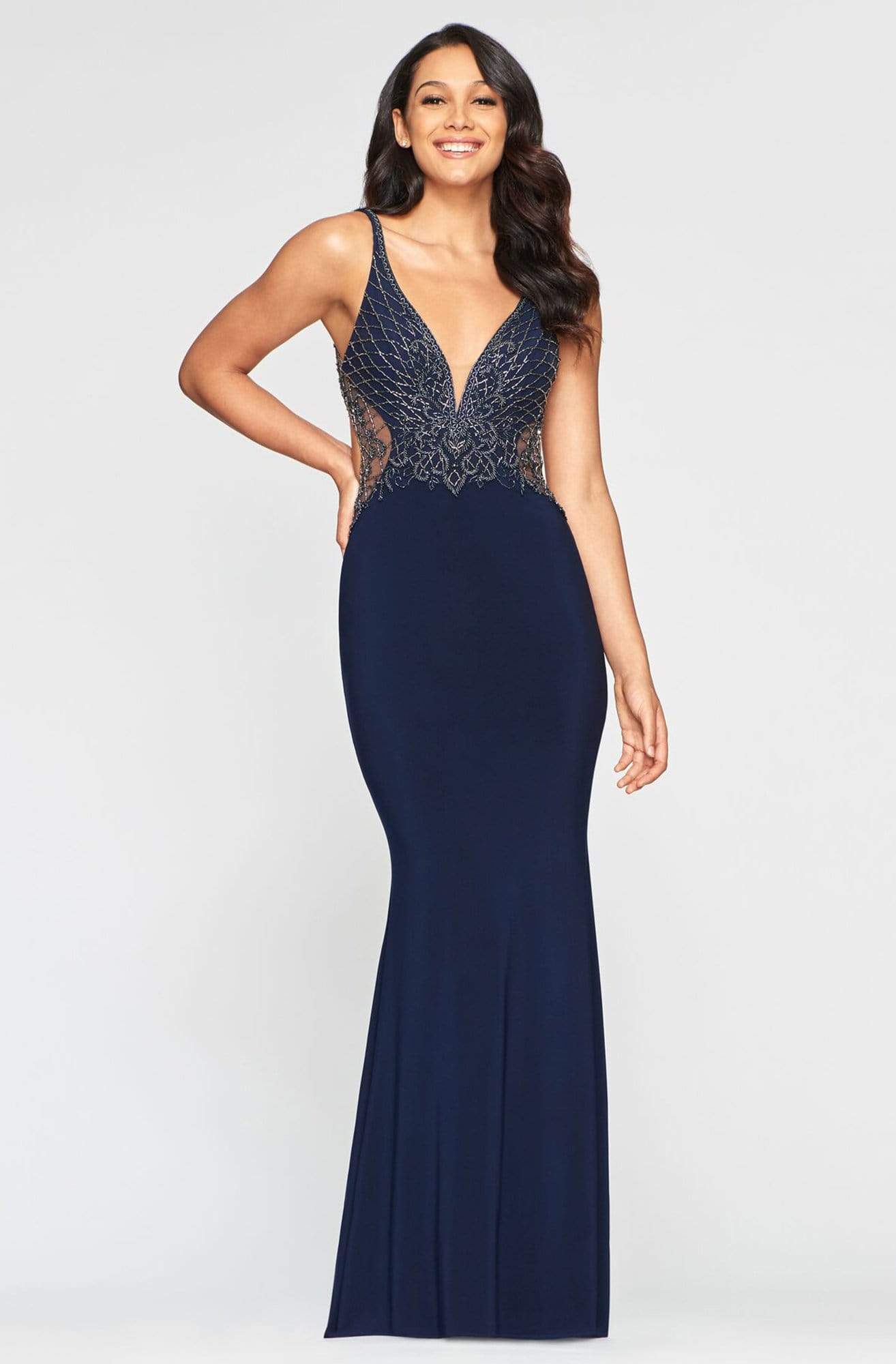 Infuse your special event with stellar style in this Faviana S10470. Walk in regal beauty in this form fitting dress that features plunging v-neckline and sheer paneling. Bodice is fitted and embellished with patterned detailing of bugle beads. The skirt parades a long sheath silhouette that is perfectly matched with sweep train. This gorgeous dress by Faviana is charming and versatile, perfect for red carpet events, social galas, destination weddings and prom. Model is wearing Navy color.