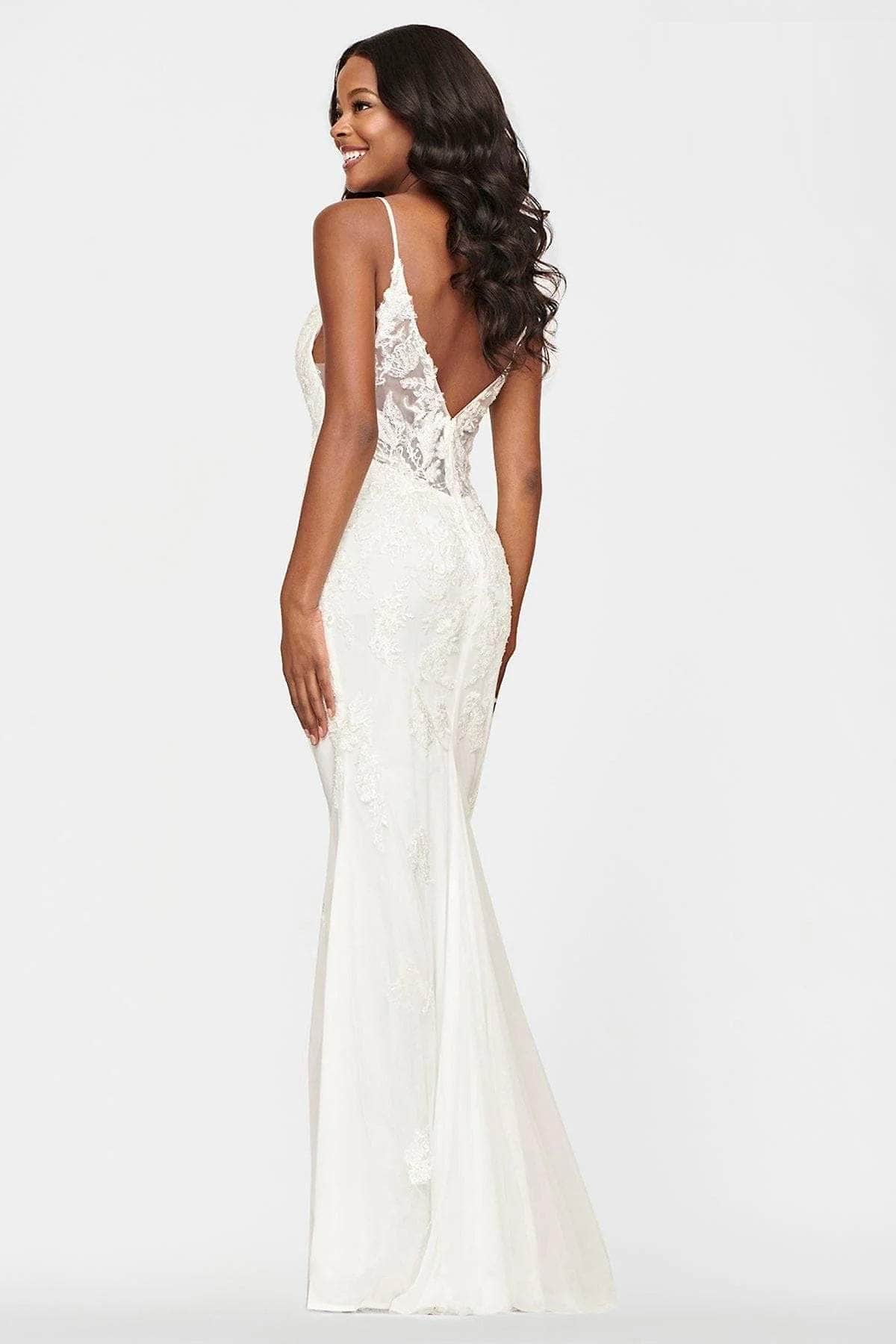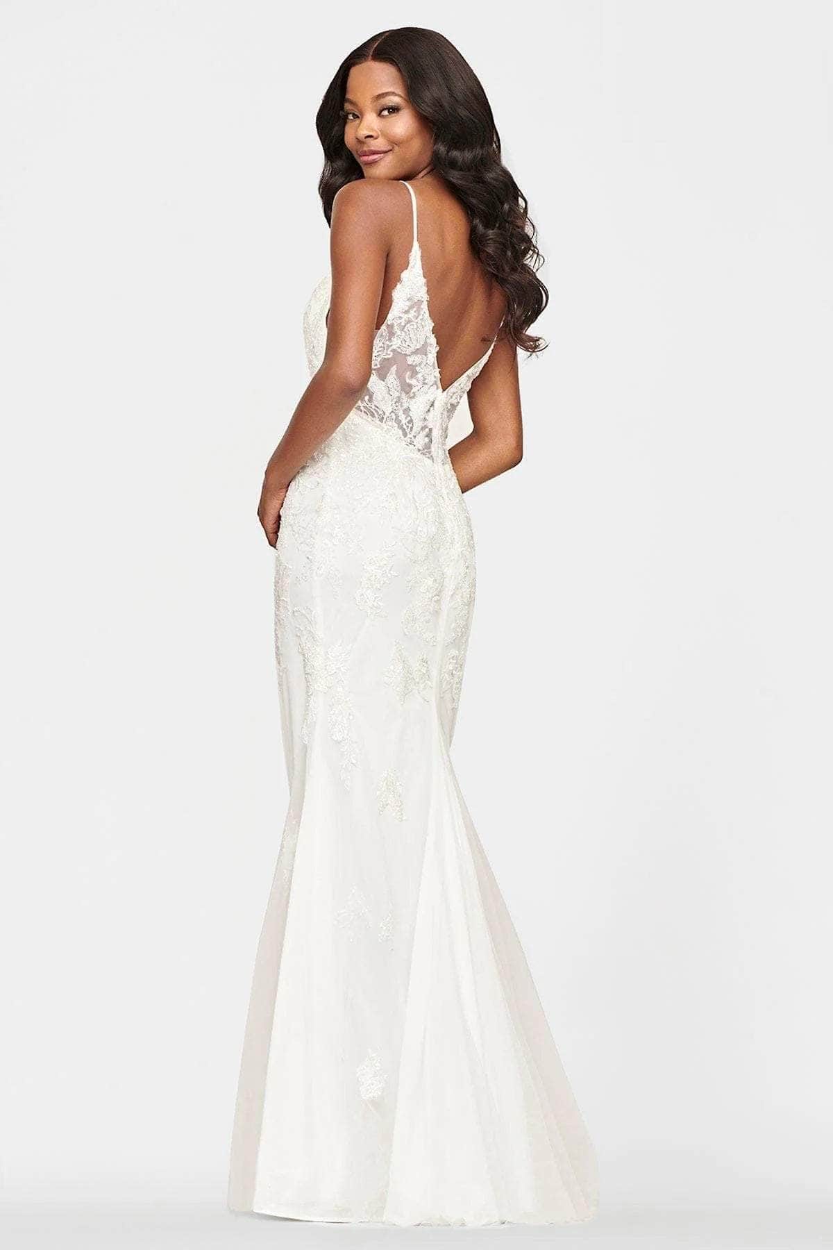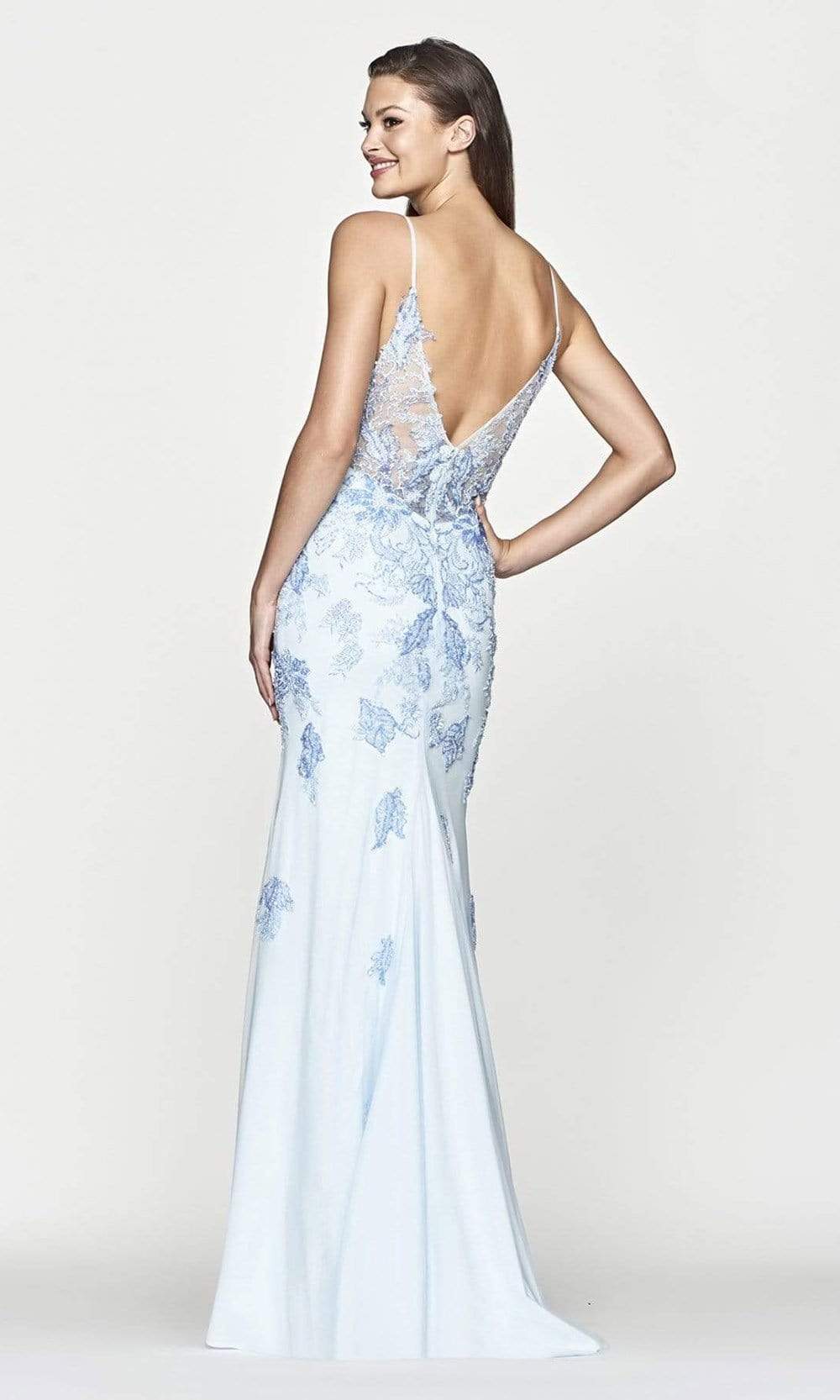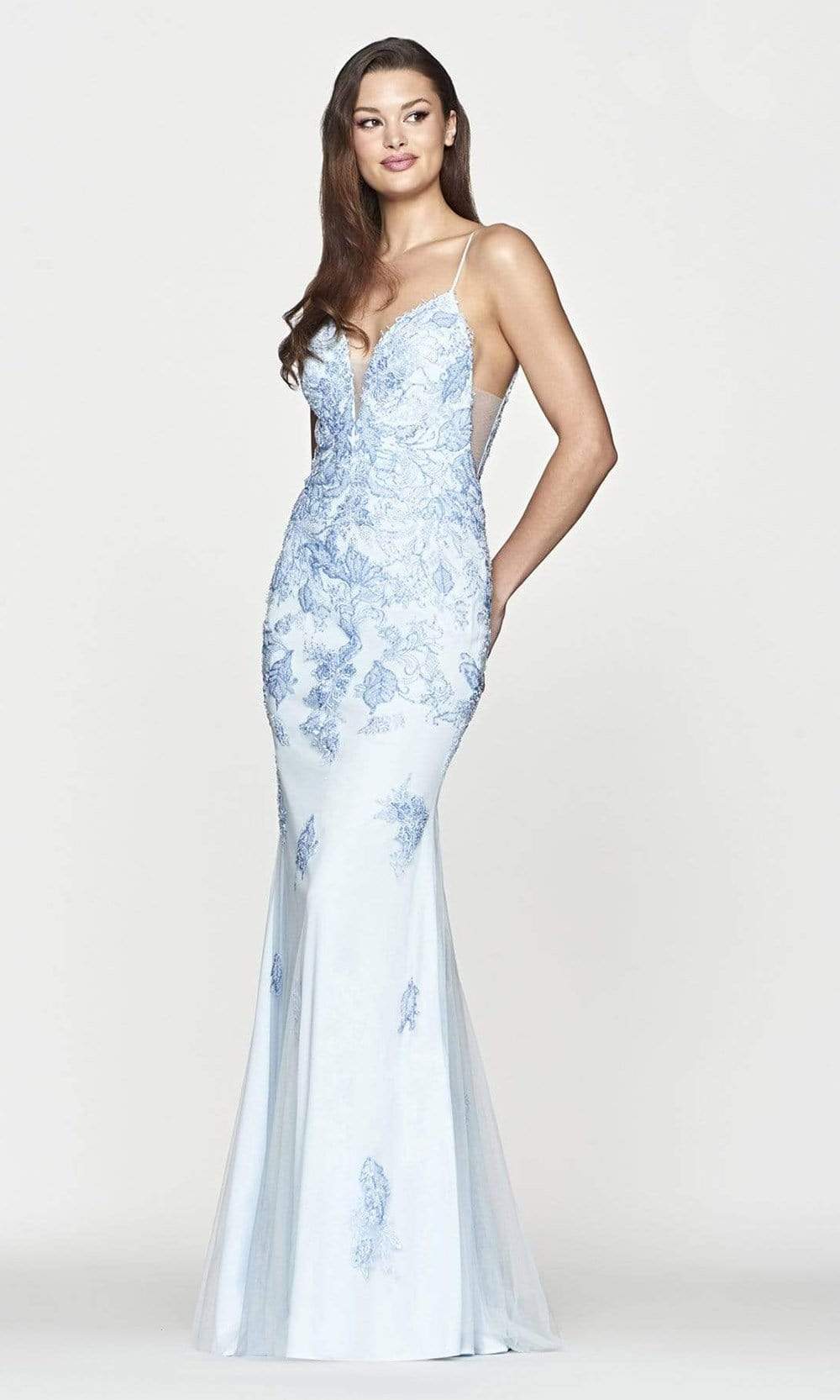 Make magic in this fantastic creation from Faviana S10648. Designed with a trailing lace applique spectacle, this ensemble features an illusion bodice framed with sleeveless and low V neckline. A sheer panel adds an elegant effect to the fitted dress, while the back highlights a V-shaped cut and is secured by a zipper closure. The trumpet skirt runs at full length hemline. Skirt length is 48 inches. Embrace a style that is immaculately sultry as you glam up for your event in this Faviana evening dress. Models are wearing the Ivory, and Light Blue colors.