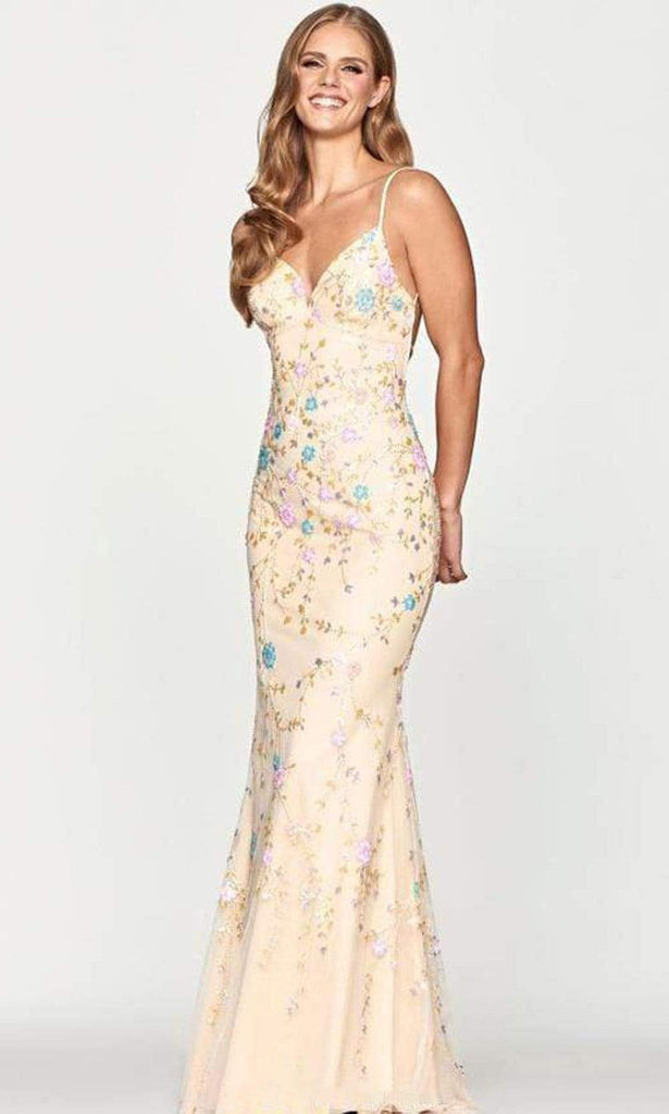 Bloom with loveliness in this detailed evening gown from Faviana S10653. Feminine floral beadwork with sequin accents adorn this lovely sheath evening gown. A daring backless bodice shows some skin while the front features wire thin straps and a V-neckline. Be the ultimate belle of the party in this gorgeous Faviana masterpiece. Skirt length is 48 inches.