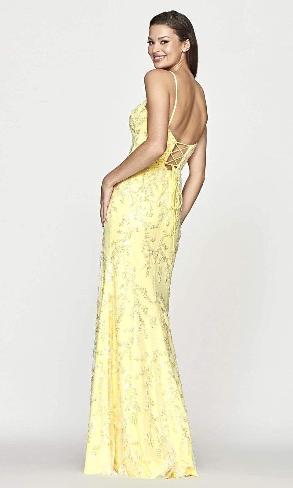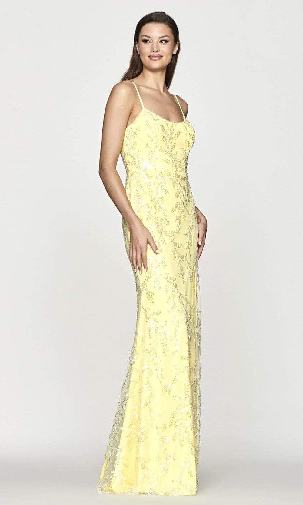 Every detail of this Faviana S10682 is dripping with faultless charm! Lovely in a sheath silhouette, this full length gown is adorned with exquisite beadwork and translucent sequins forming branchlike patterns throughout the dress. The bodice is sweet and delicate in a scooped neckline and spaghetti straps, contrasting with a daring front slit. Get noticed in this radiant evening gown from Faviana. Model is wearing Light Yellow color. Skirt length is 48 inches.