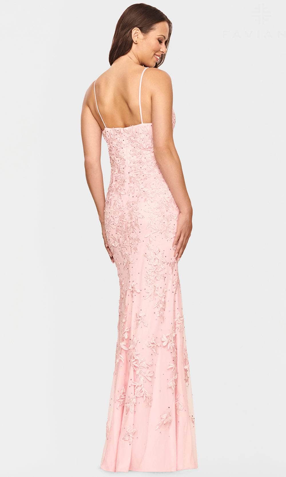 Flatter your figure with this eccentric evening dress by Faviana S10812 creation. Get glamorous as you enthrall wearing this piece that is fully embroidered with lace details and heat stones embellishments. This garment has a sleeveless V-neckline with spaghetti straps, while the sheath skirt has a front slit and ends in a floor-length hemline. You are sure to be the life of the party when you are wearing this dazzling evening dress by Faviana S10812 creation. The model is wearing a Light Pink color.