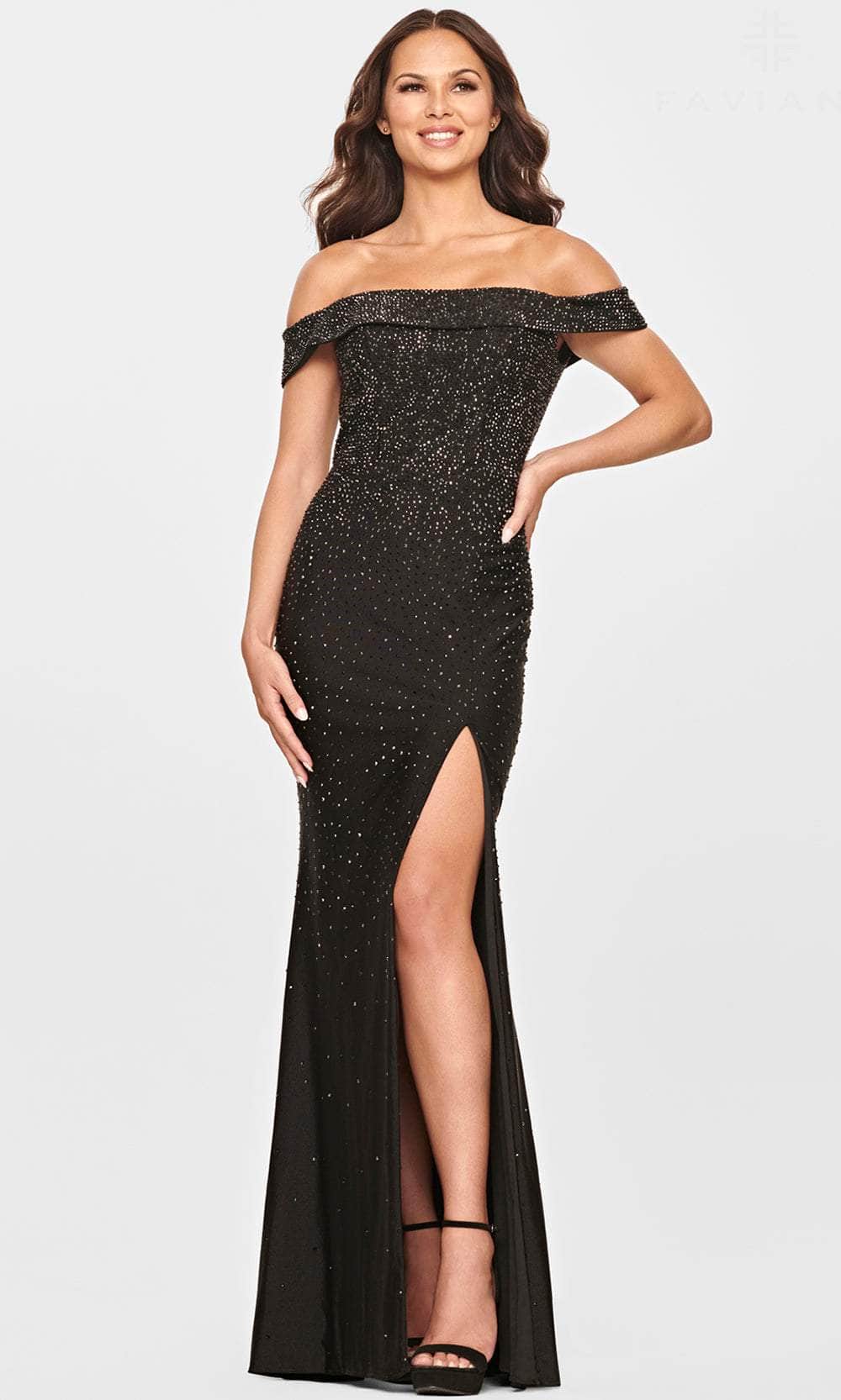 Get ready for another amazing evening dress that will have everyone talking at Prom! Designed by Faviana S10850. Beads are sparkling back into style on this dress that features an off-shoulder neckline with beads and heat stones embellishments. The stunning sheath skirt has a front slit and is closed with a back zipper, hook, and eye clasp. You will be the envy of the night in this amazing long evening dress with striking details by Faviana S10850. The model is wearing Black color.