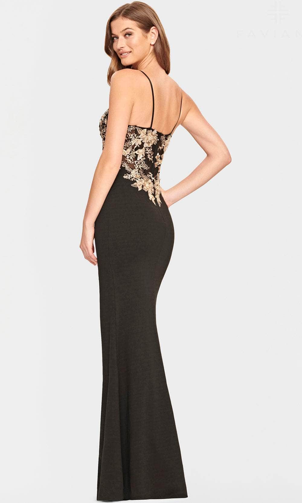 Own that look of sophistication wearing this glamorous special evening gown by Faviana S10853. The gown showcases a corset inspired bodice, partially sheer, ornate with shimmering floral applique, and has a V neckline, spaghetti straps and concealed back zipper. The skirt is crafted from knit stretch jersey fabric with an elegant matte finish that smoothly glides through the curve of the hips and opens with a captivating thigh high slit as it completes a full-length hem with a modest mermaid flare. This stunning gown by Faviana S10853 brings together all the essentials for a winning look on that special evening! Model is pictured wearing the Black/Gold color of the dress.